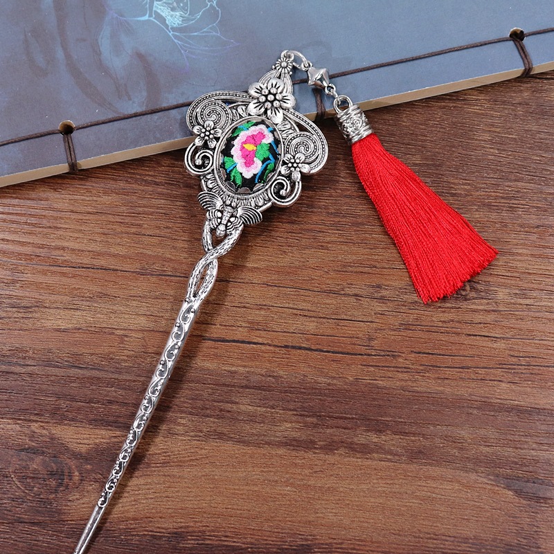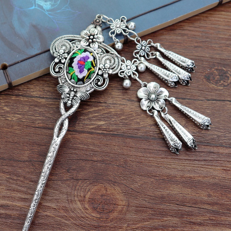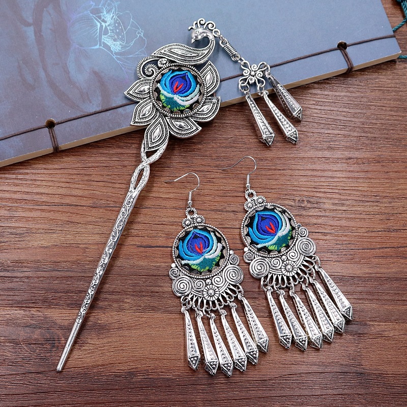 复古民族风刺绣耳环发簪古典气质苗族孔雀花朵流苏耳饰发饰套装女
