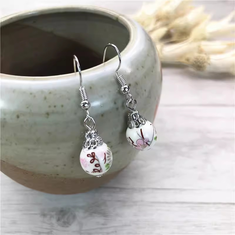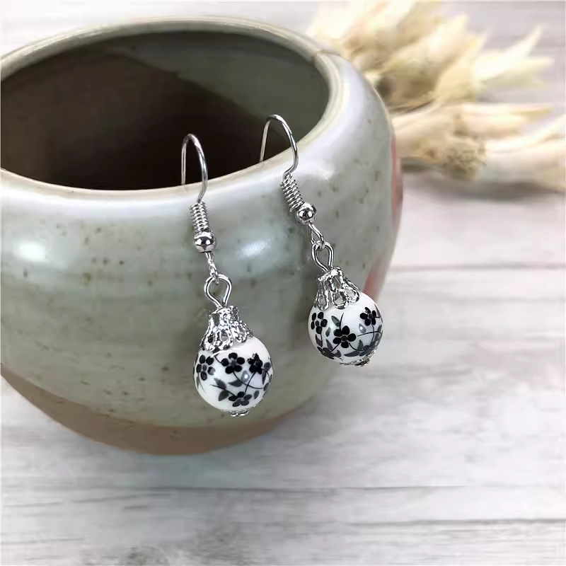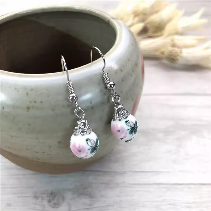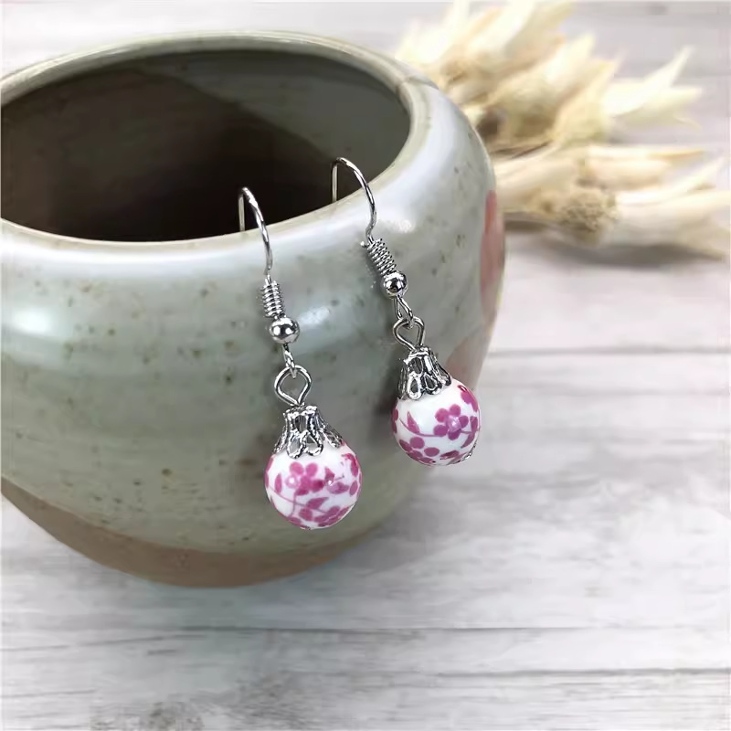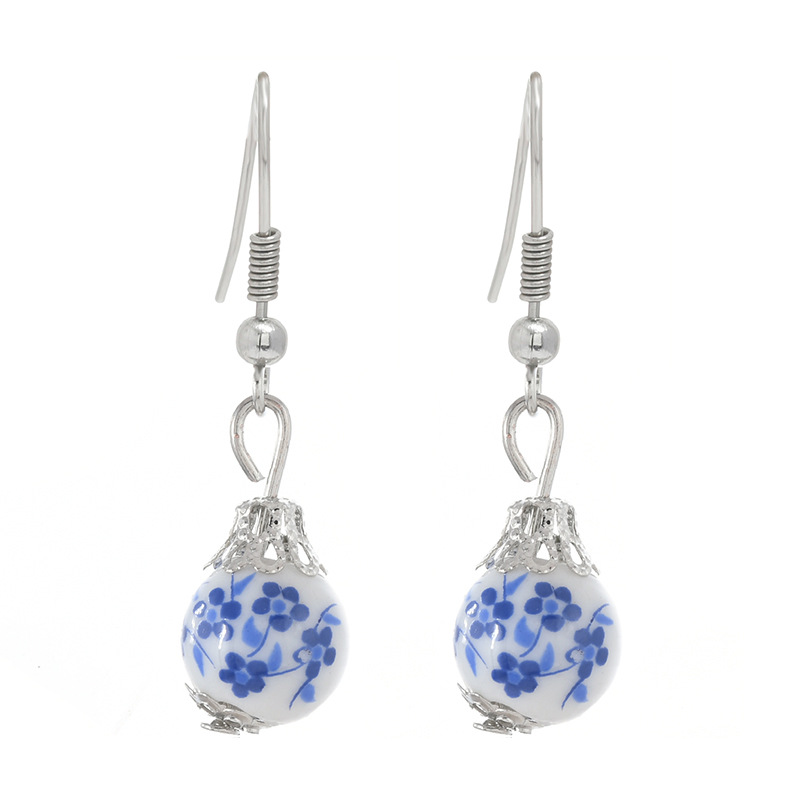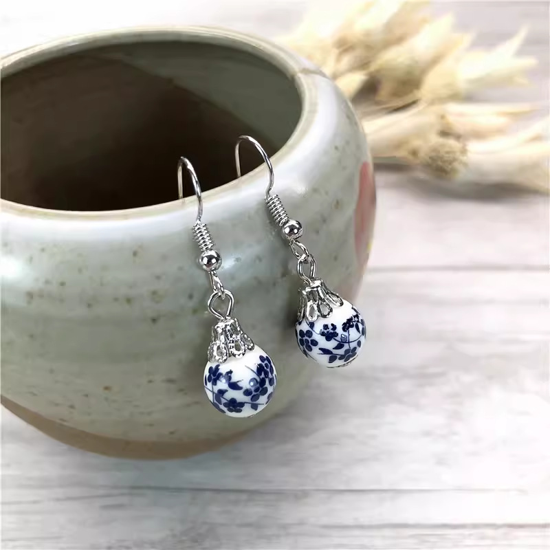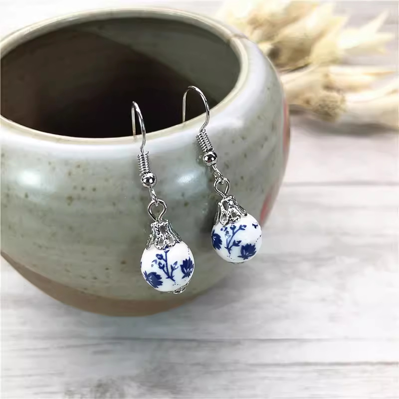 中国风简约陶瓷珠耳环民族风复古青花瓷花朵耳坠女气质百搭耳饰品