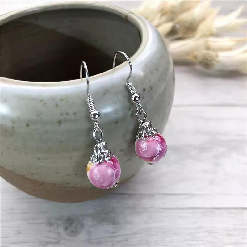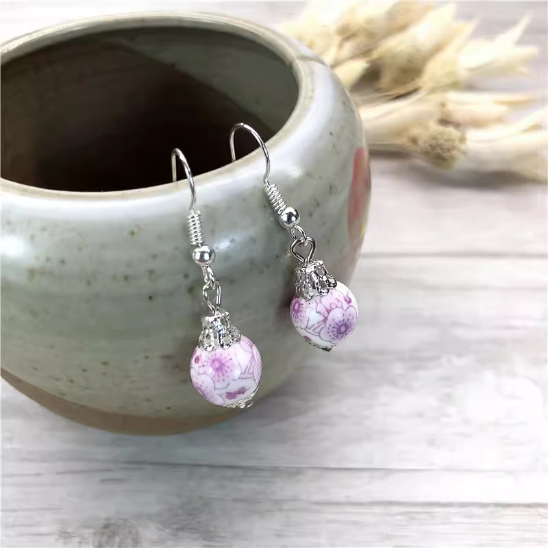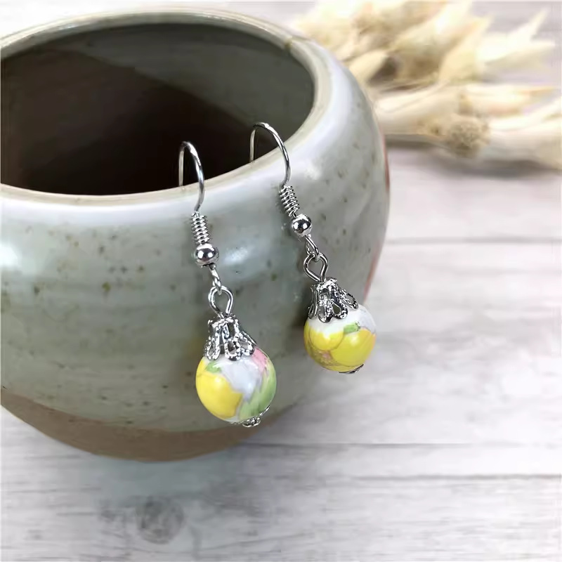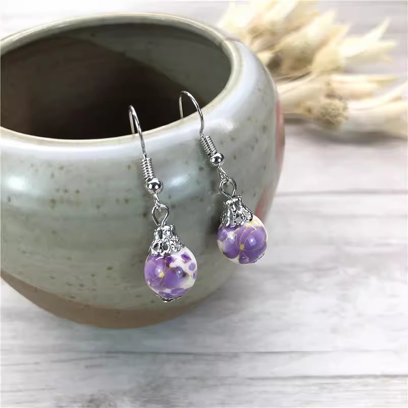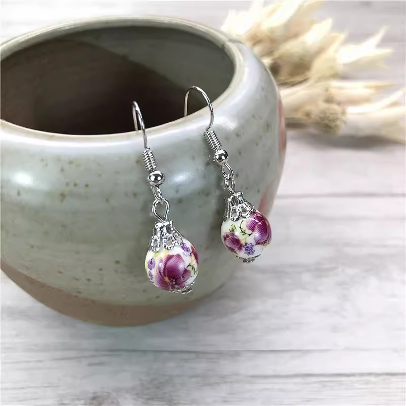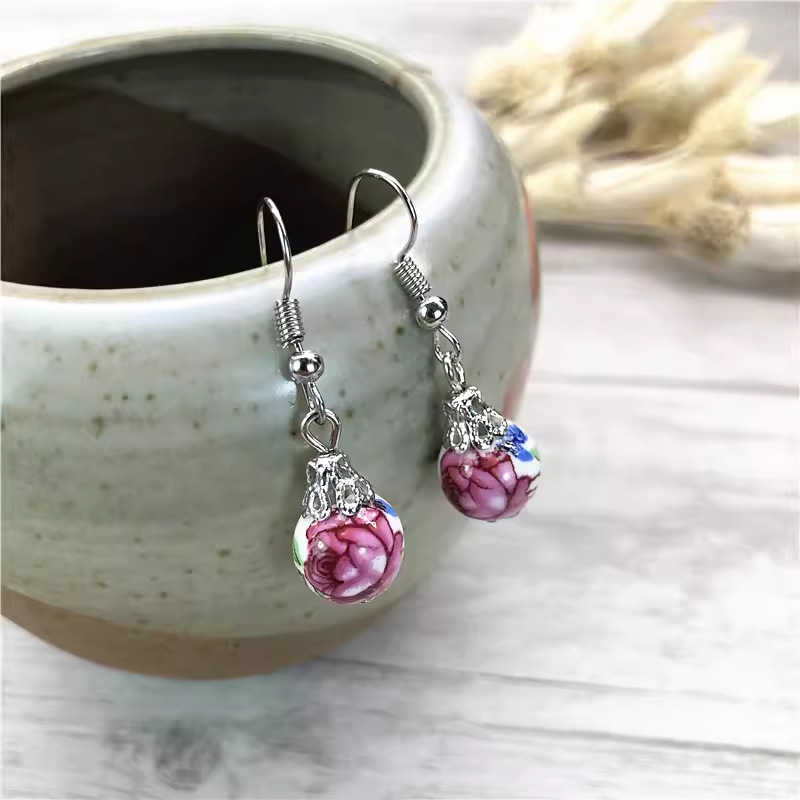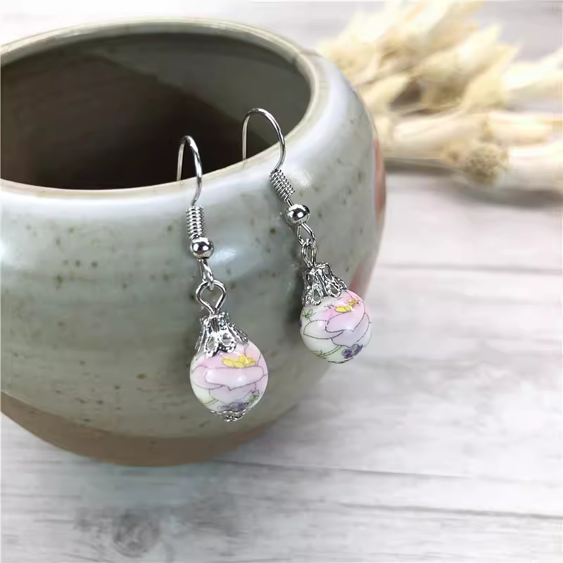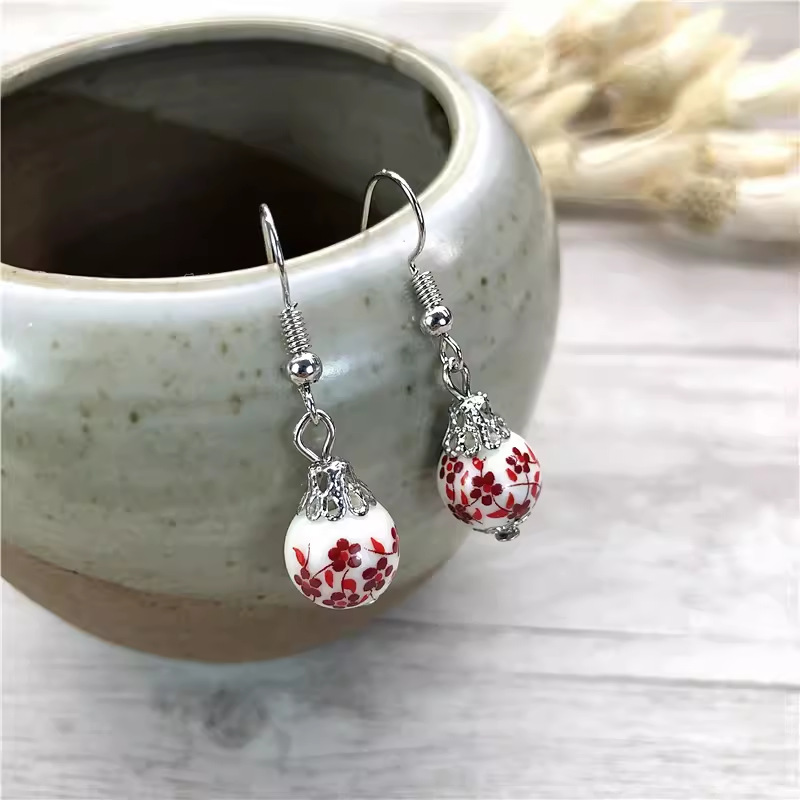 中国风简约陶瓷珠耳环民族风复古青花瓷花朵耳坠女气质百搭耳饰品