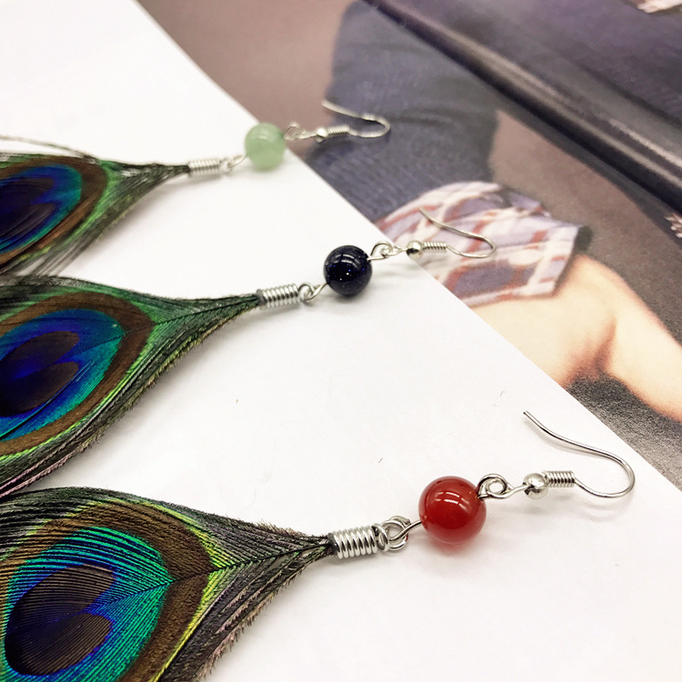 天然孔雀羽毛耳环,搭配天然东陵玉,红玛瑙,蓝砂石。让羽毛栩栩如生,简约款也是经典百搭款哦。