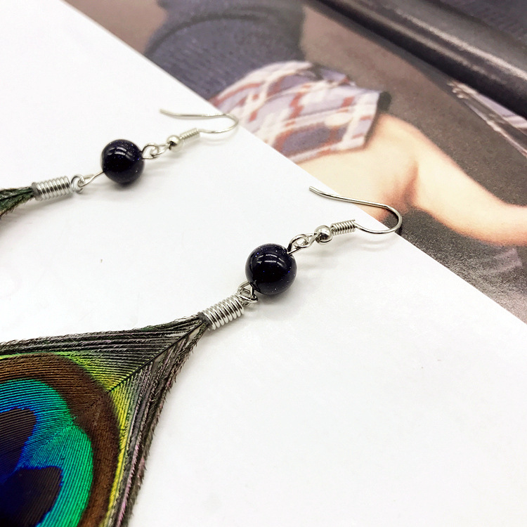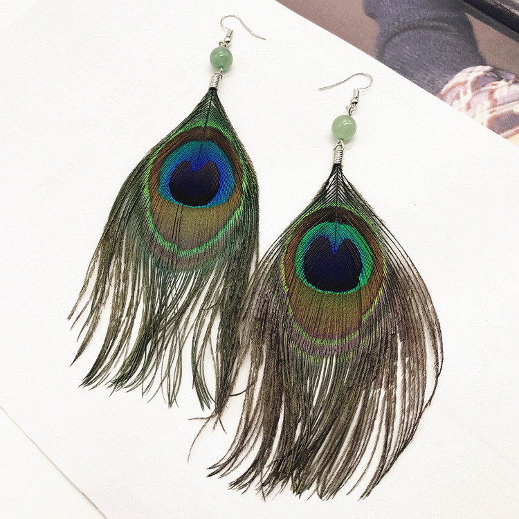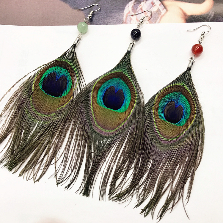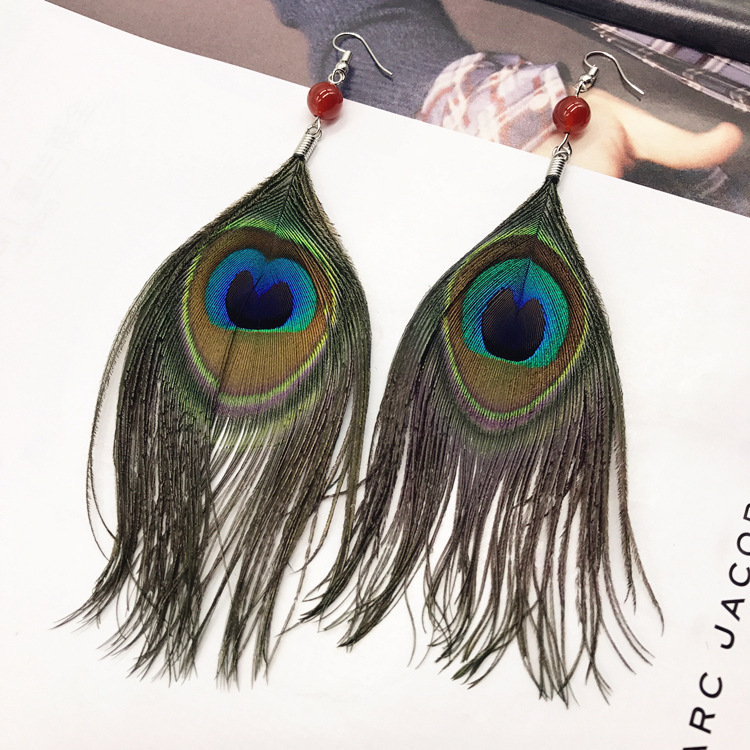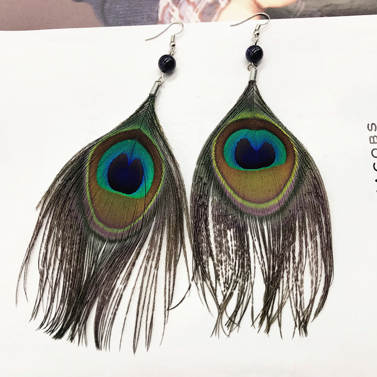波西米亚复古民族风孔雀羽毛长款耳环时尚夸张飘逸流苏女耳坠耳饰