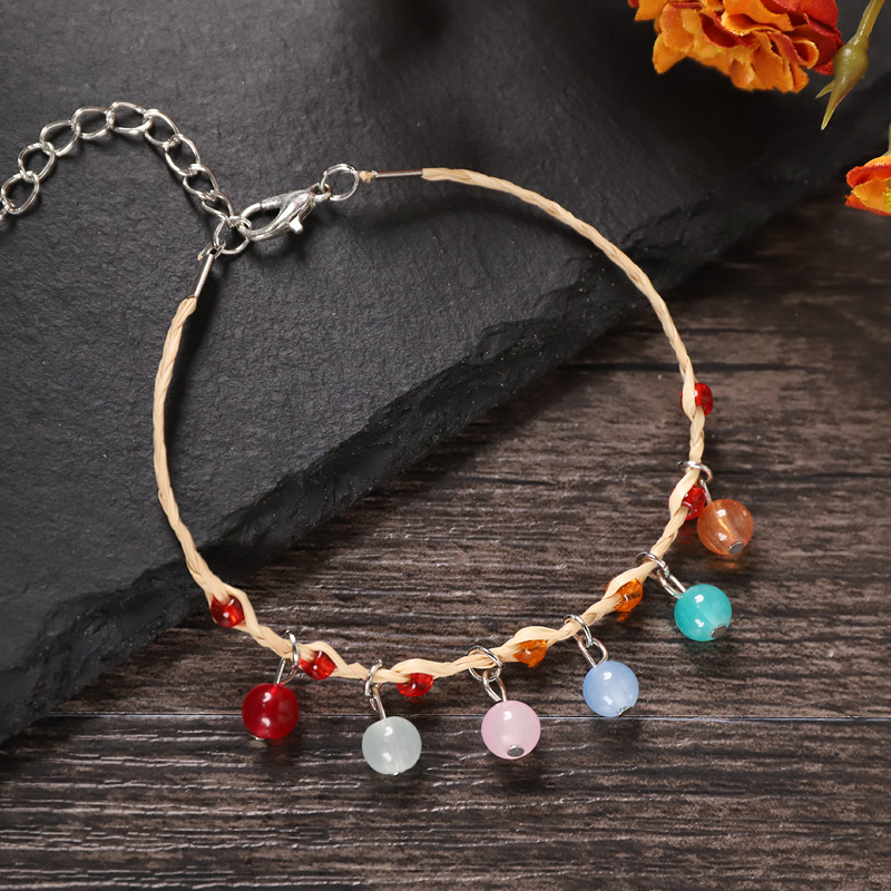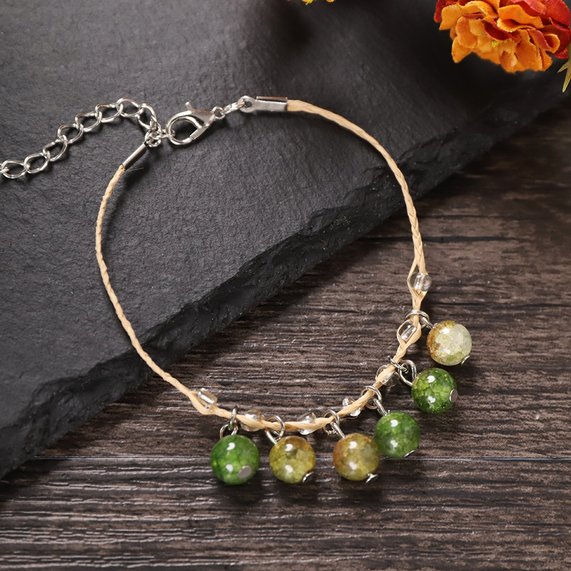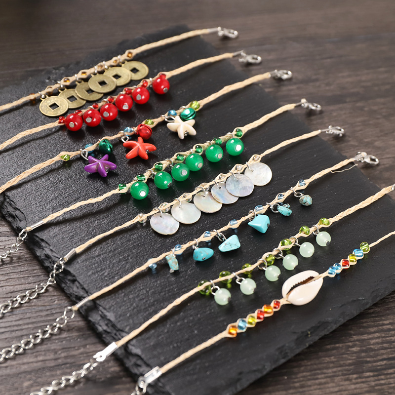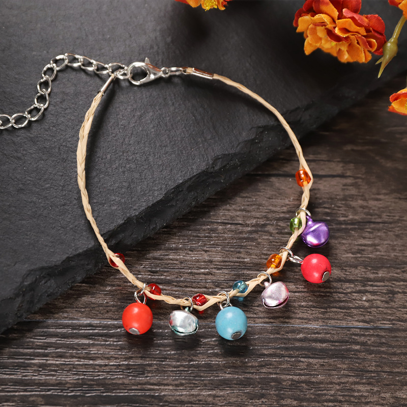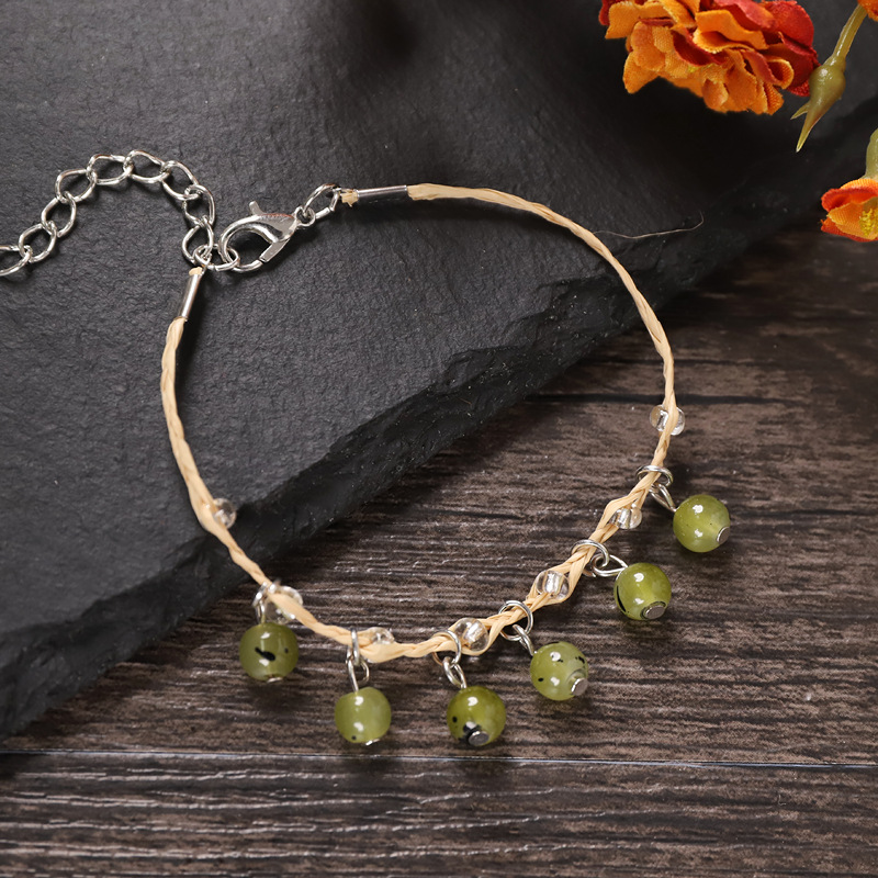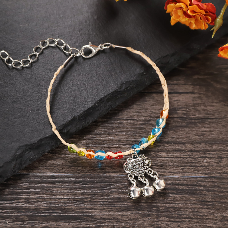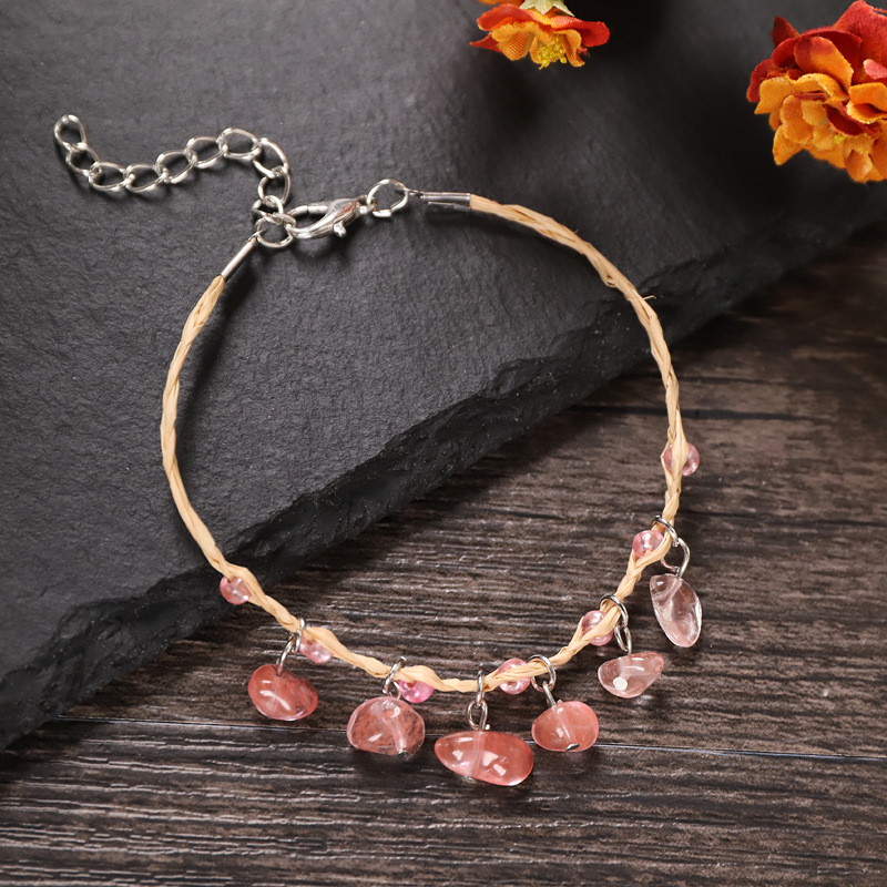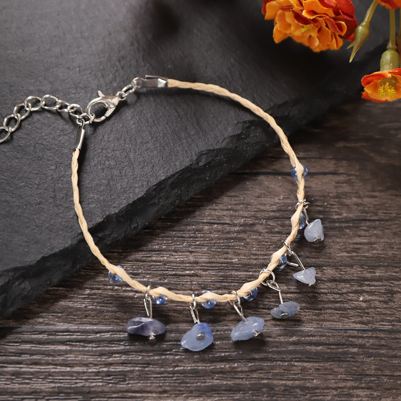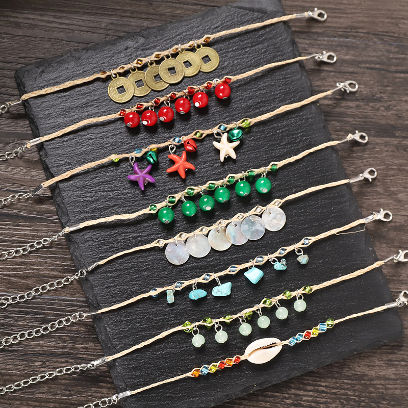复古文艺森系许愿拉菲草手链天然碎石编织铃铛手绳民族风景区饰品