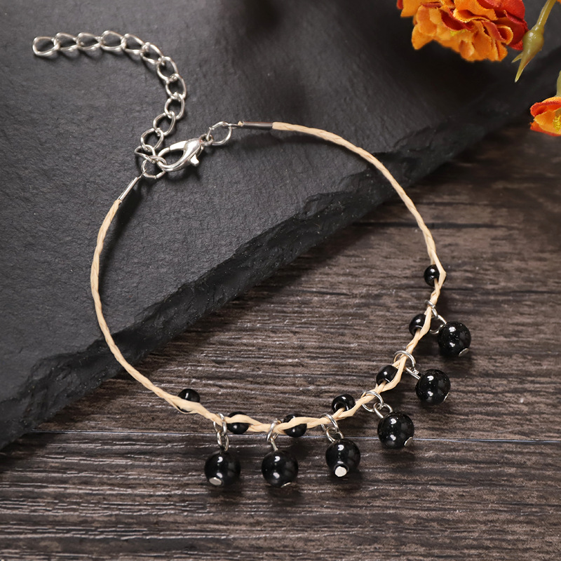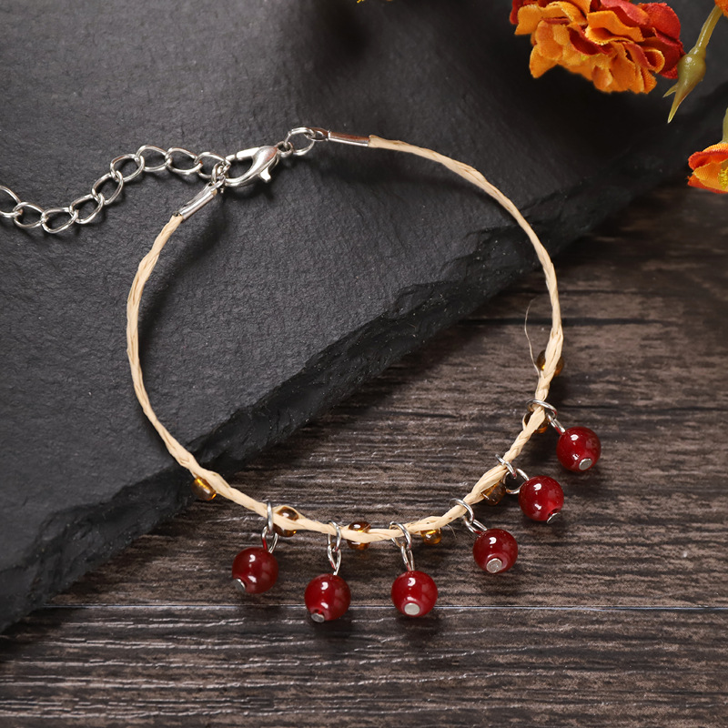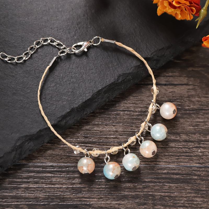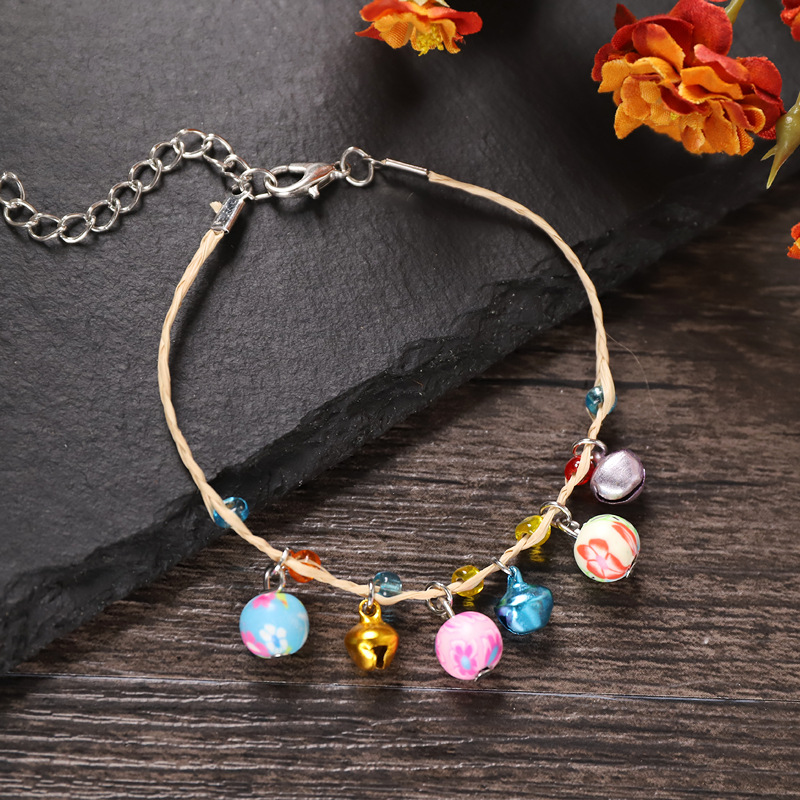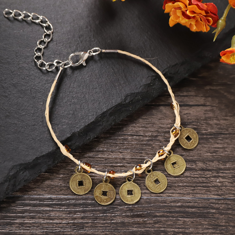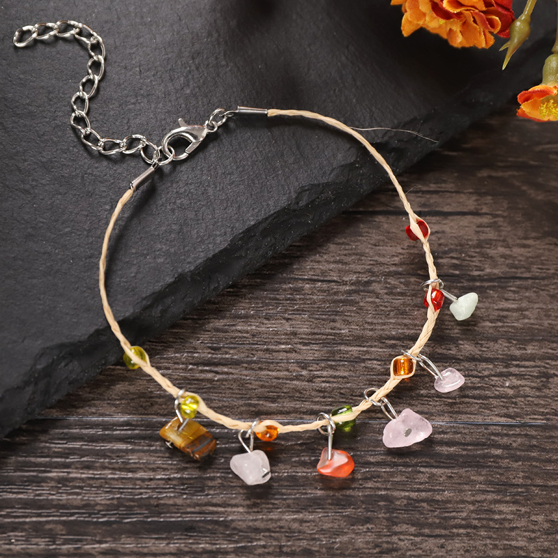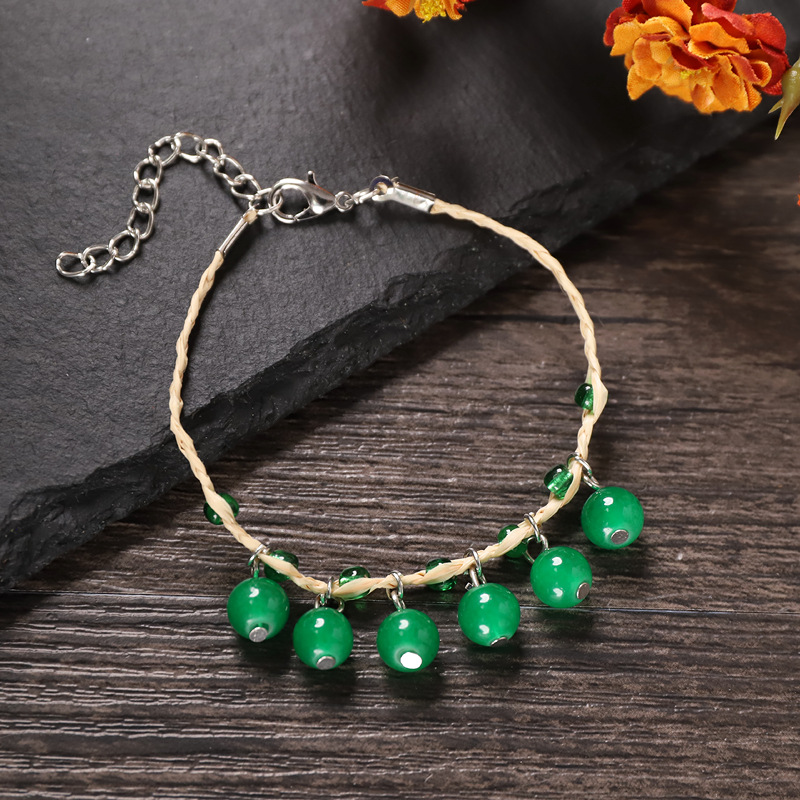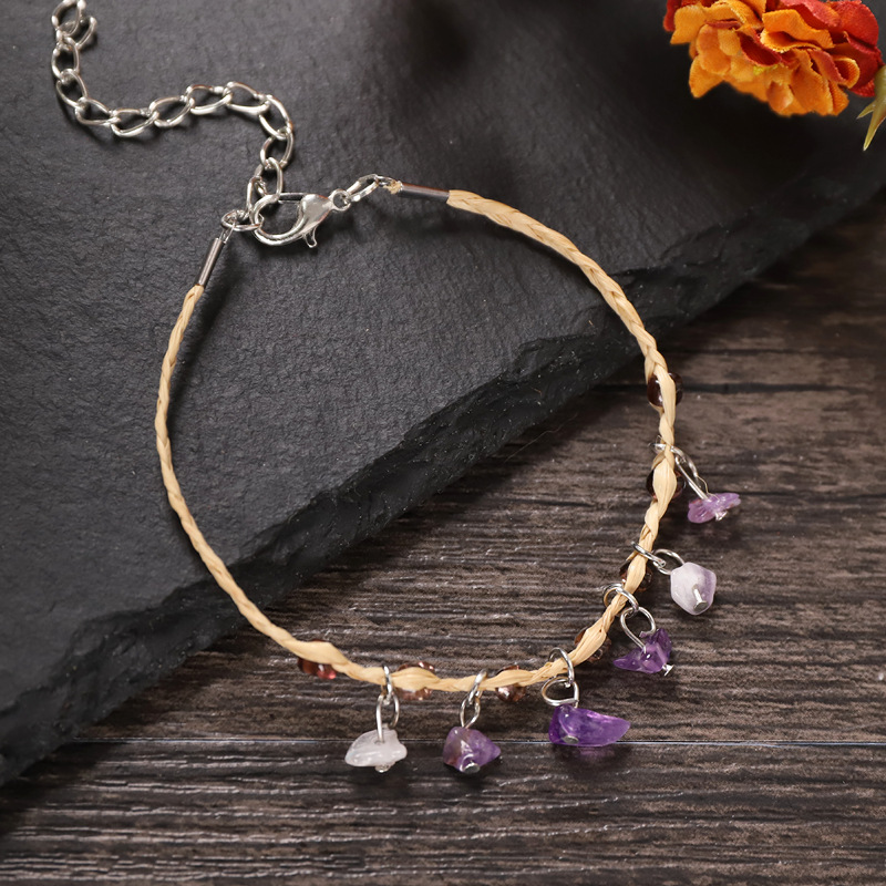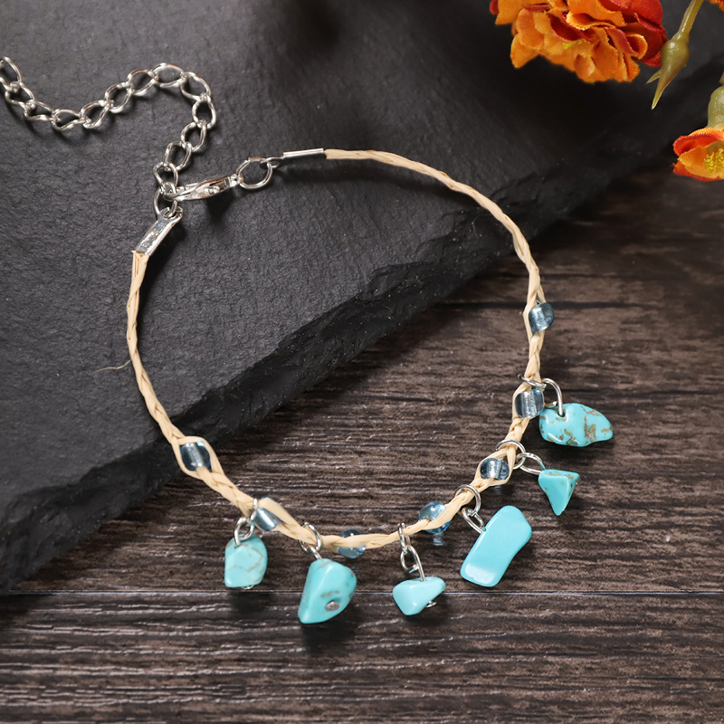 复古文艺森系许愿拉菲草手链天然碎石编织铃铛手绳民族风景区饰品
