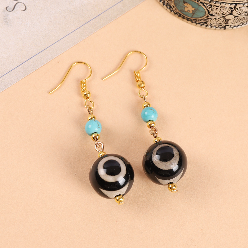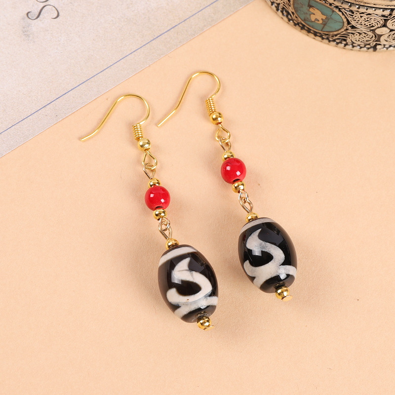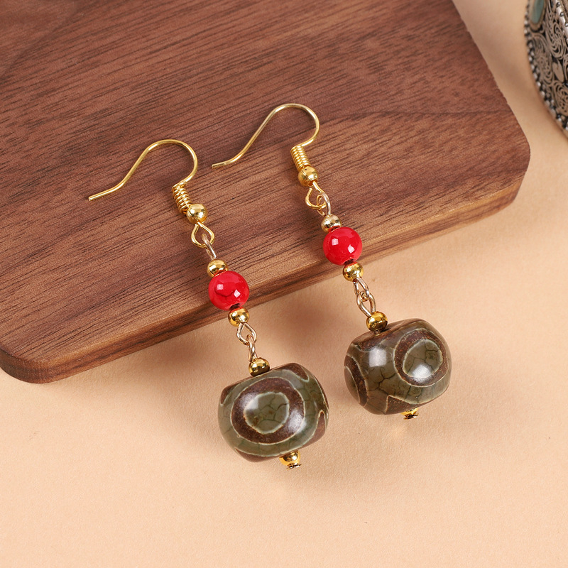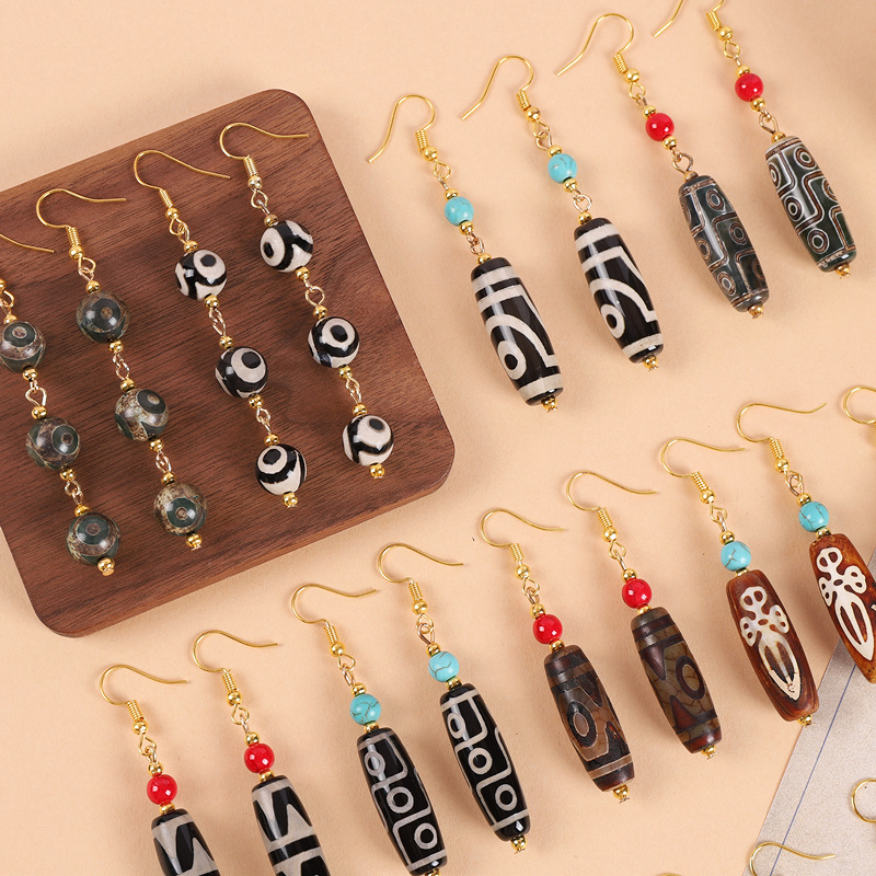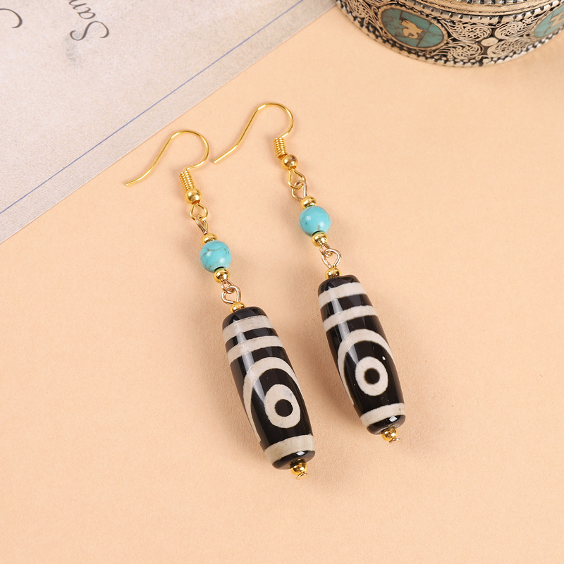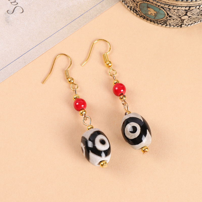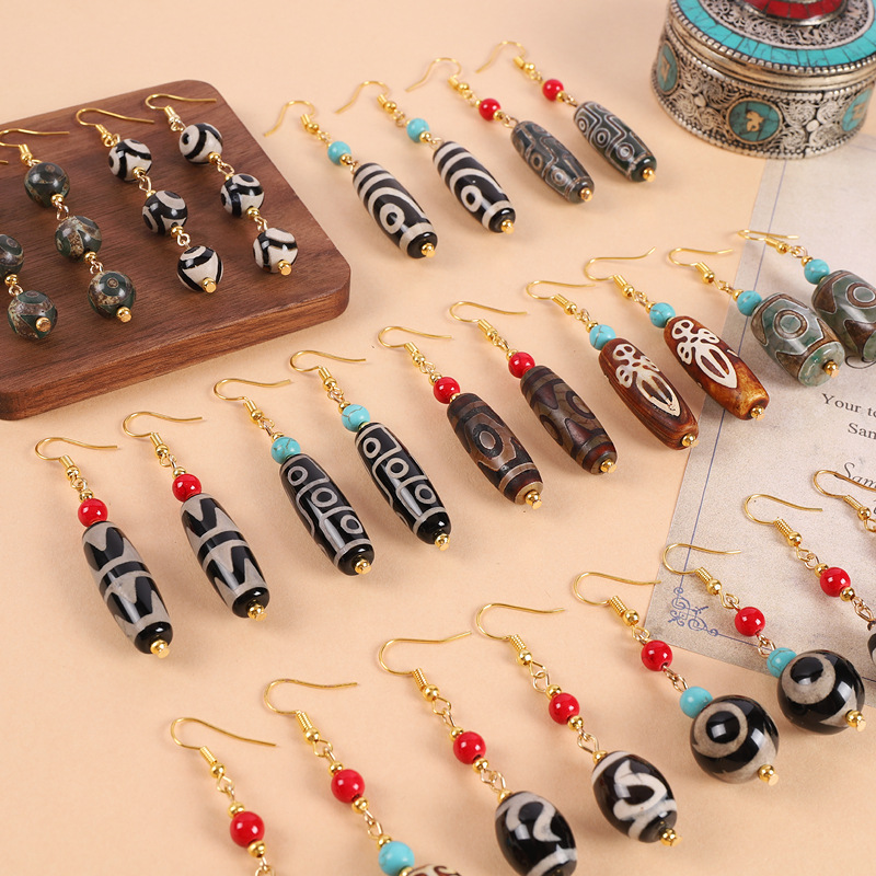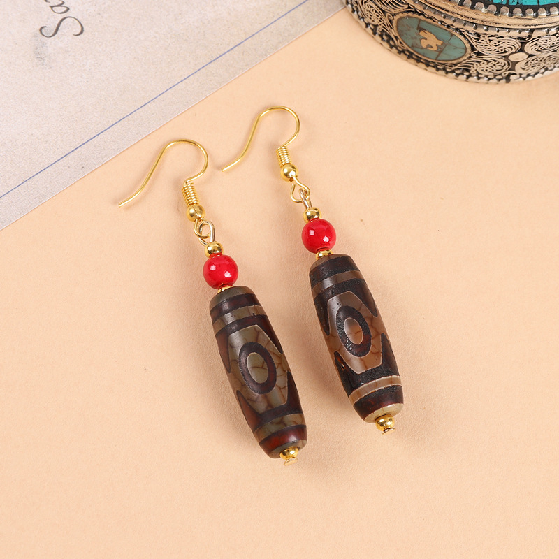 原创设计藏式九眼天珠玛瑙耳环民族风复古文艺虎牙耳坠中式耳饰女