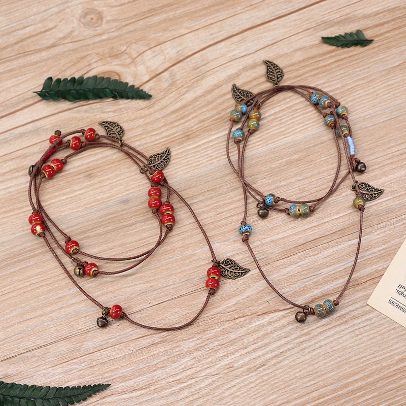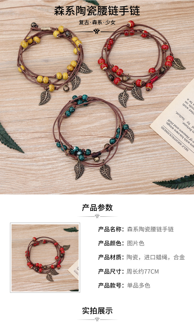 复古波西米亚森系陶瓷手链少女甜美铃铛叶子百搭腰链多圈手串饰品