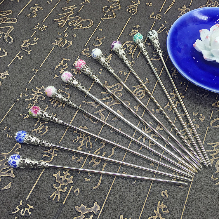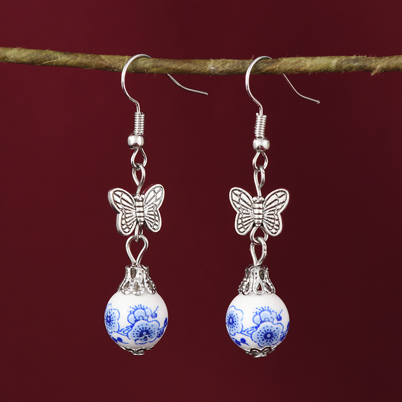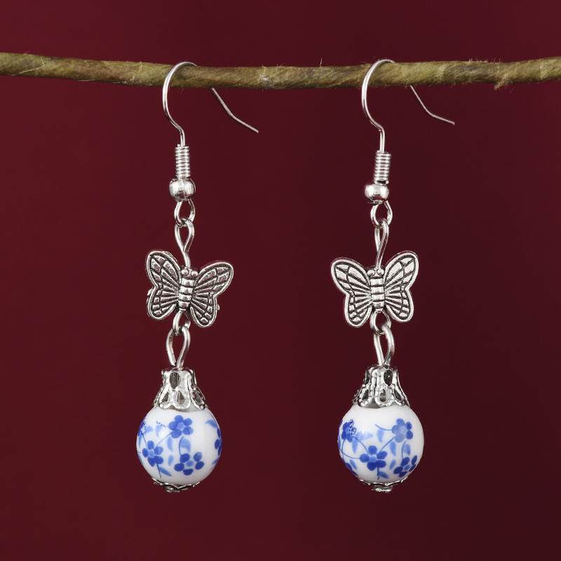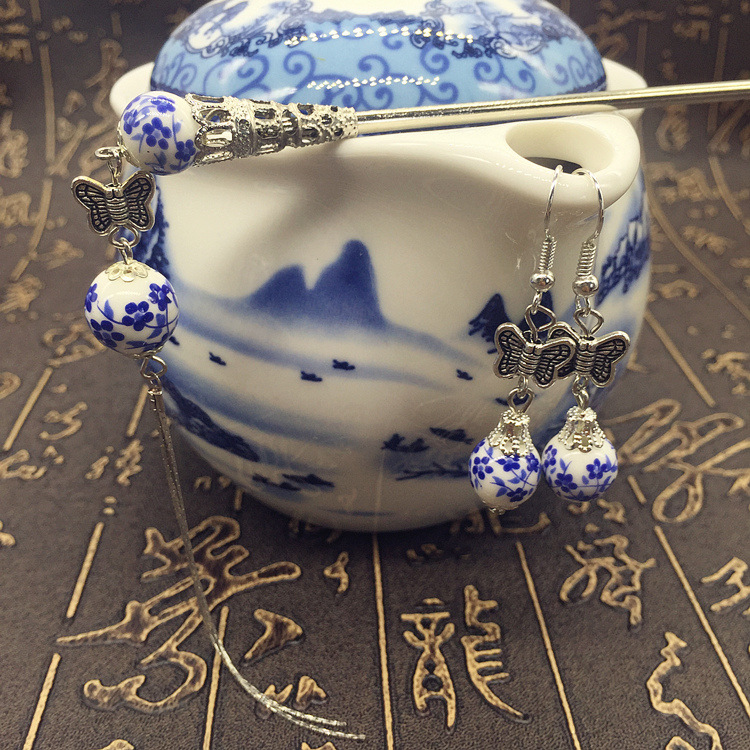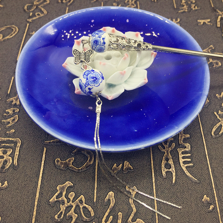 新中式青花陶瓷流苏发簪小众设计国风步摇簪子发钗女文艺古风耳环