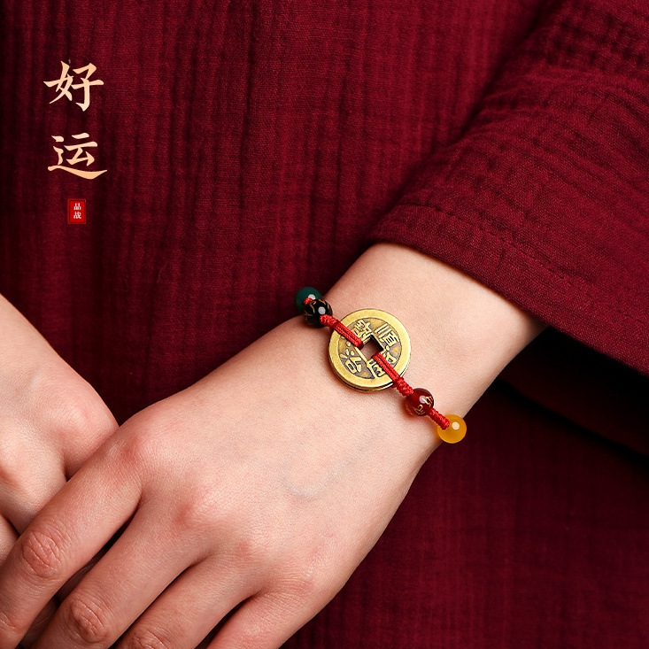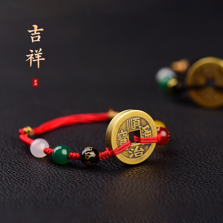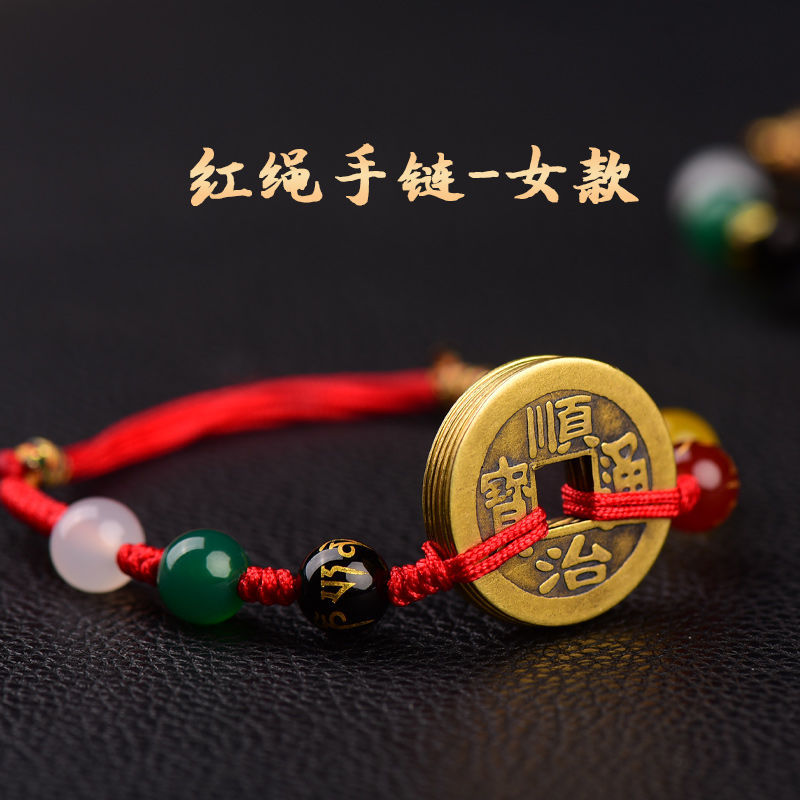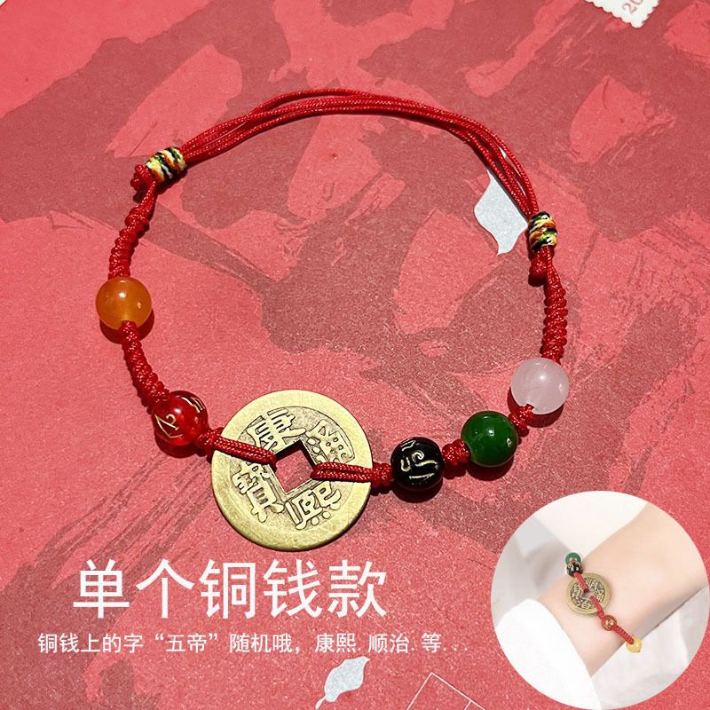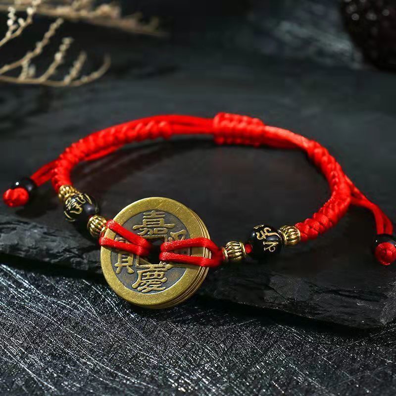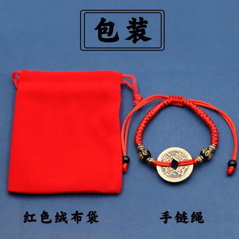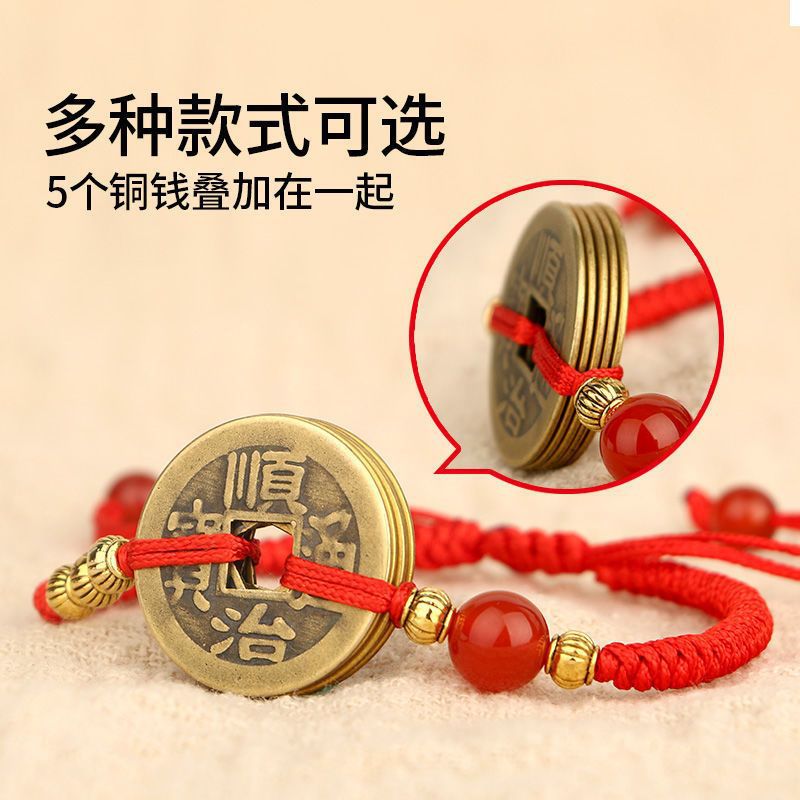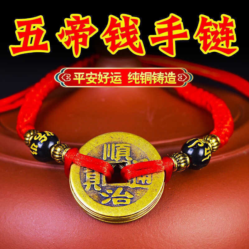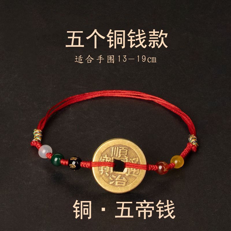厂家新款铜钱红绳手链六字真言五行珠五帝钱红绳手链男女铜钱手链