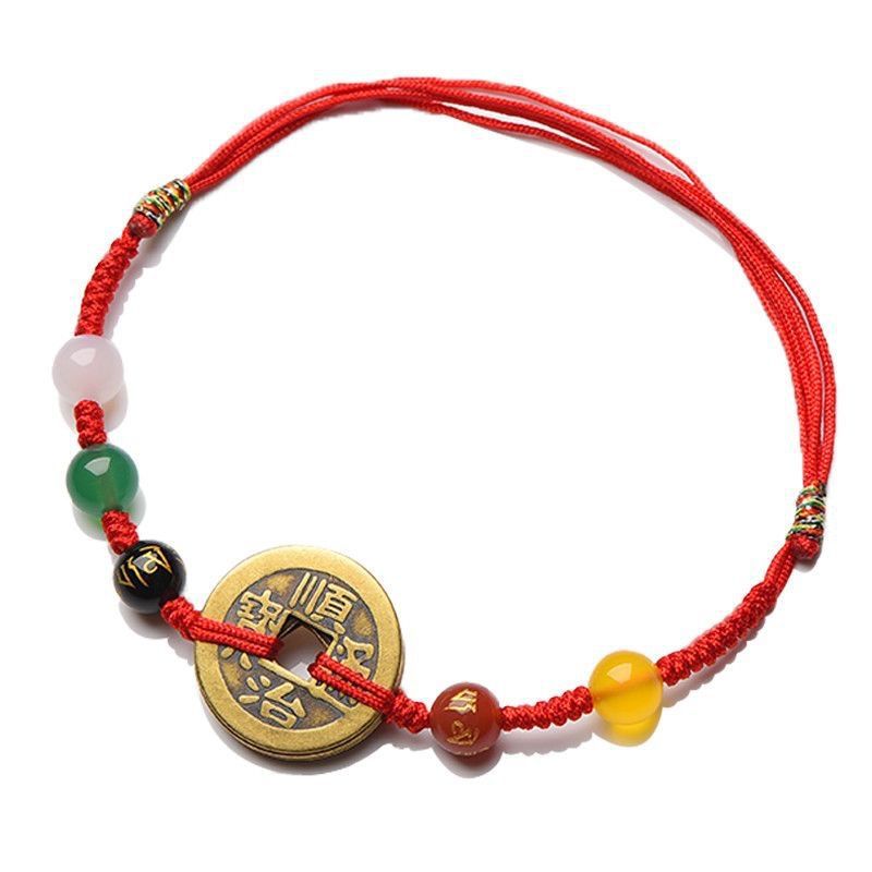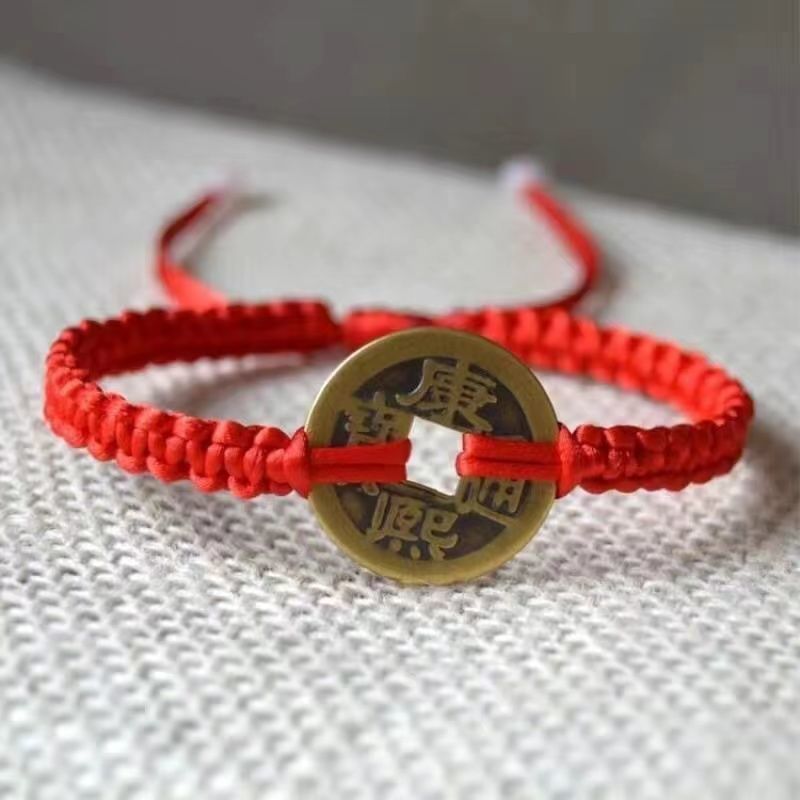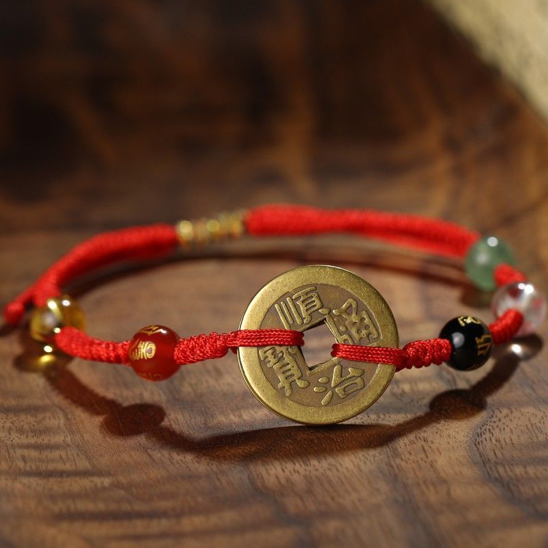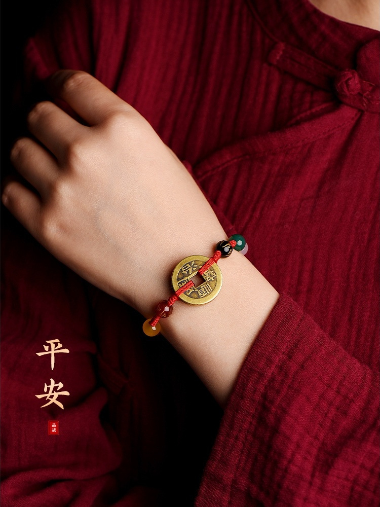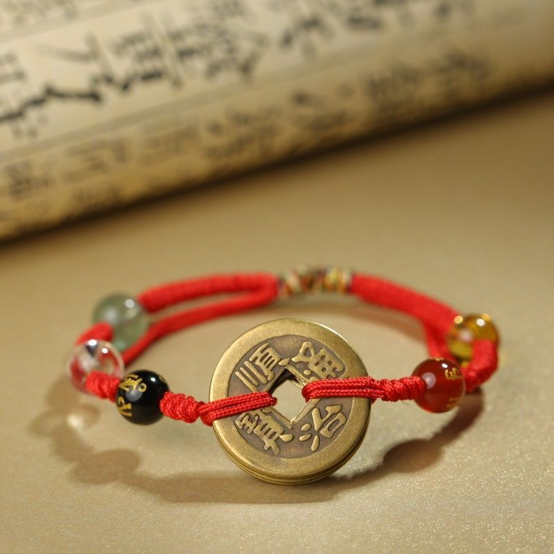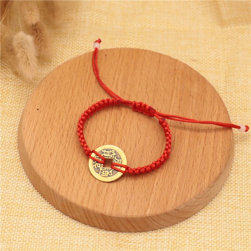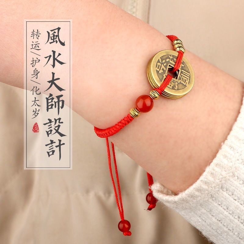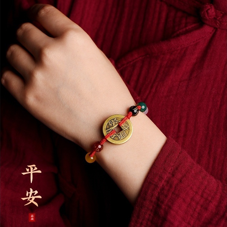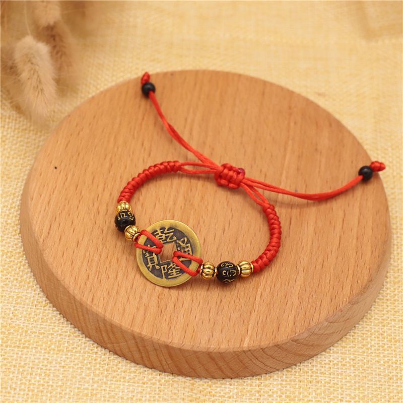 厂家新款铜钱红绳手链六字真言五行珠五帝钱红绳手链男女铜钱手链
