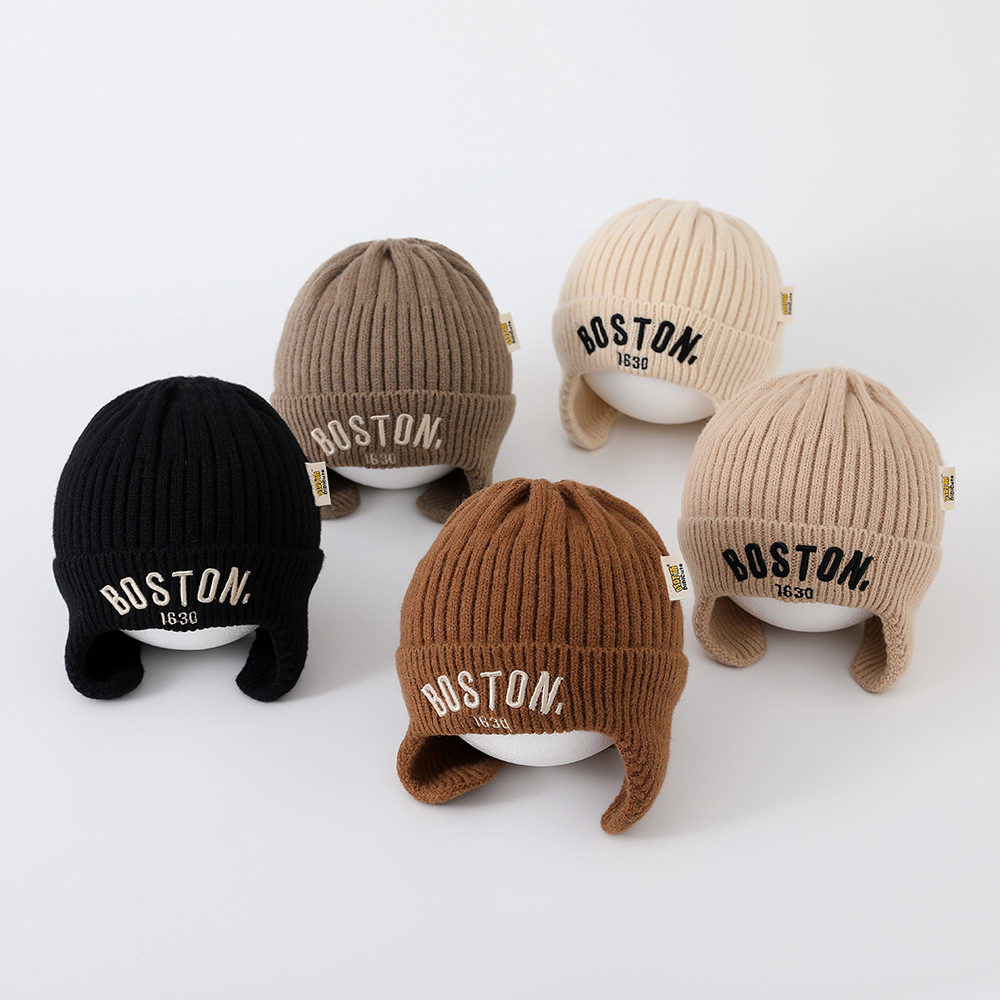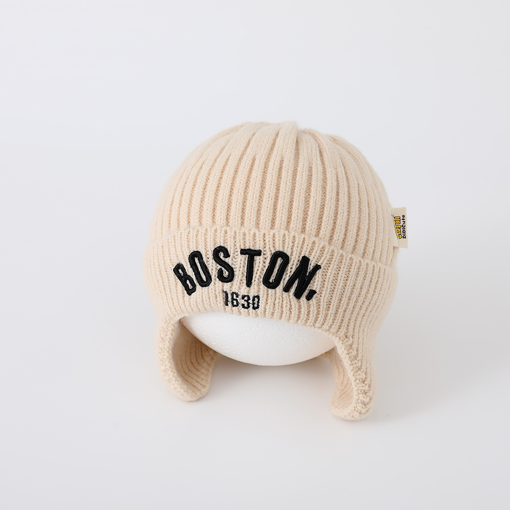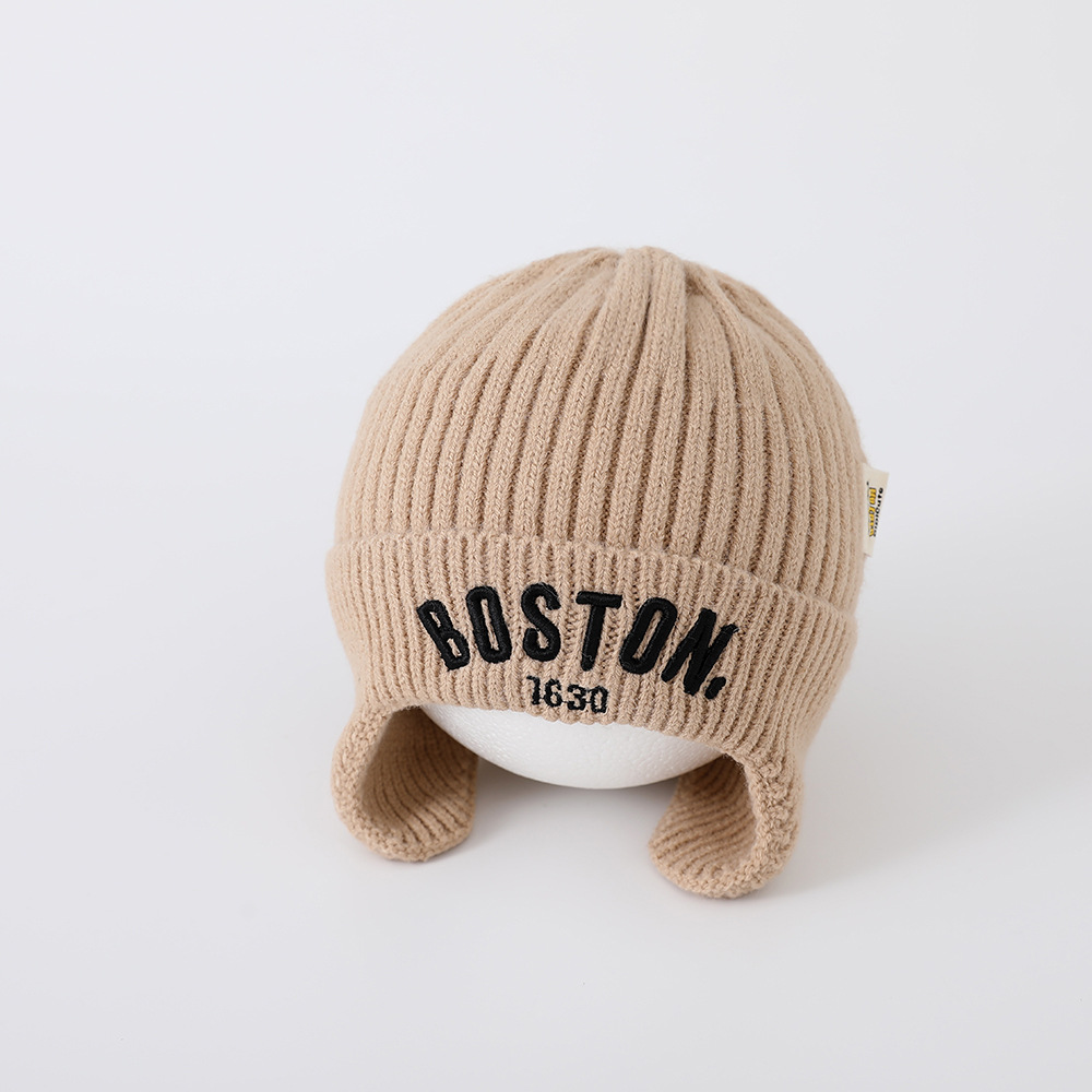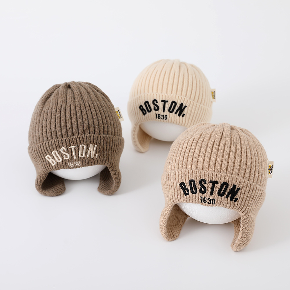 BOSTON婴儿字母儿童毛线帽宝宝针织帽加里布婴儿秋冬款护耳保暖帽