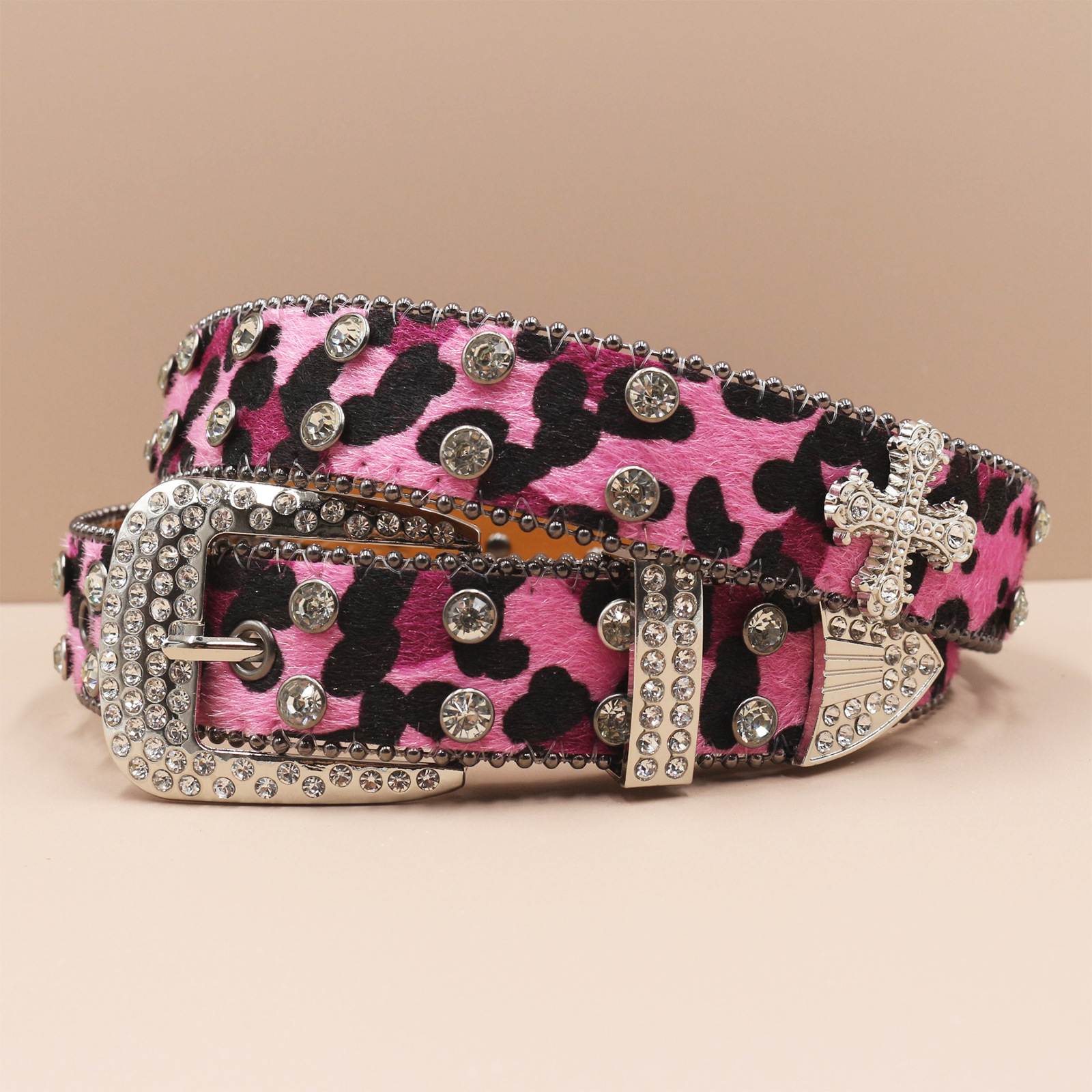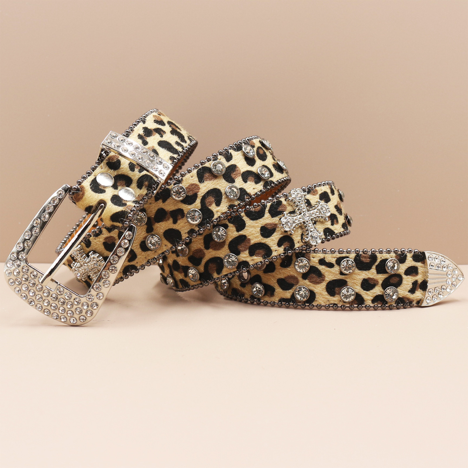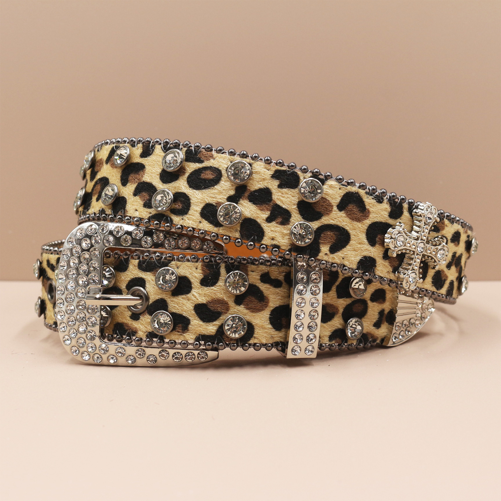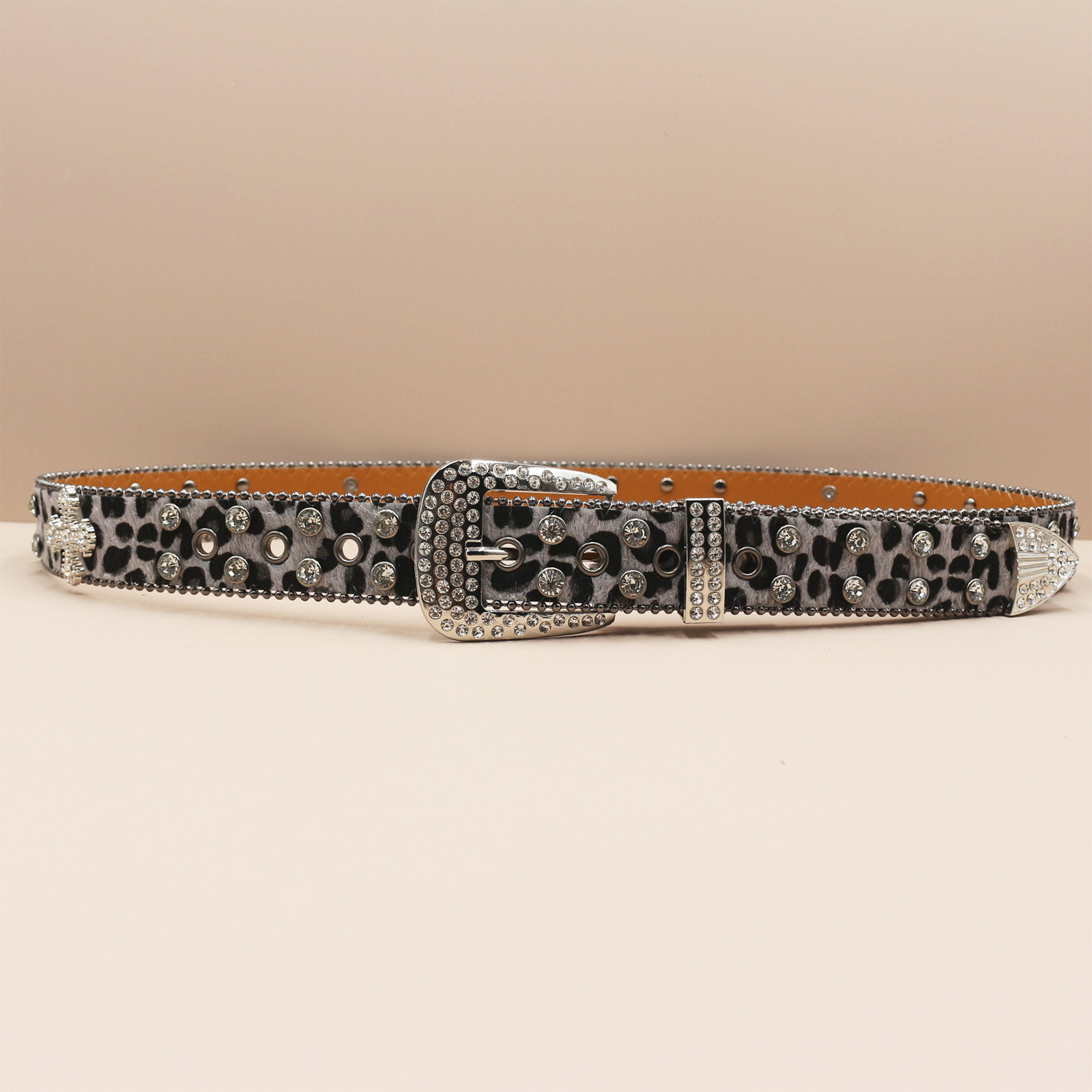 十字架时尚腰带Y2K豹纹西部水钻腰带个性牛仔女铆钉牛仔裤裤腰带