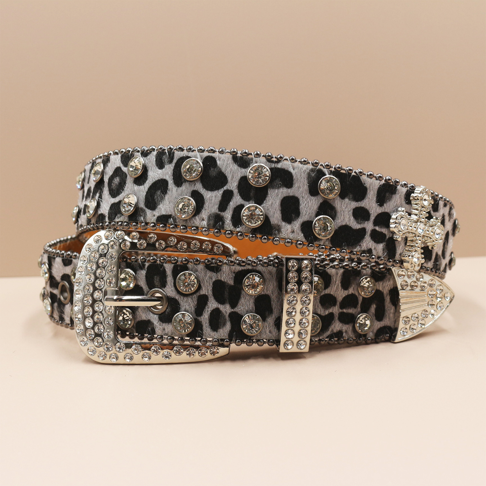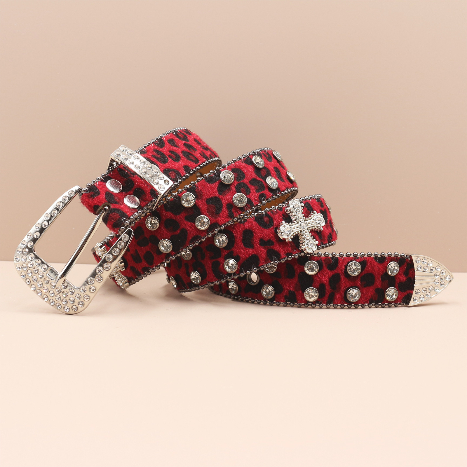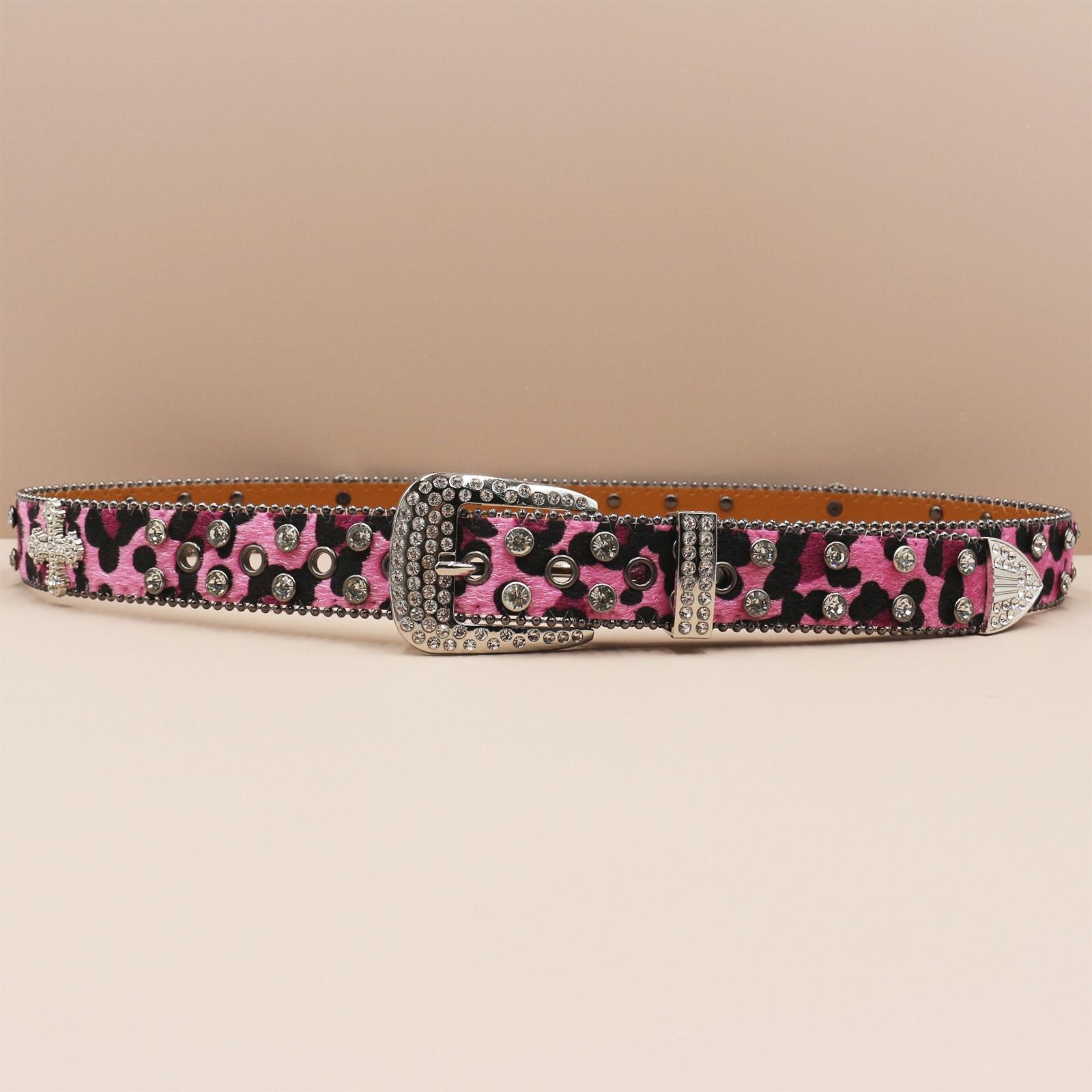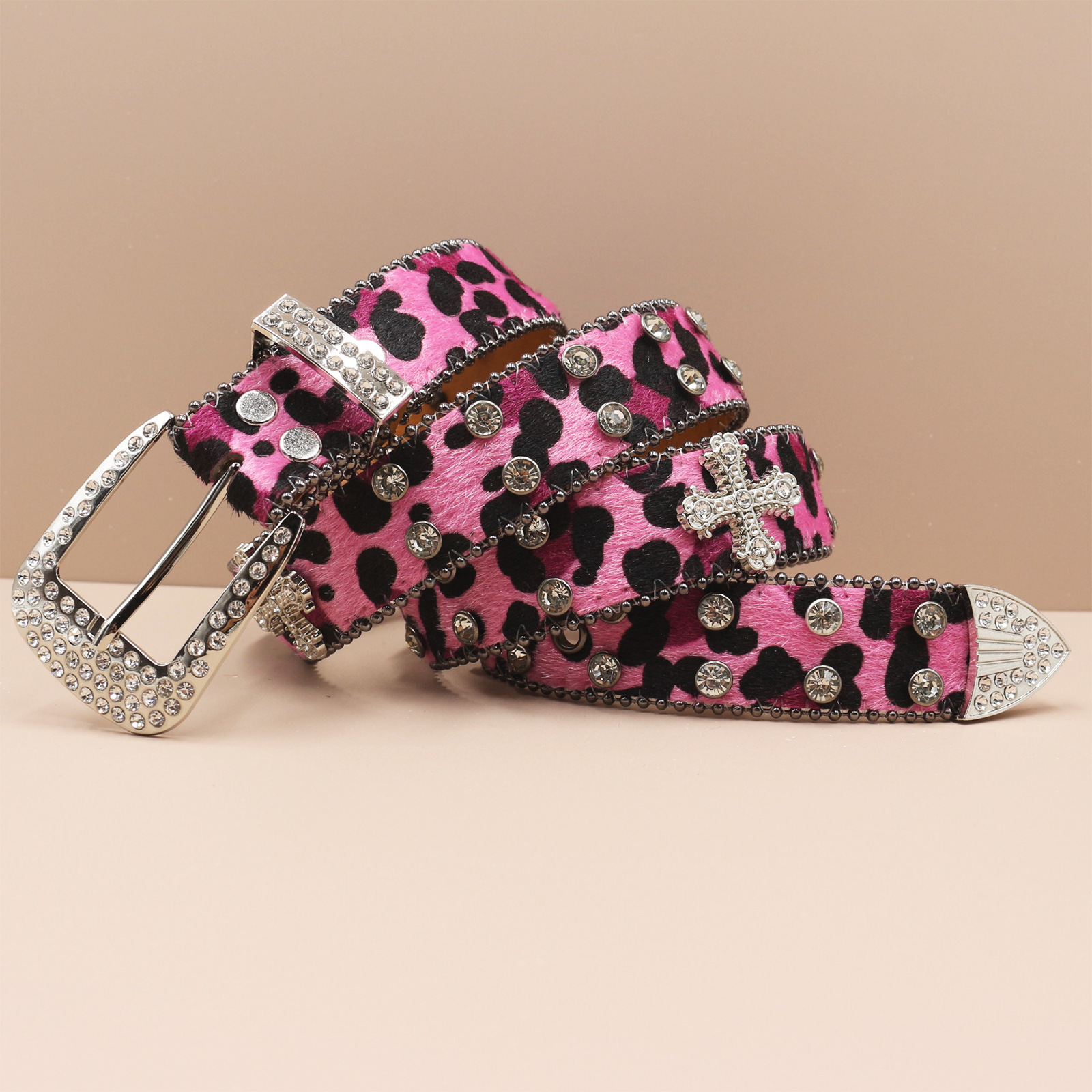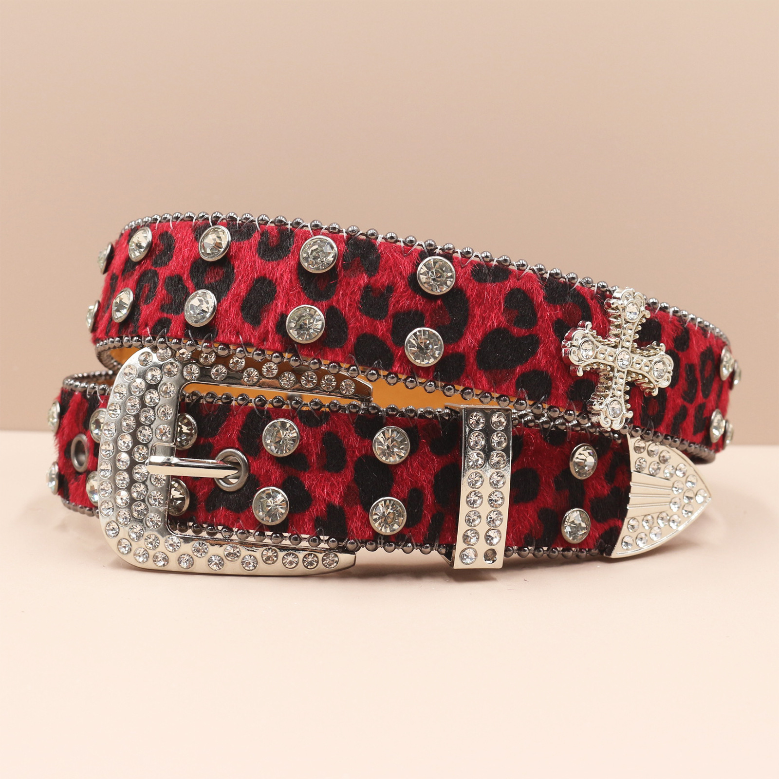 十字架时尚腰带Y2K豹纹西部水钻腰带个性牛仔女铆钉牛仔裤裤腰带