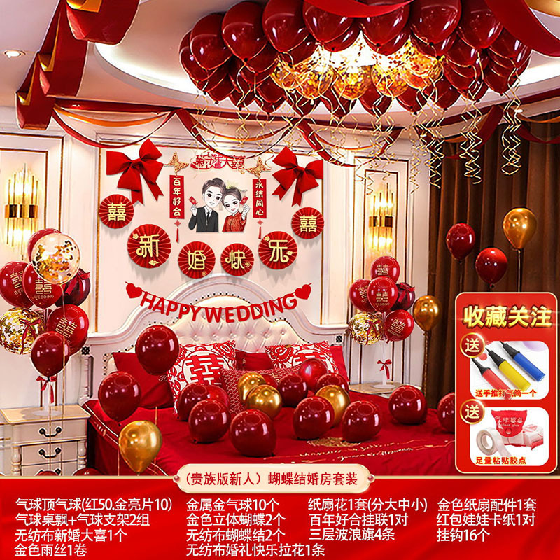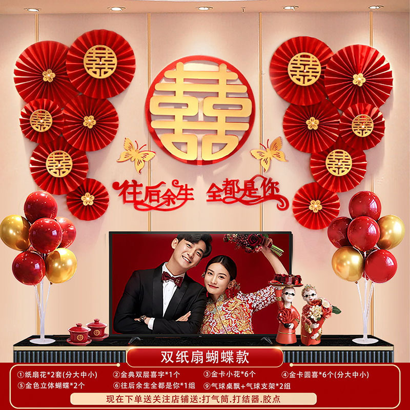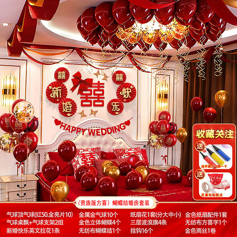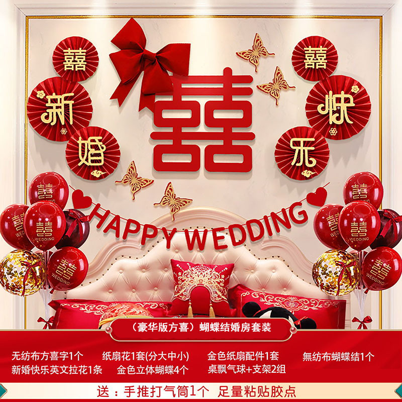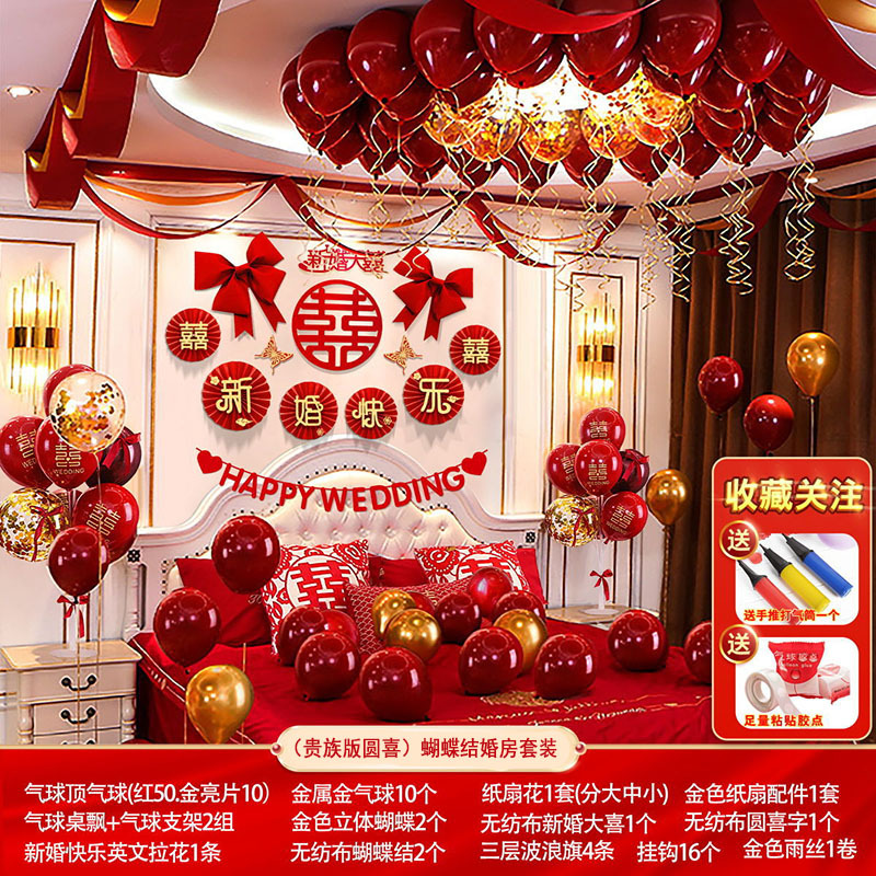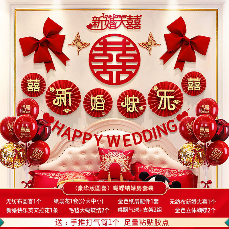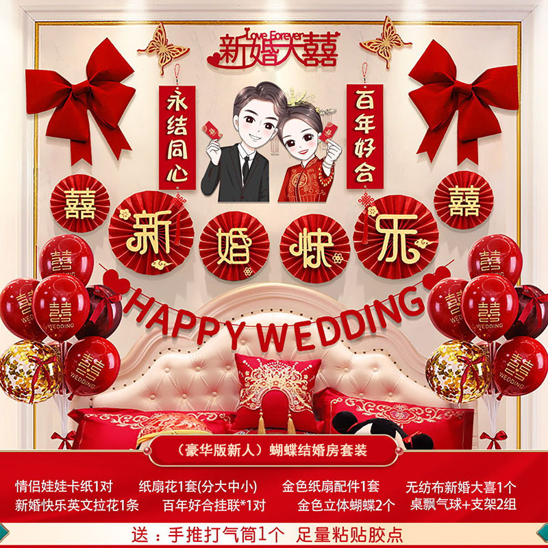 婚房布置蝴蝶结气球套装结婚房间卧室客厅电视背景墙拉花婚庆装饰