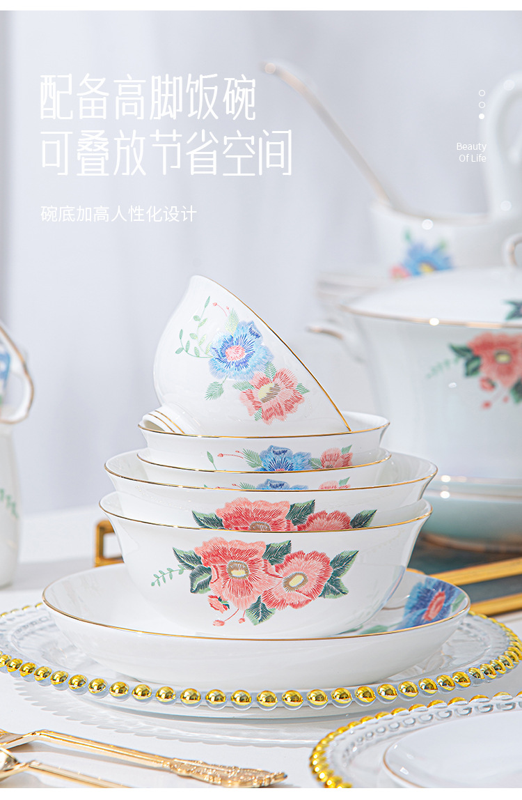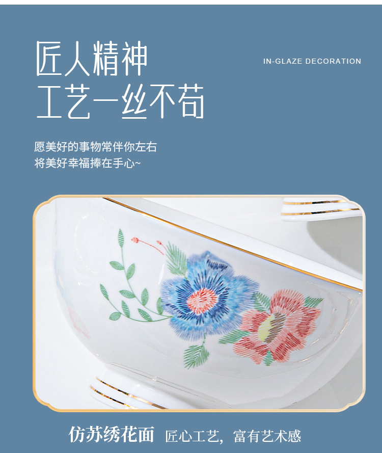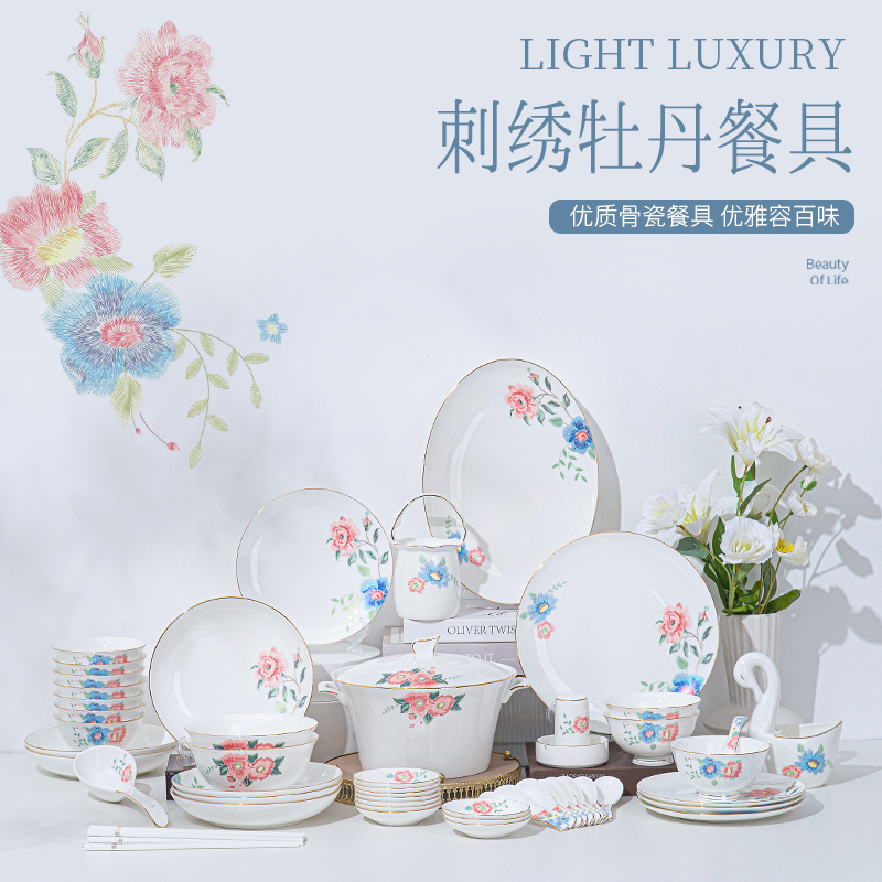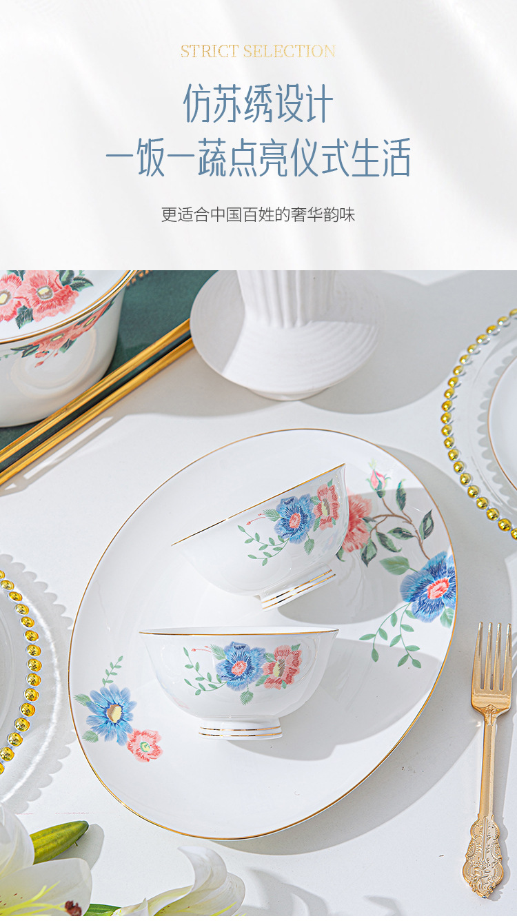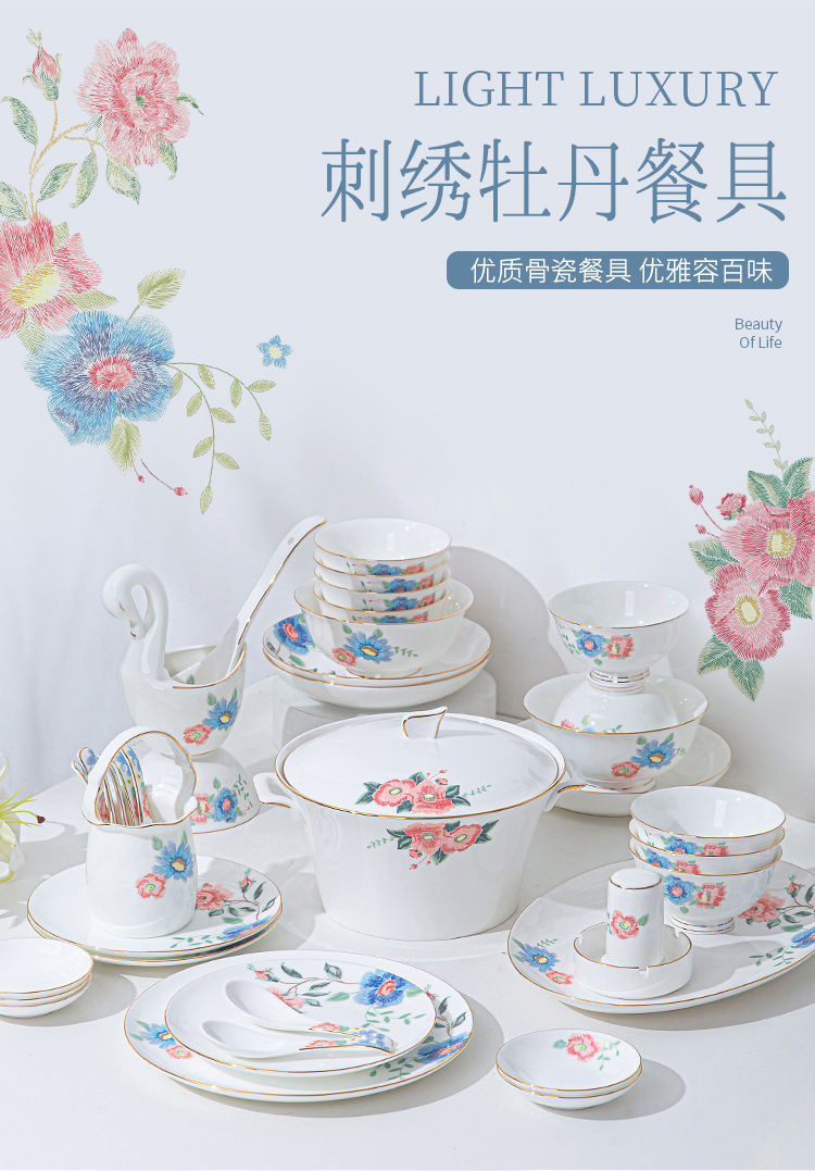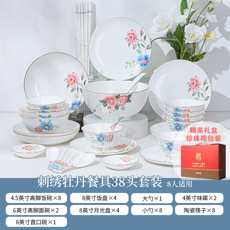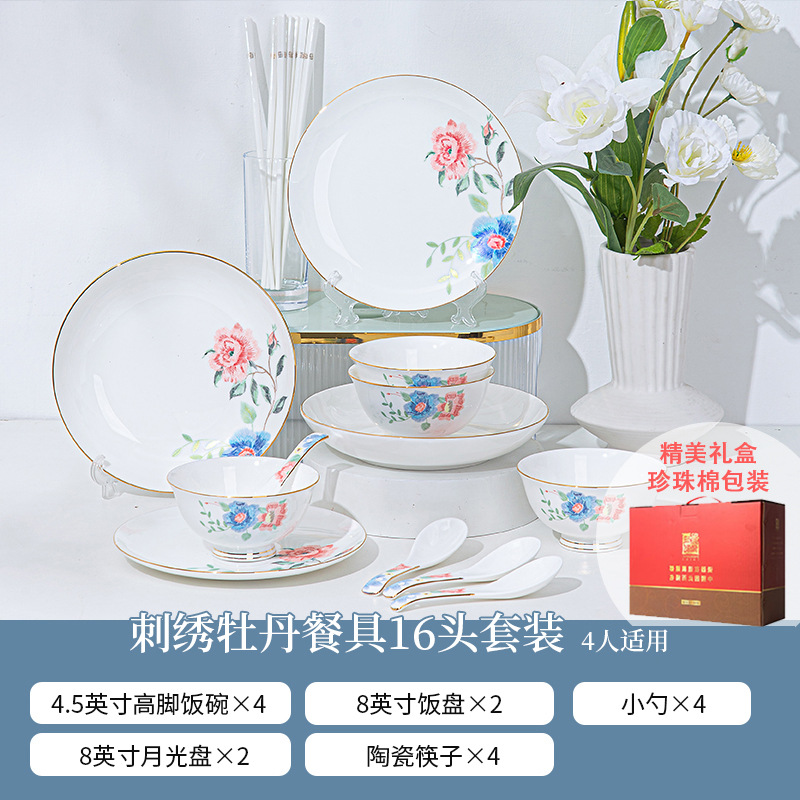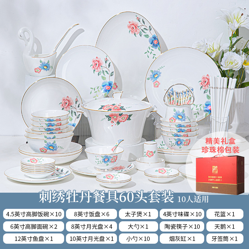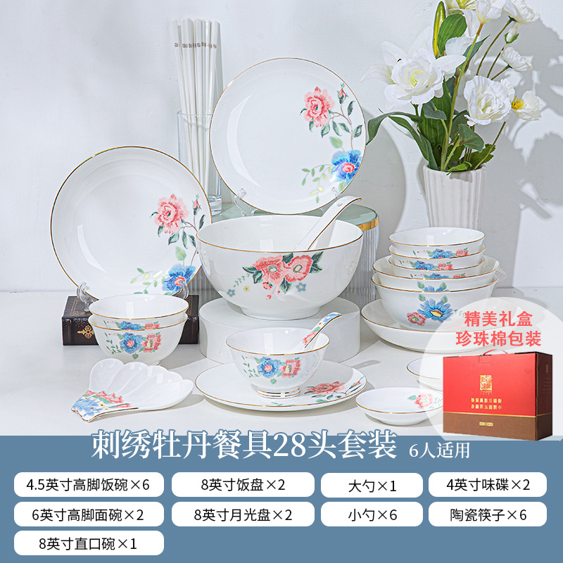 餐具套装乔迁送礼礼物陶瓷碗碟盘高档骨瓷家用刺绣新中式整套碗盘
