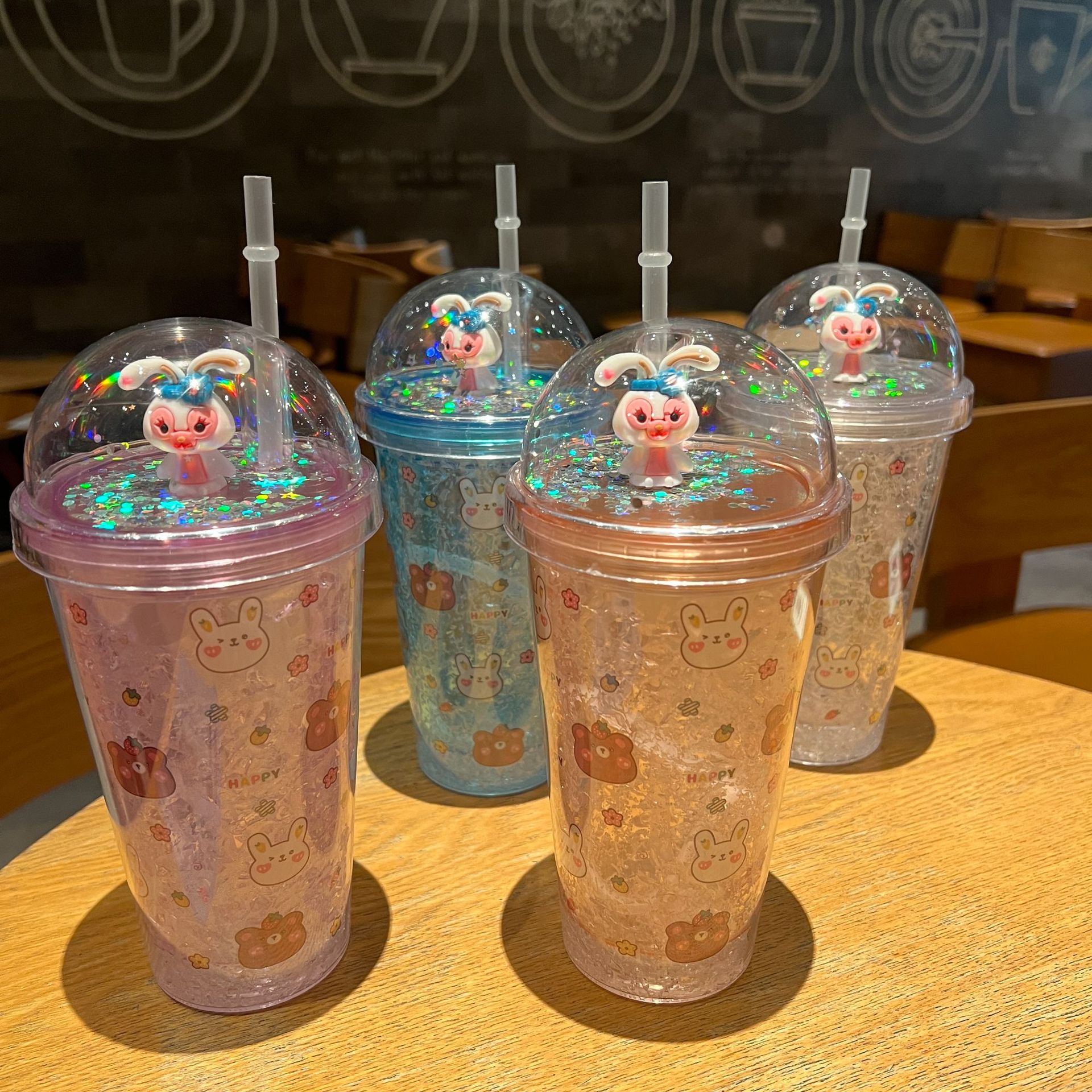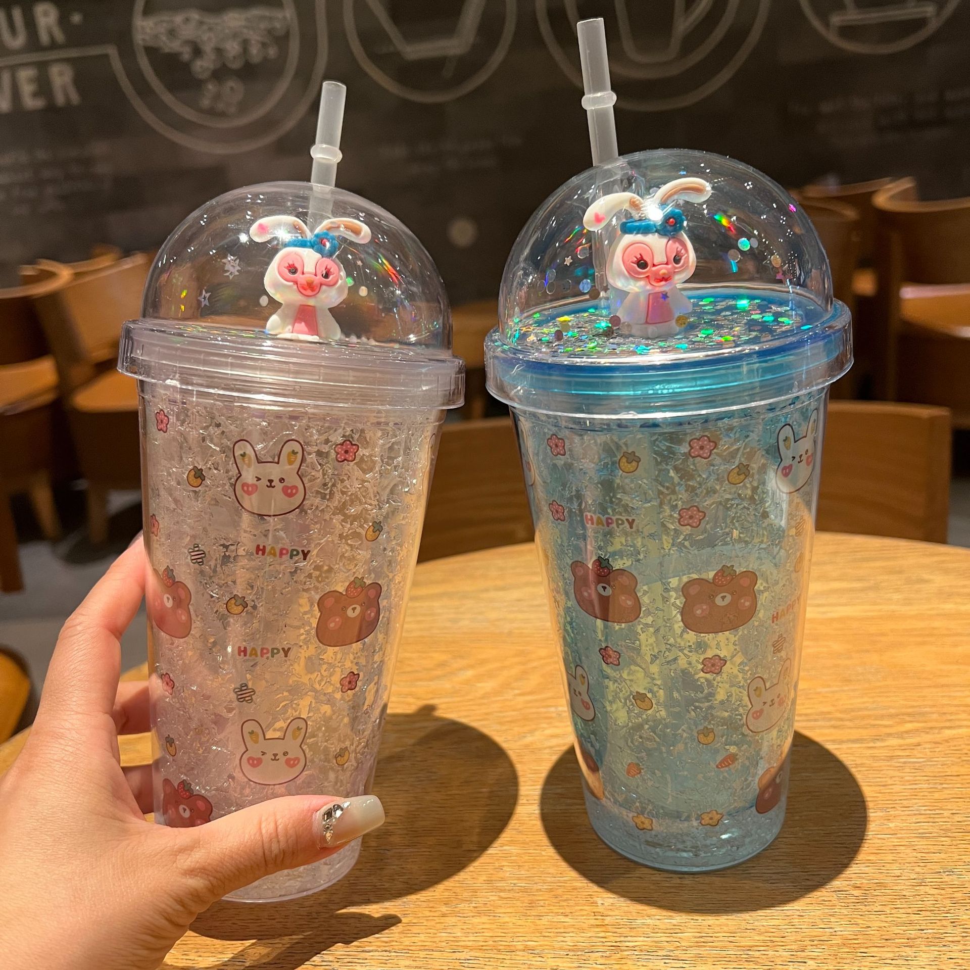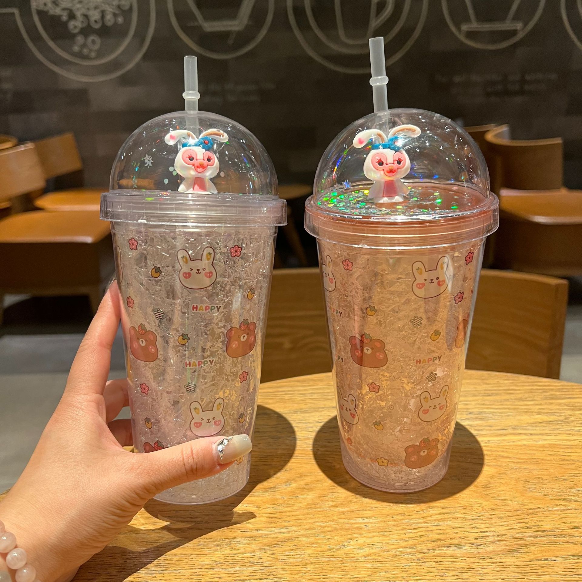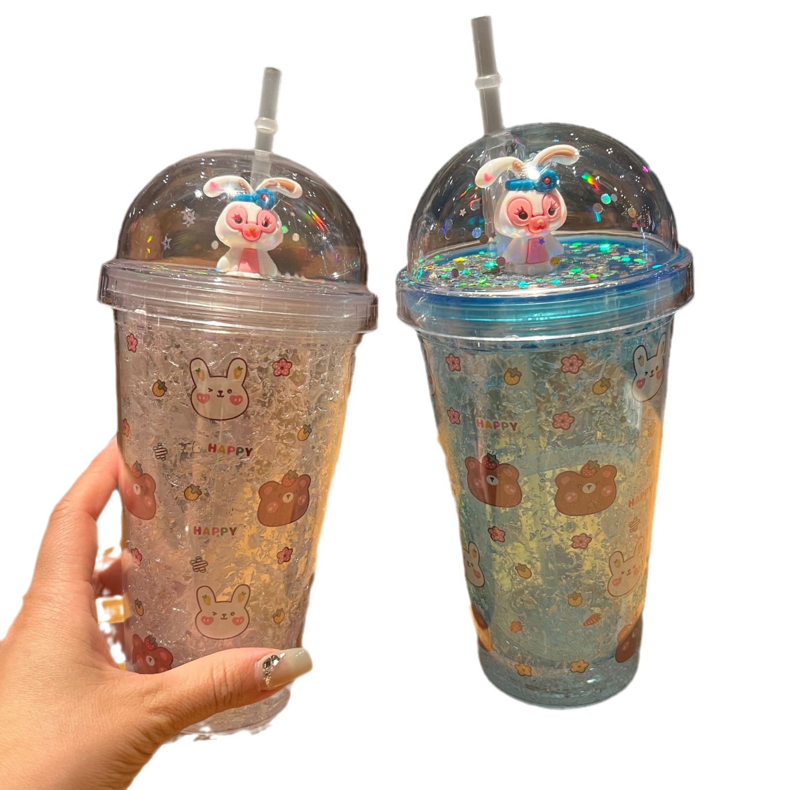 跨境新款高颜值夏季网红萌熊卡通兔子塑料水杯吸管水杯双层碎冰杯