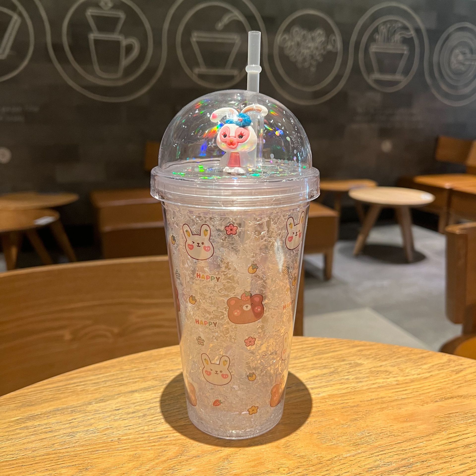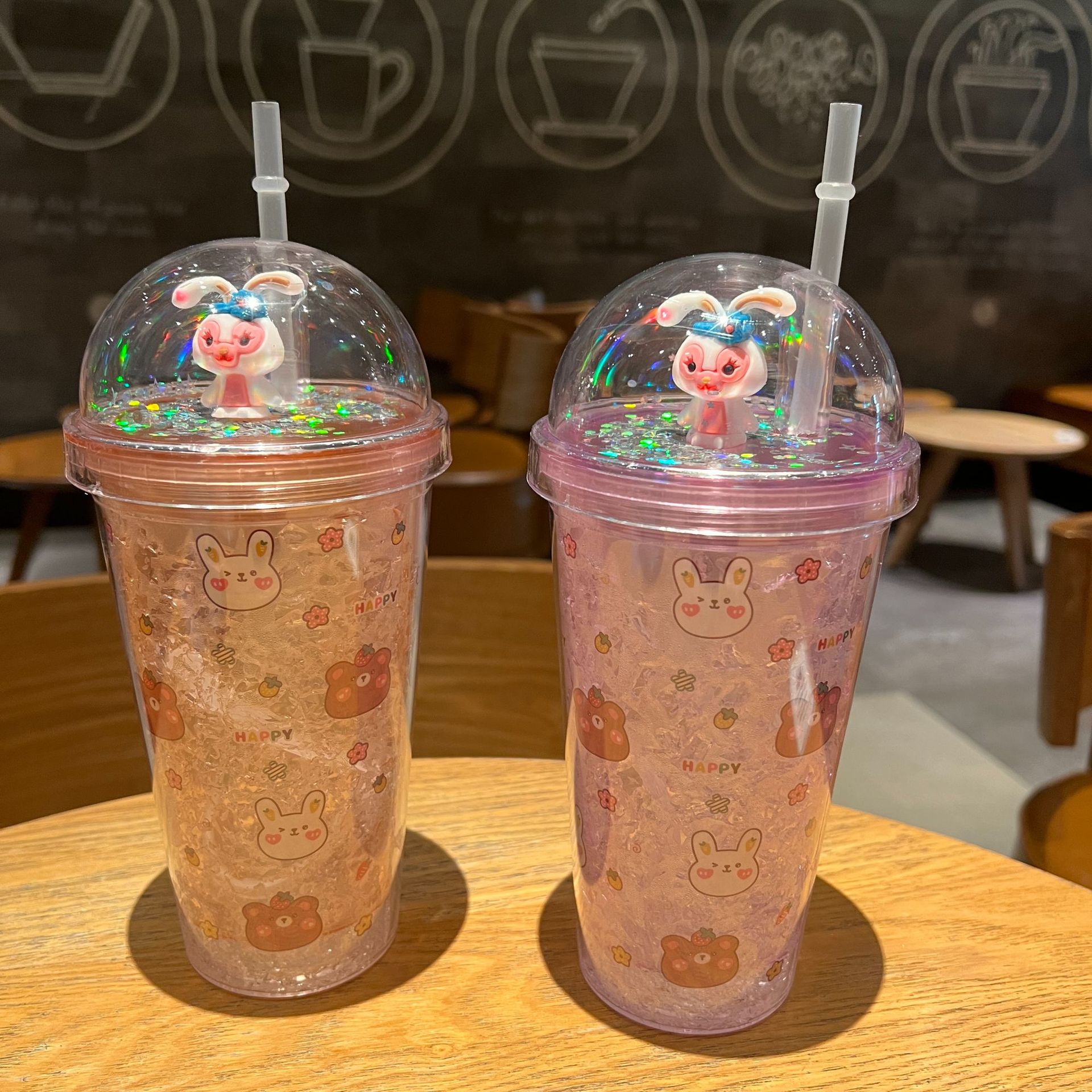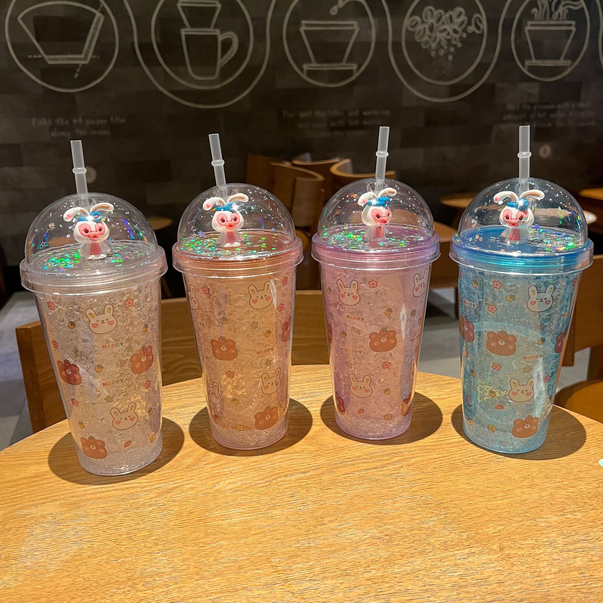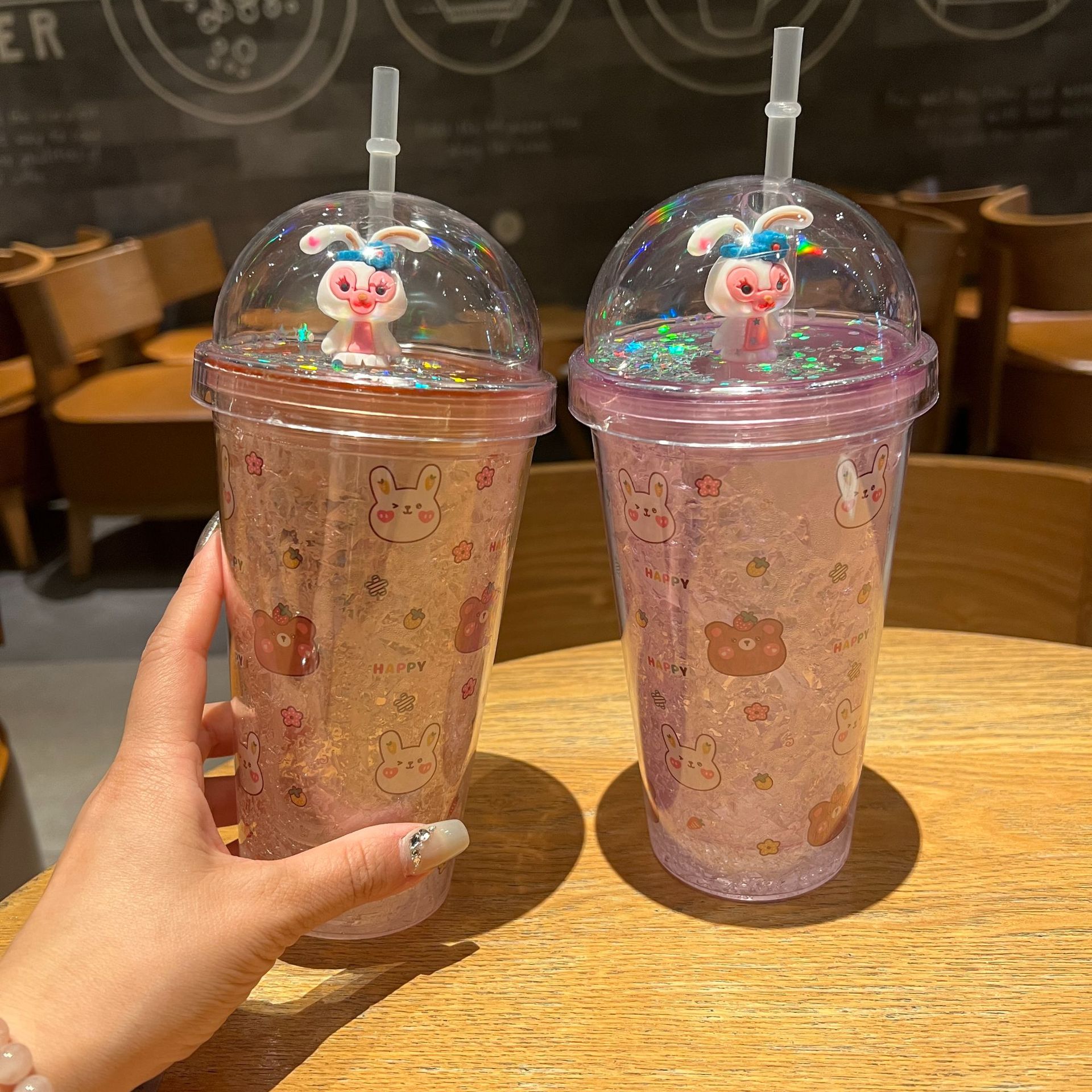 跨境新款高颜值夏季网红萌熊卡通兔子塑料水杯吸管水杯双层碎冰杯