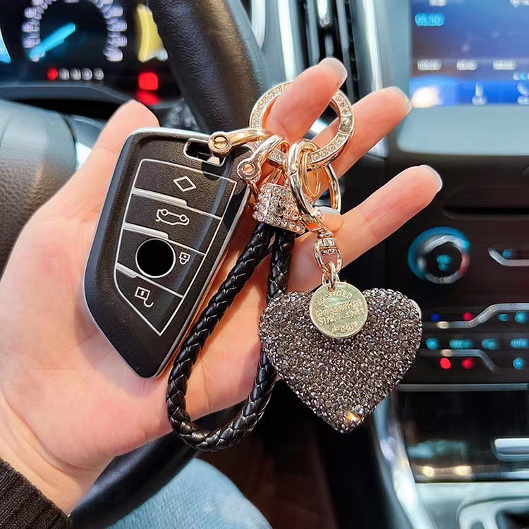 跨境热卖陶泥满钻爱心钥匙扣镶钻桃心汽车钥匙链耳机套包包挂件