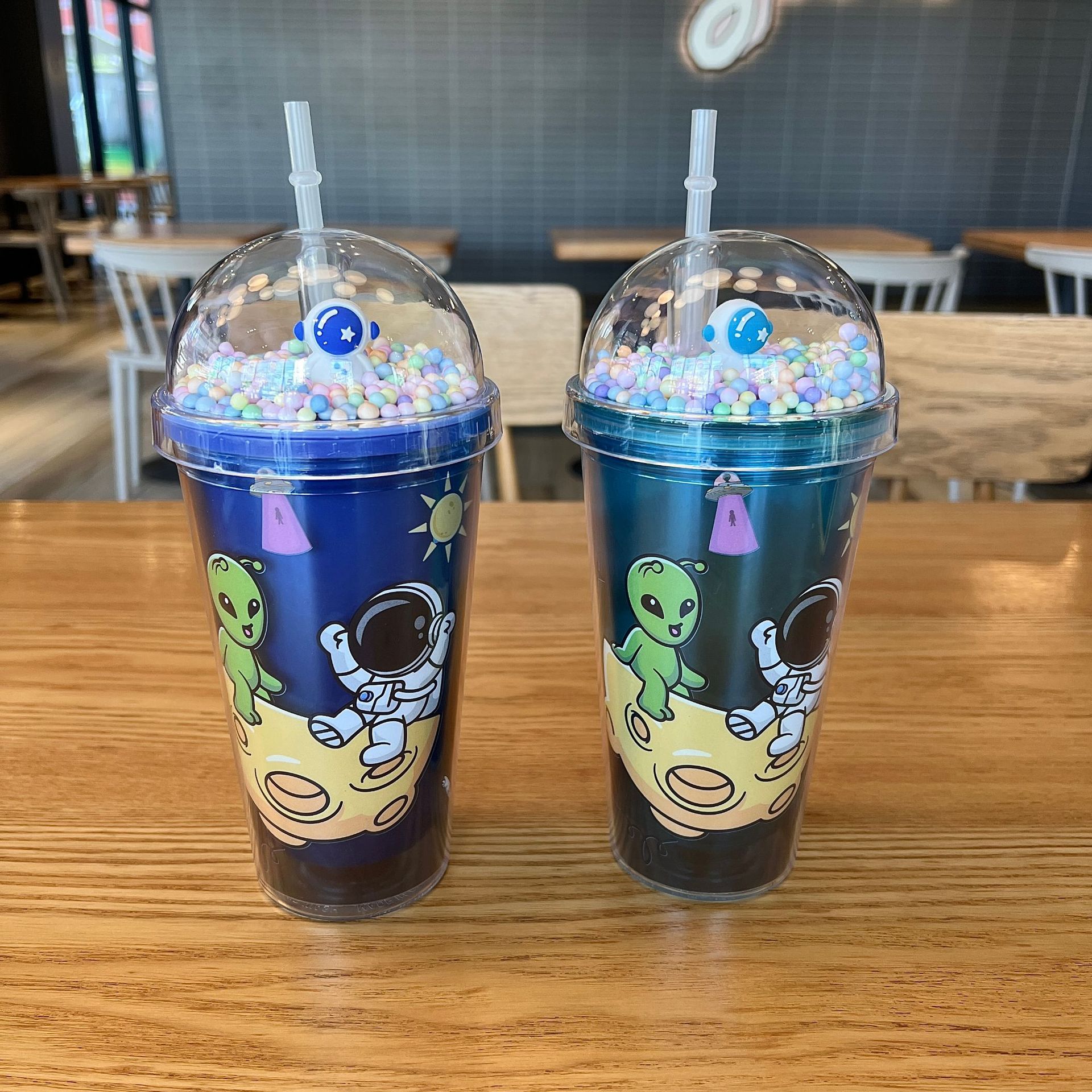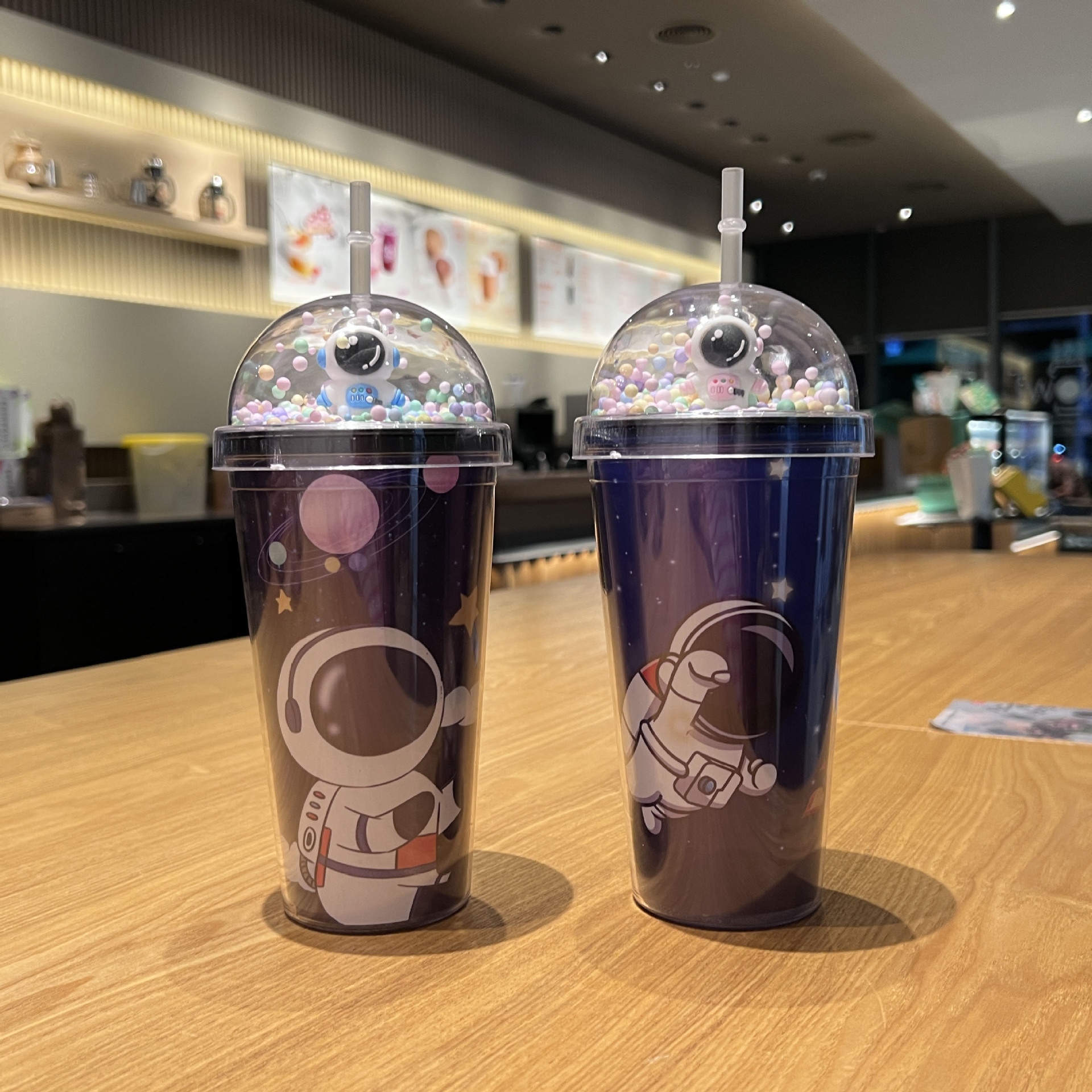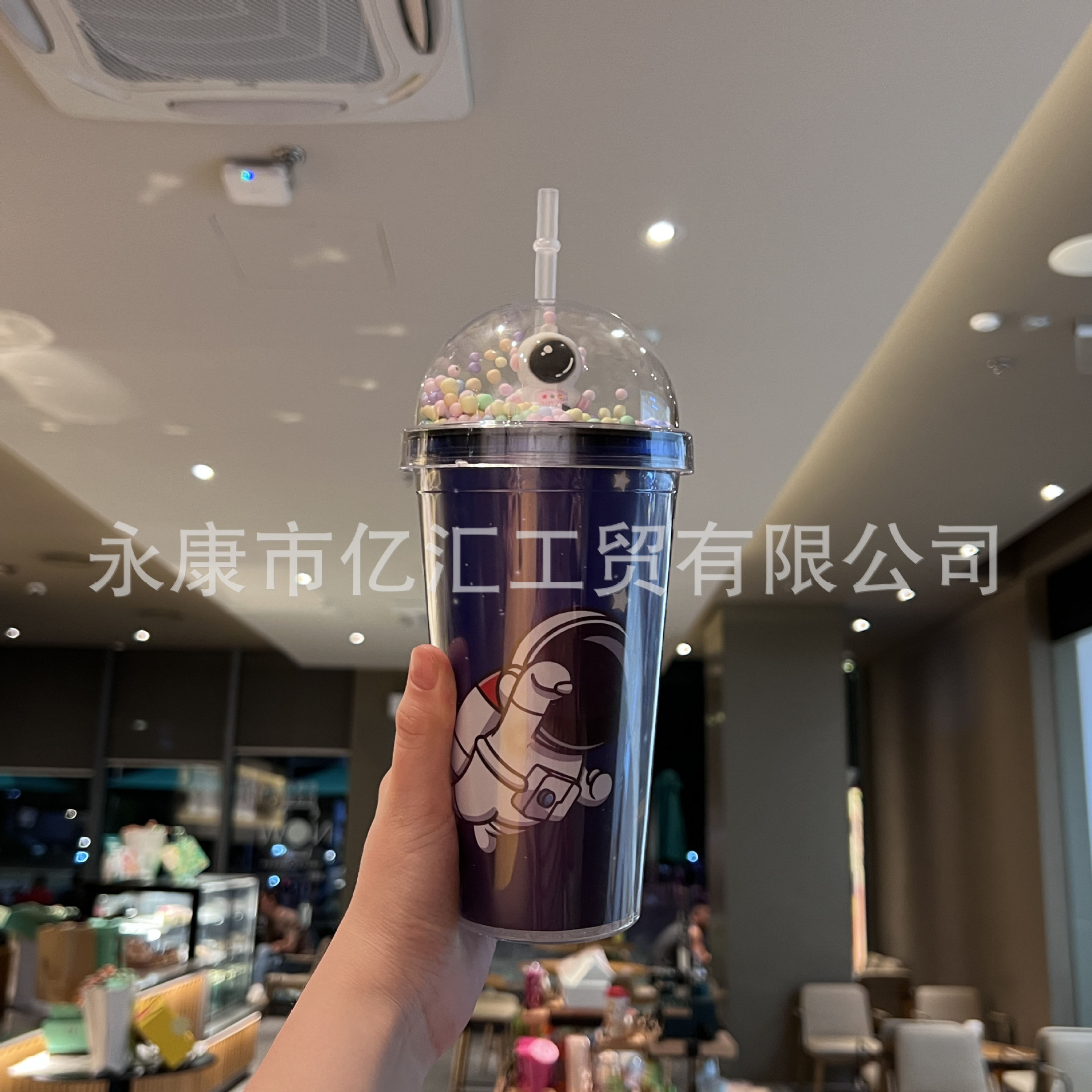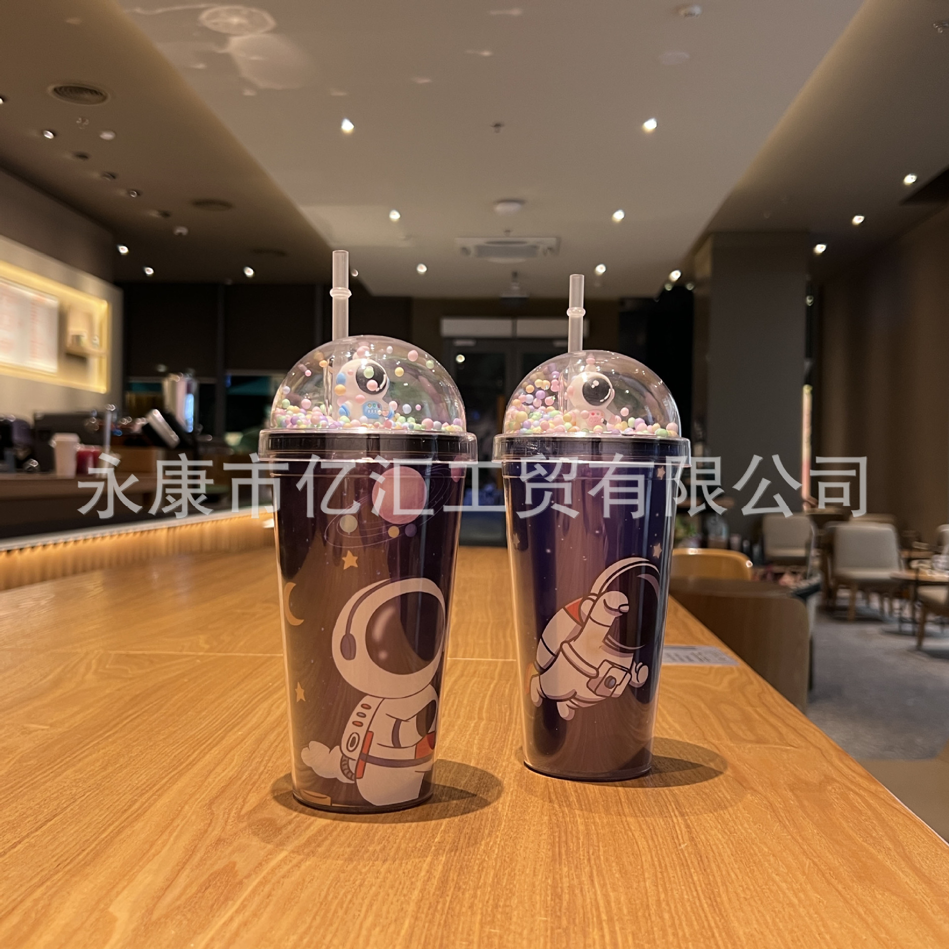 跨境新款高颜值宇航员网红太空人卡通塑料水杯吸管水杯双层碎冰杯