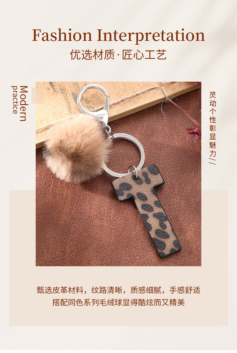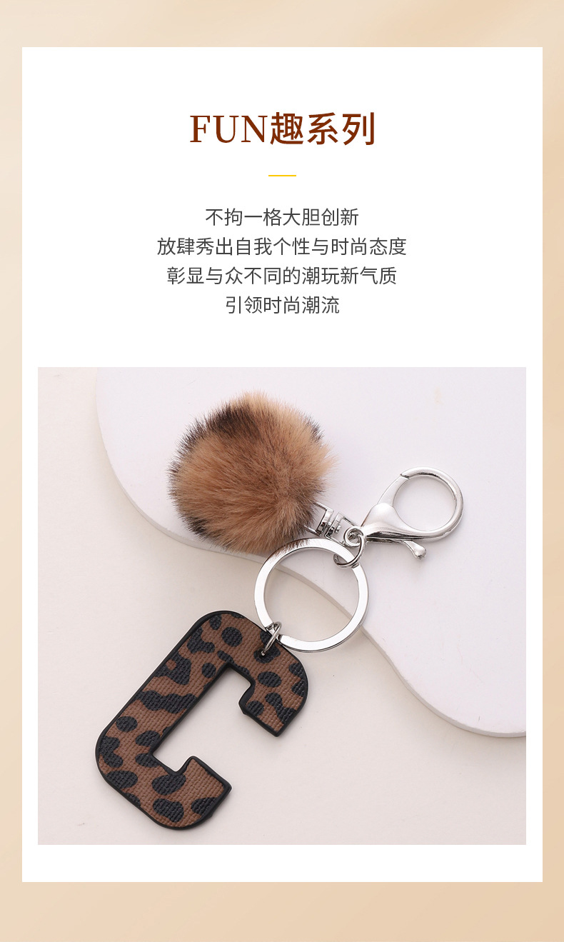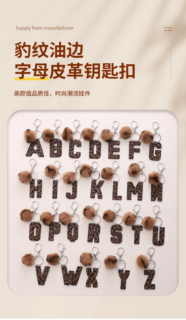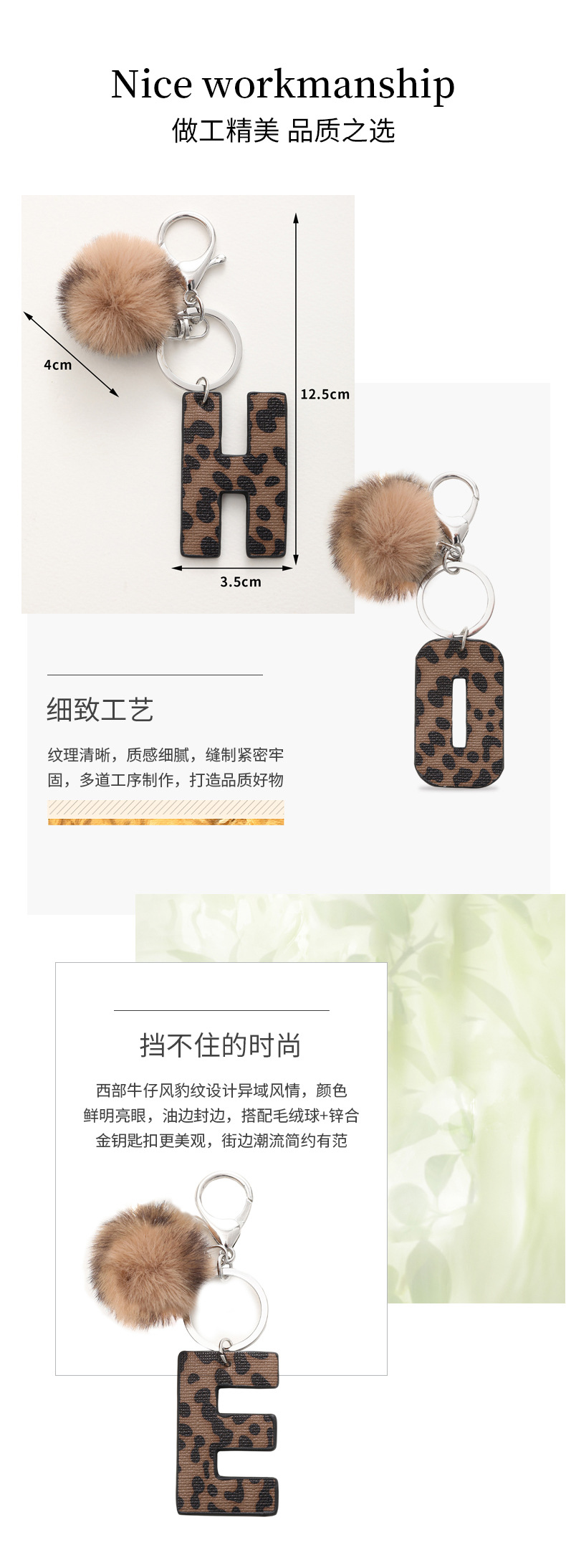 西部牛仔风豹纹油边字母皮革钥匙扣汽车挂件毛绒球配件跨境亚马逊