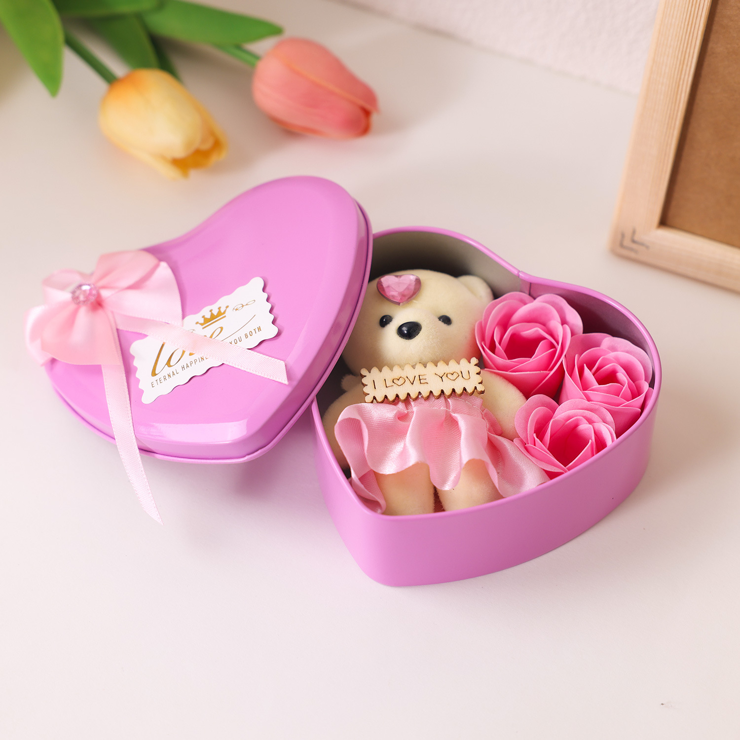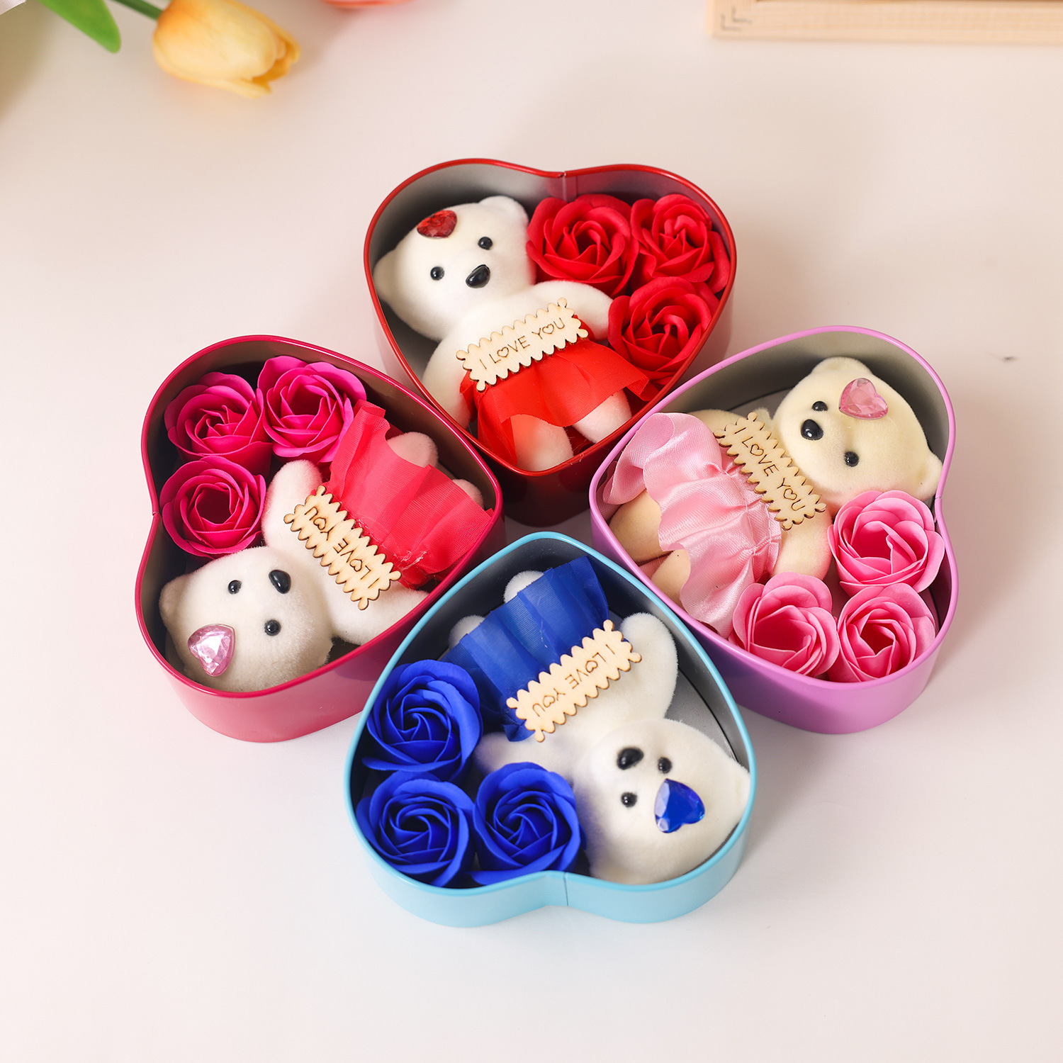 工厂批发3朵玫瑰加熊心形爱心铁盒香皂花肥皂花情人节外贸跨境