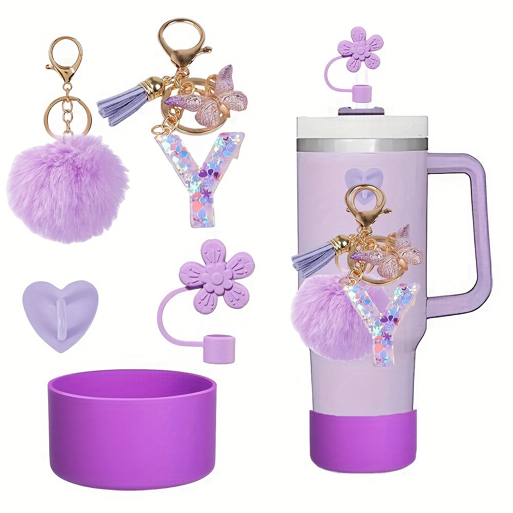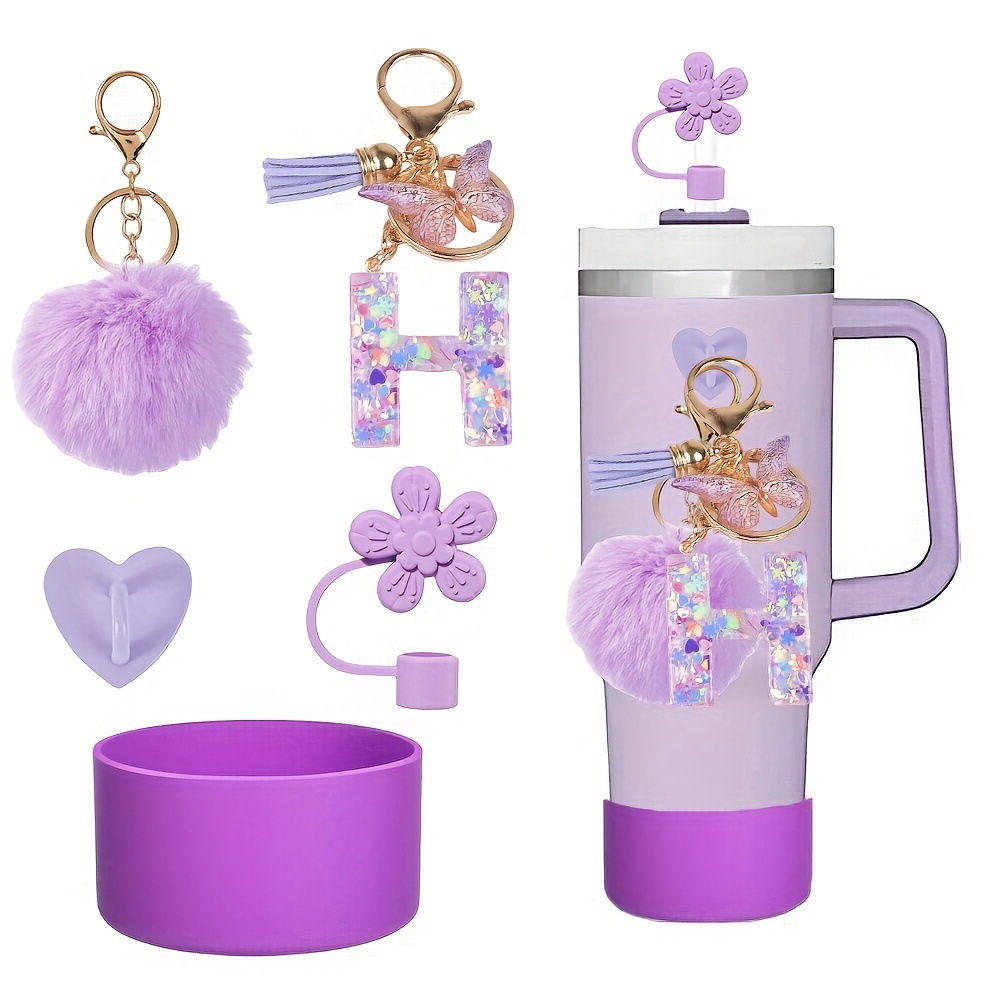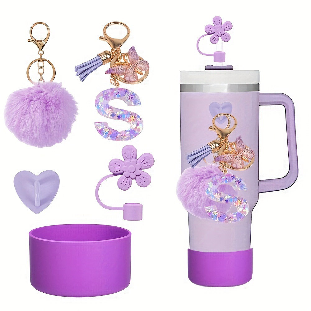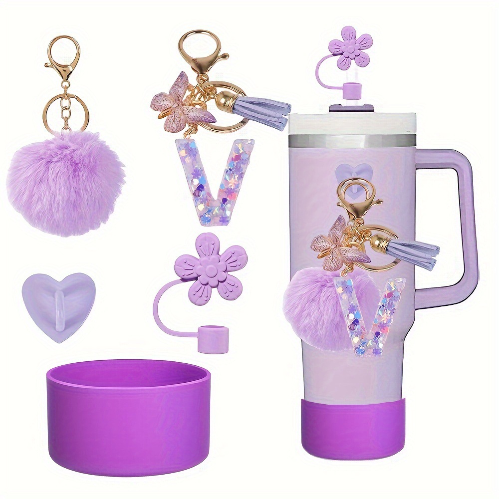 Stanley杯挂件紫色字母钥匙扣花朵吸管帽毛绒球吊坠杯链硅胶杯套
