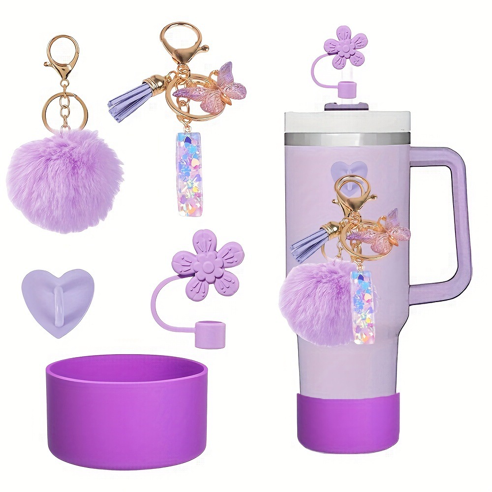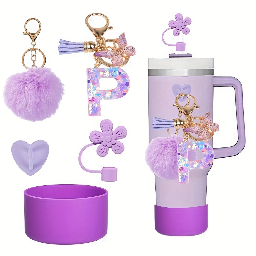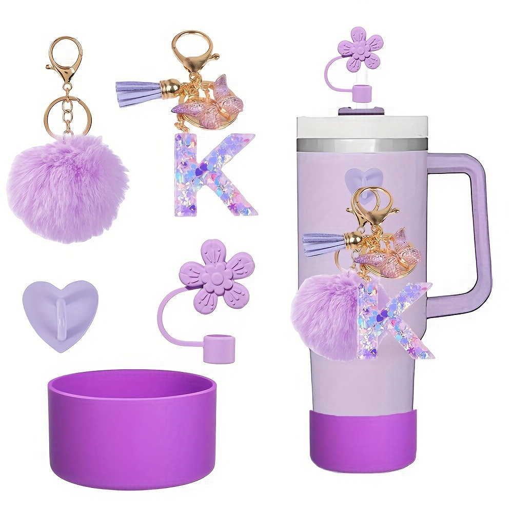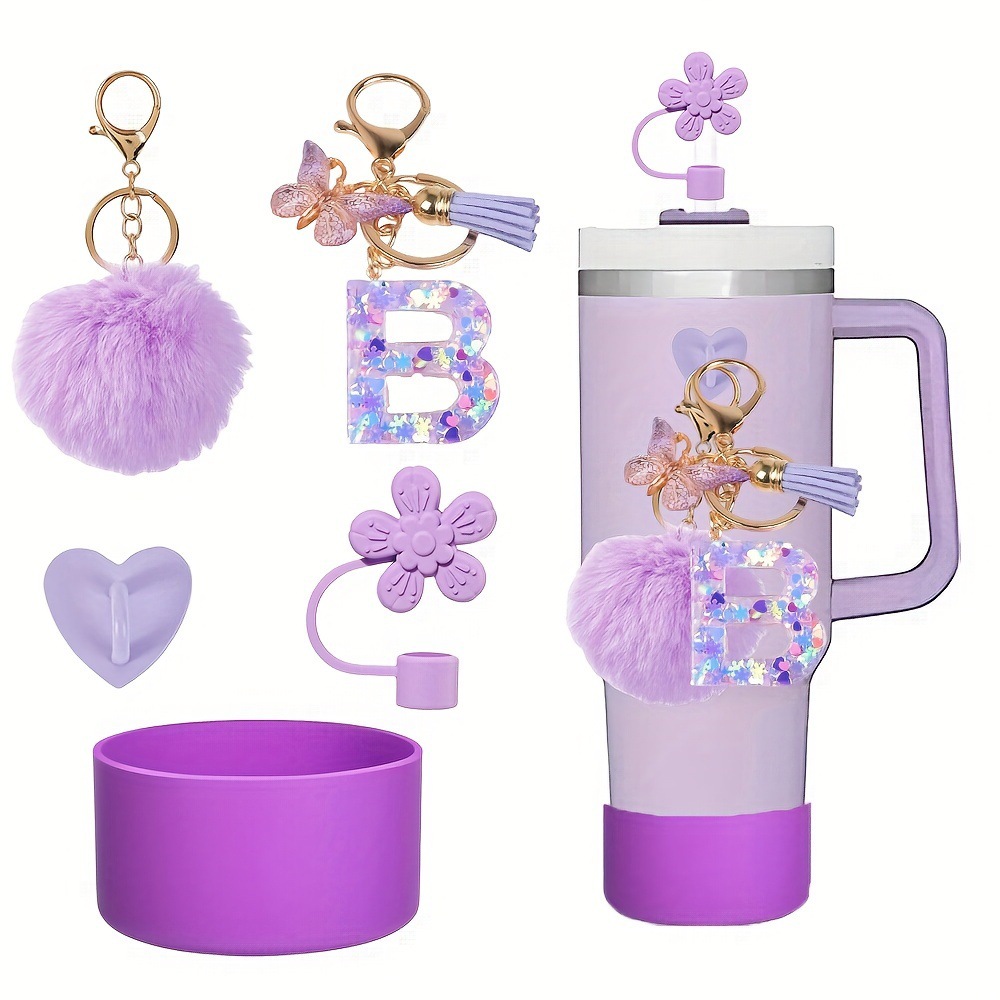 Stanley杯挂件紫色字母钥匙扣花朵吸管帽毛绒球吊坠杯链硅胶杯套