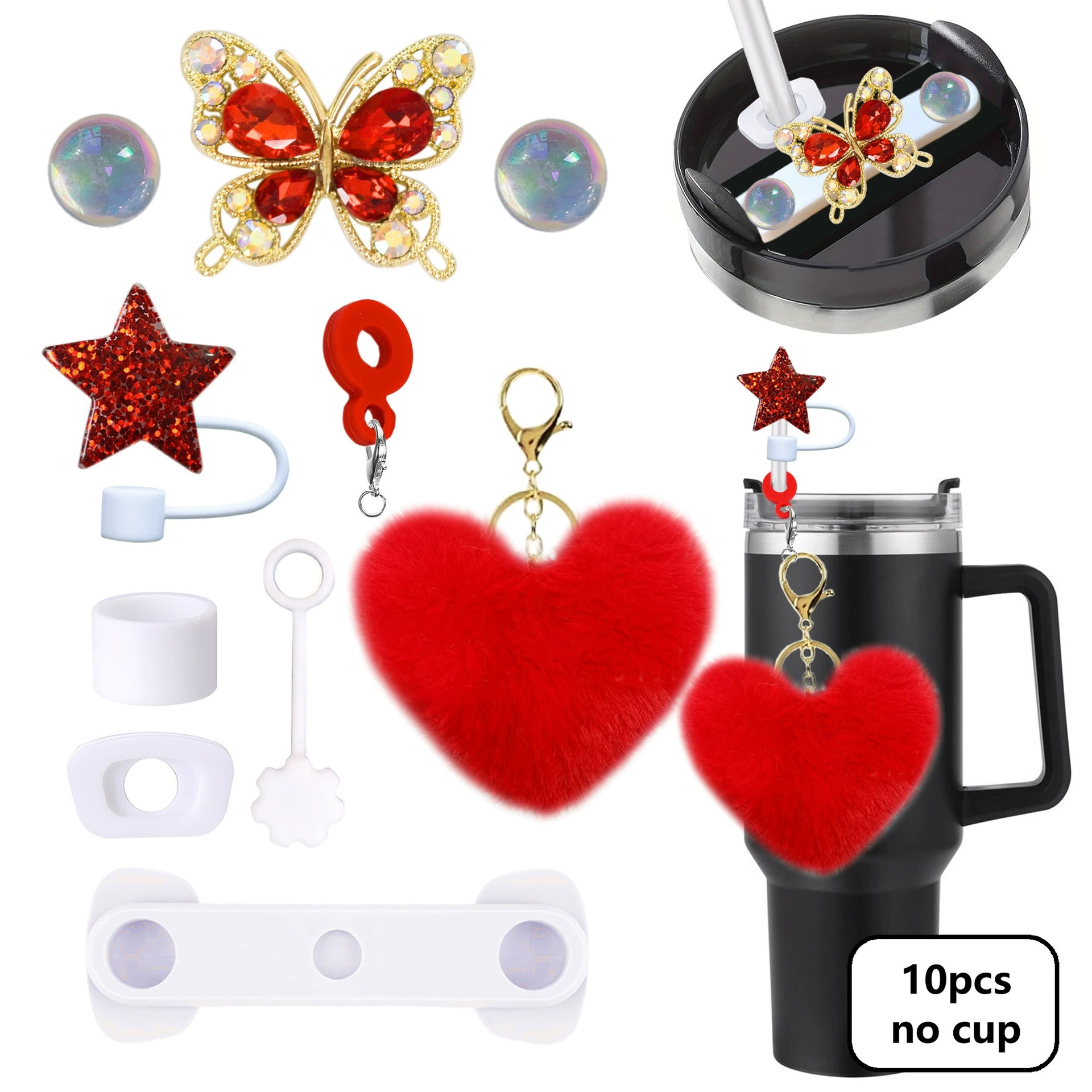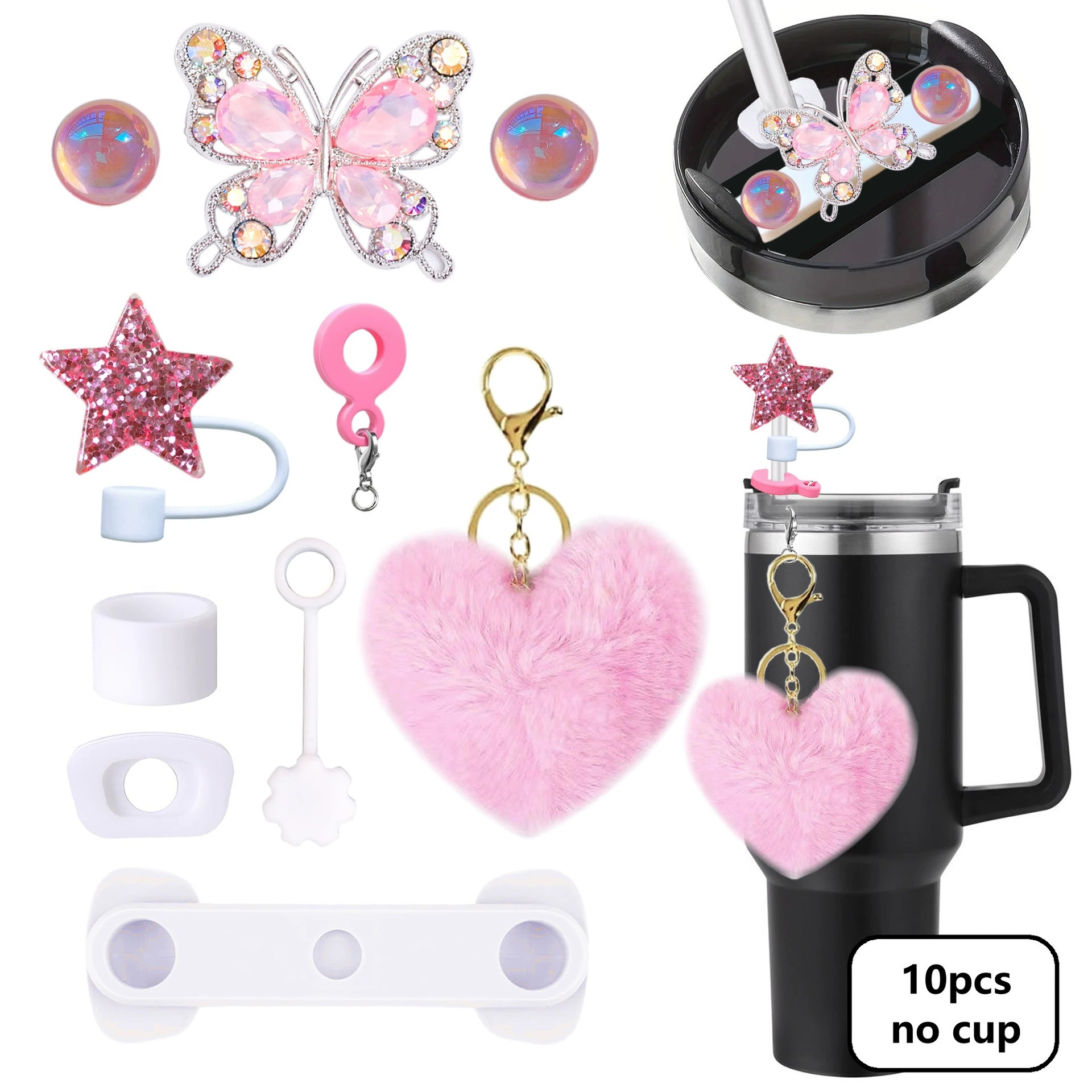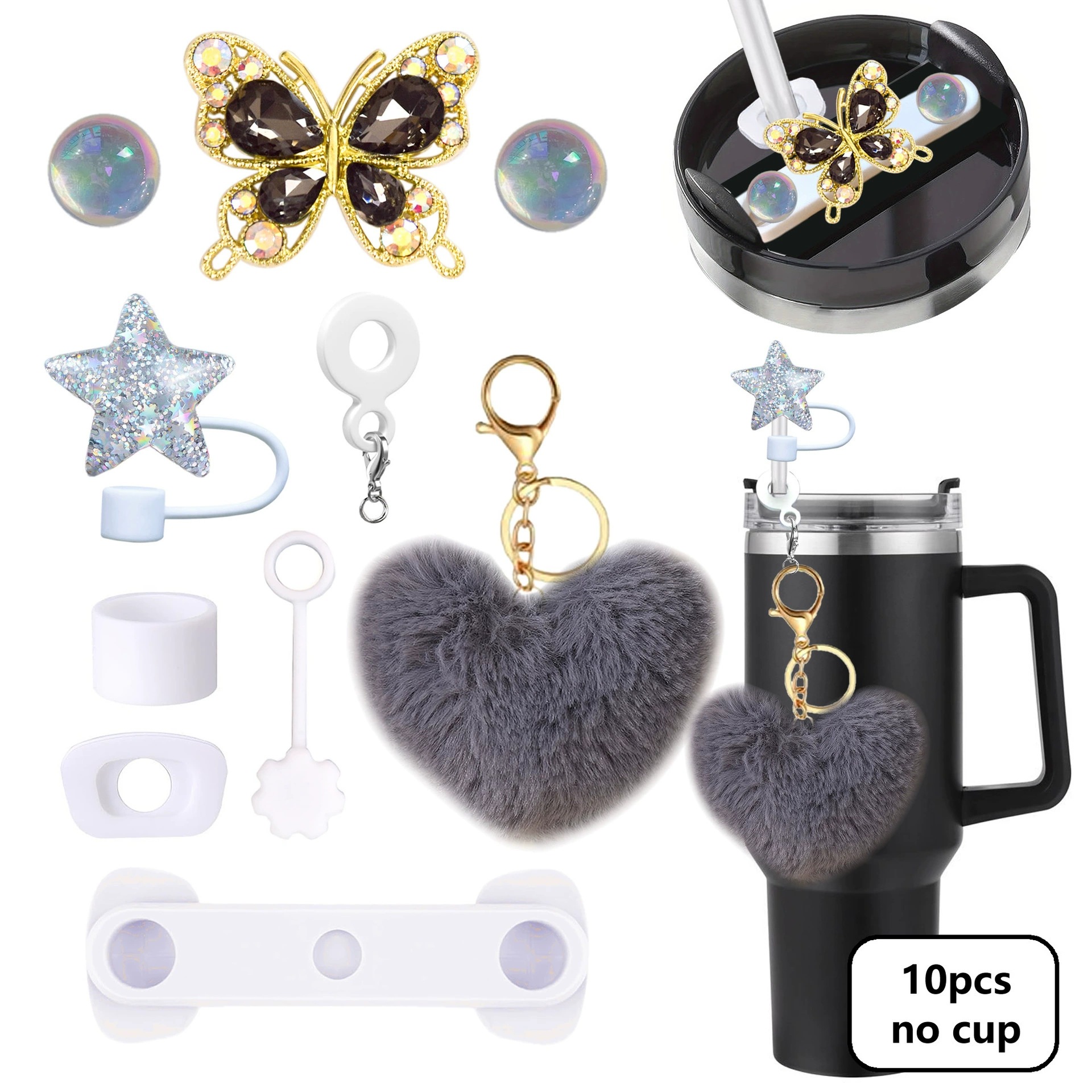 毛绒爱心钥匙扣Stanley杯配饰闪亮星吸管帽40oz硅胶密封防漏杯盖