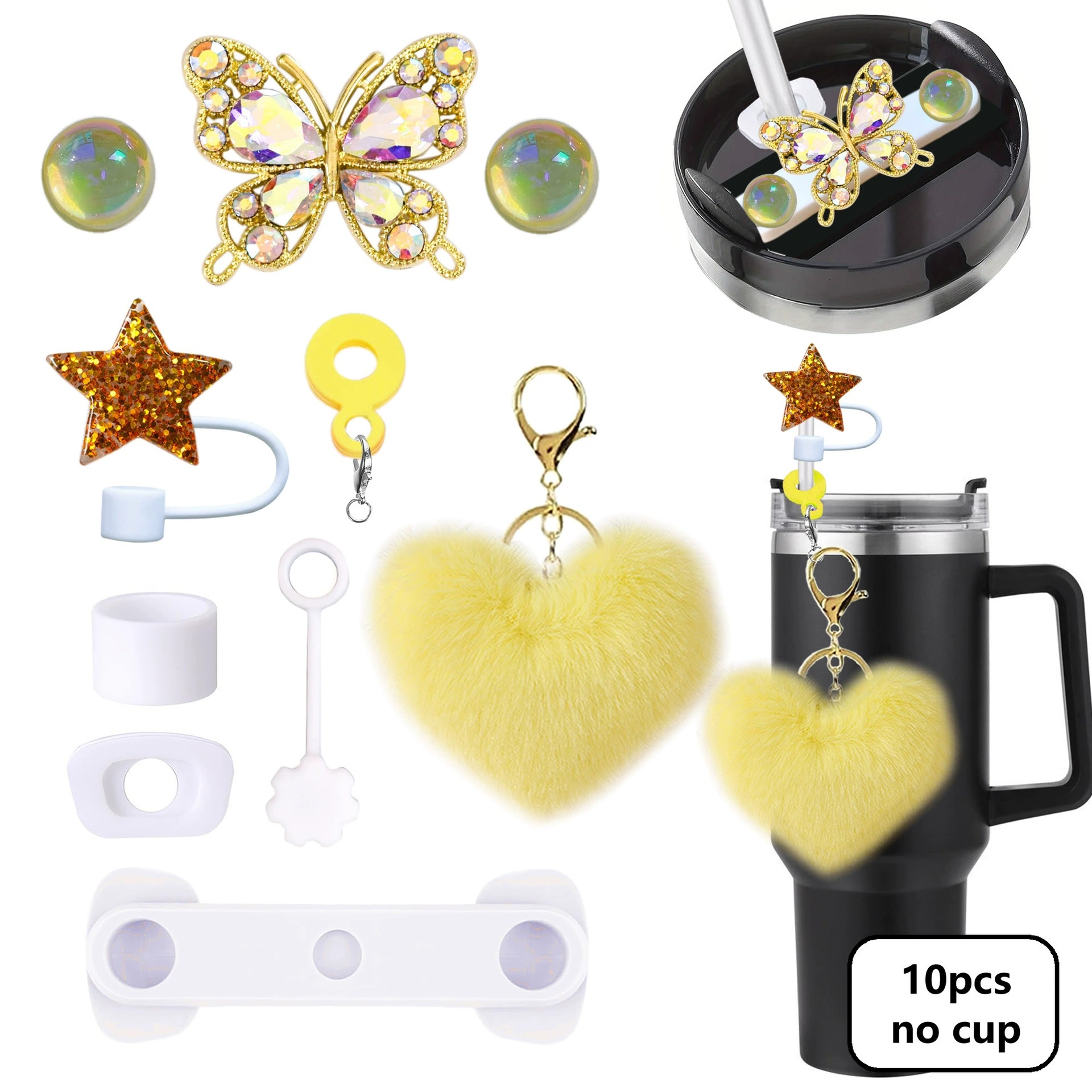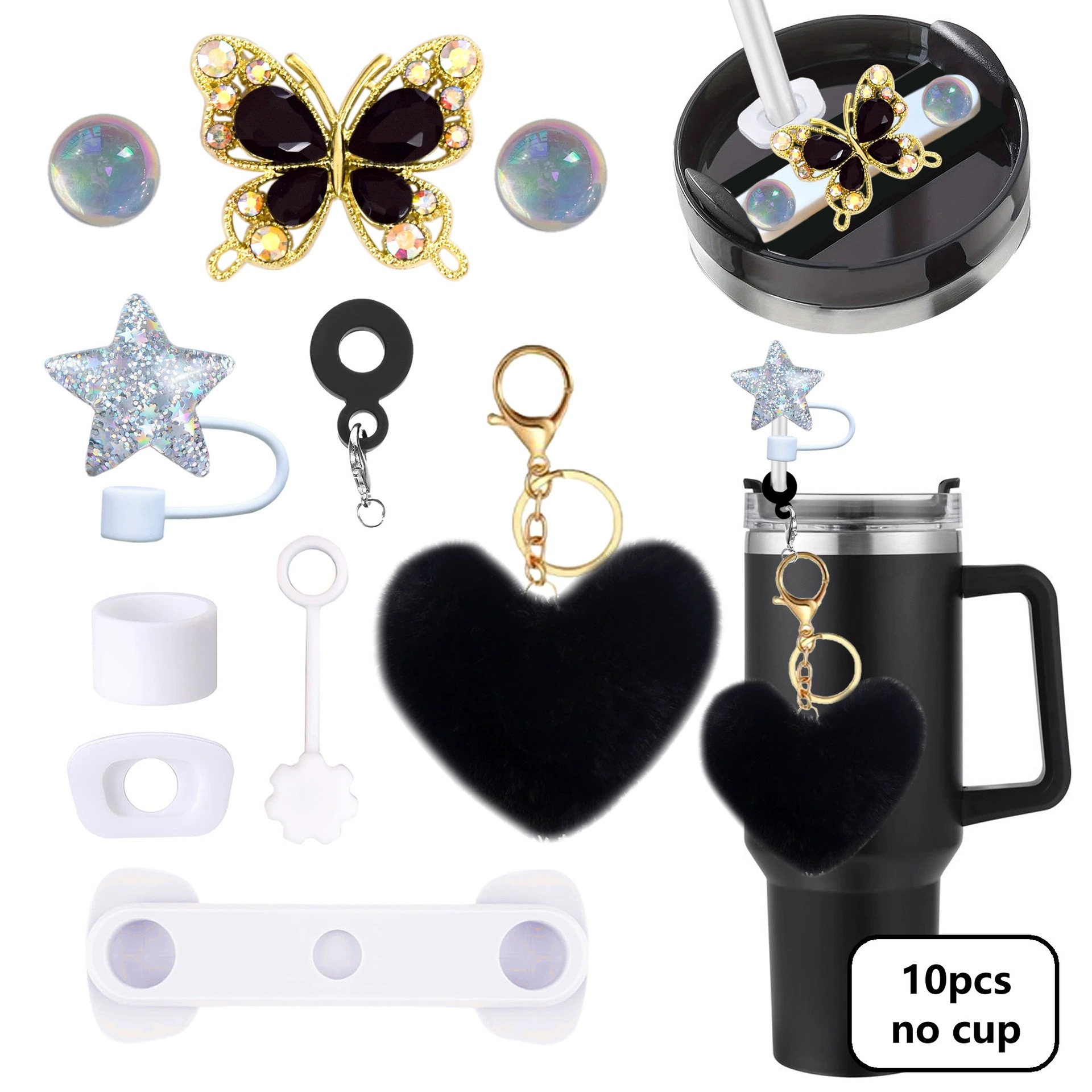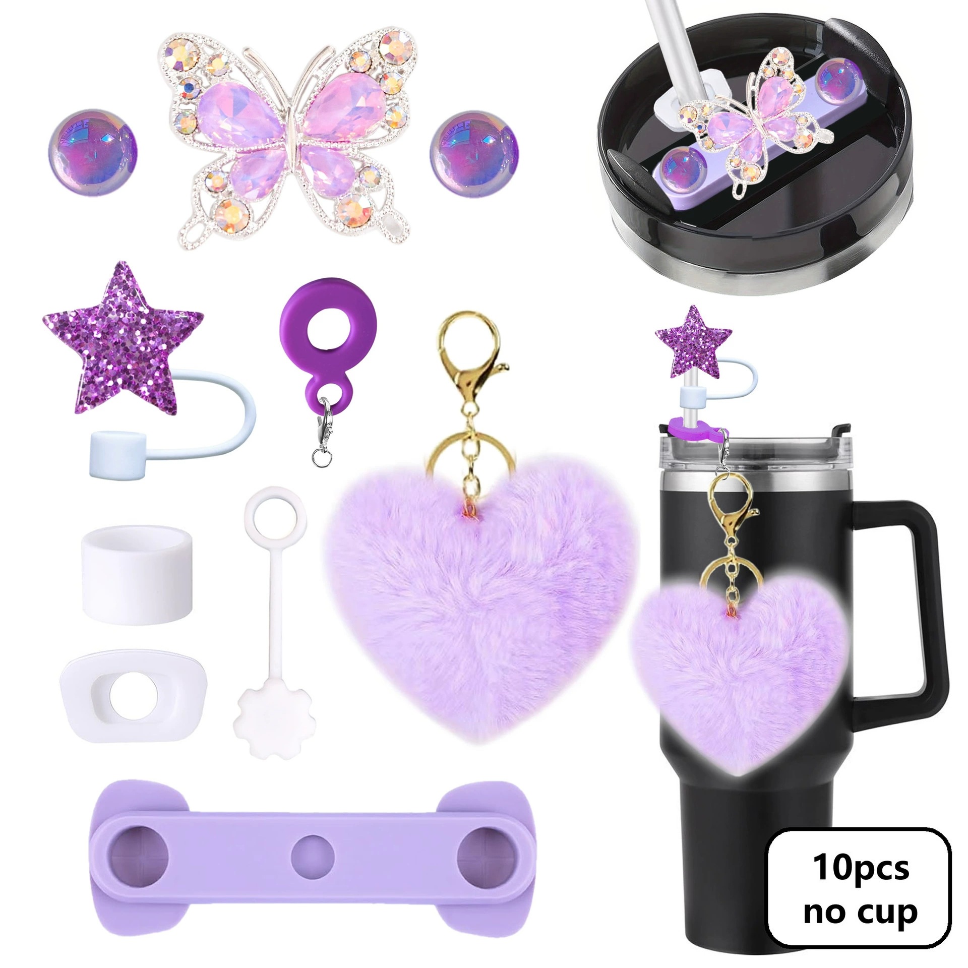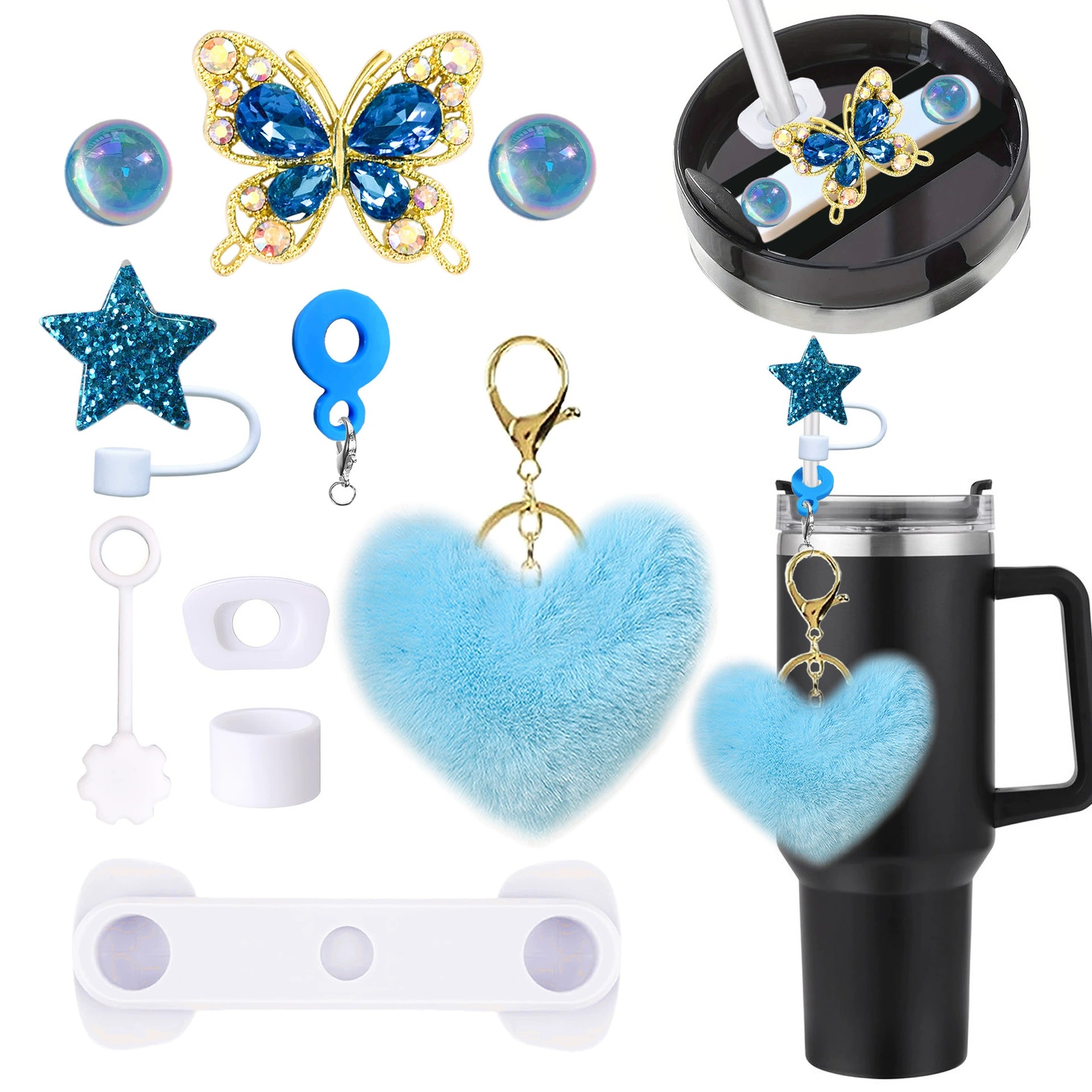 毛绒爱心钥匙扣Stanley杯配饰闪亮星吸管帽40oz硅胶密封防漏杯盖