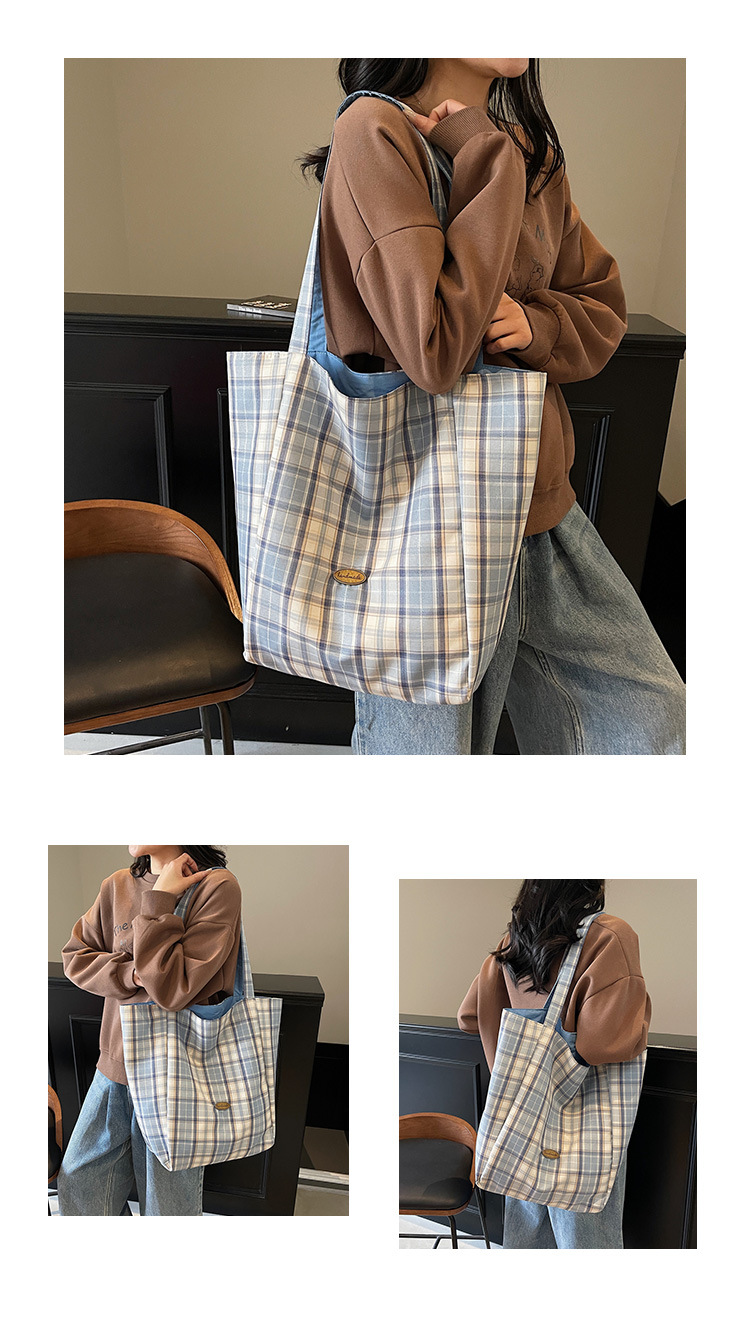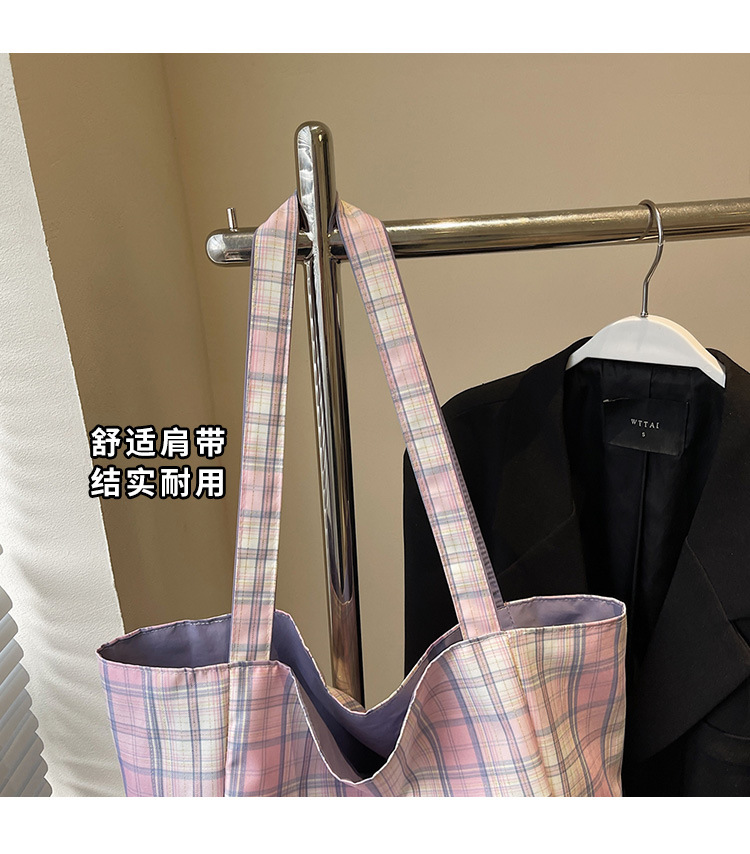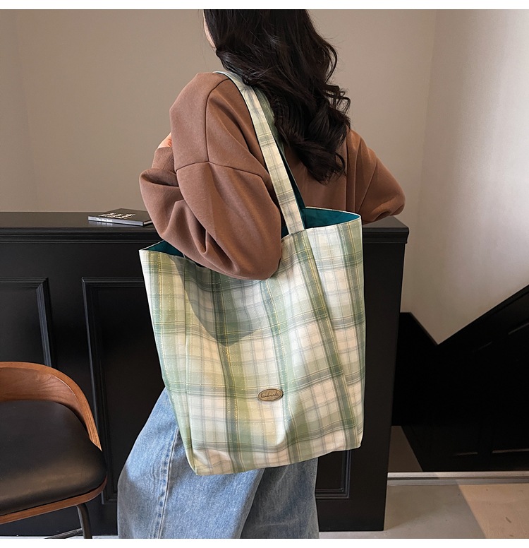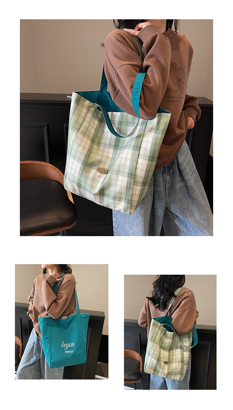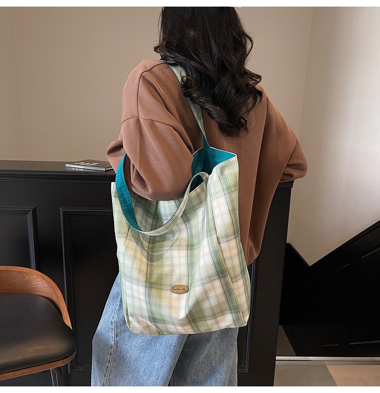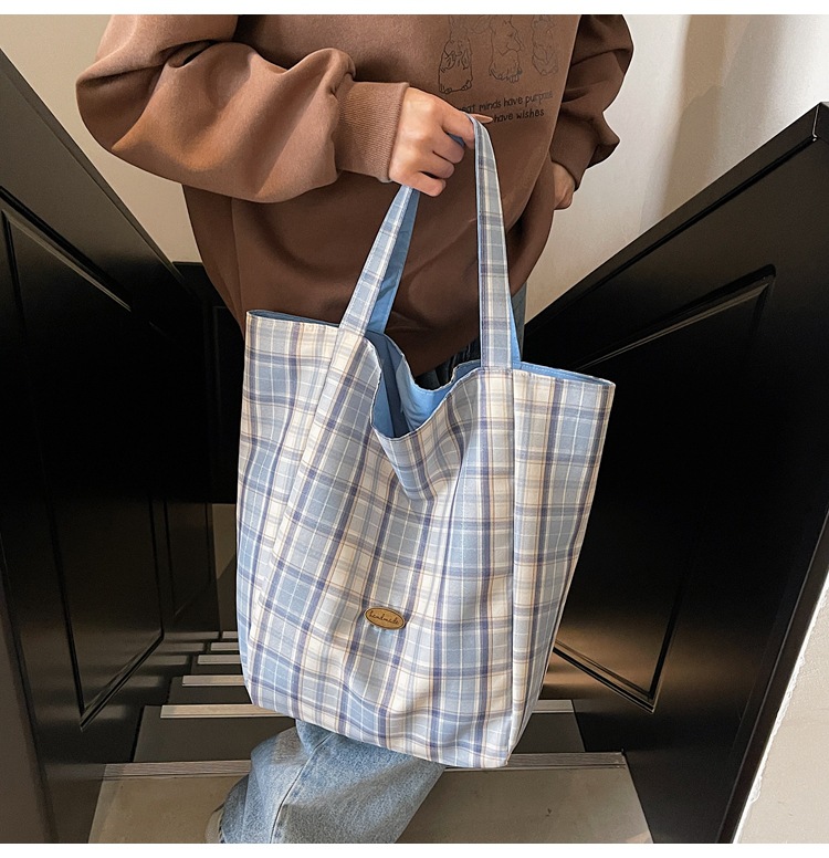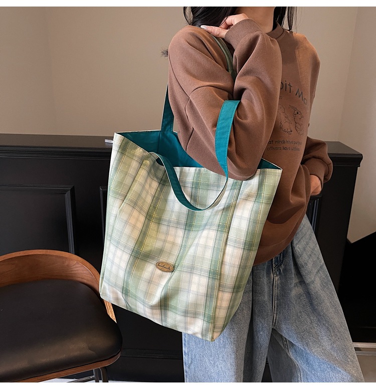 韩版布袋包包女格纹双面手提通勤托特包女士大容量单肩斜挎包