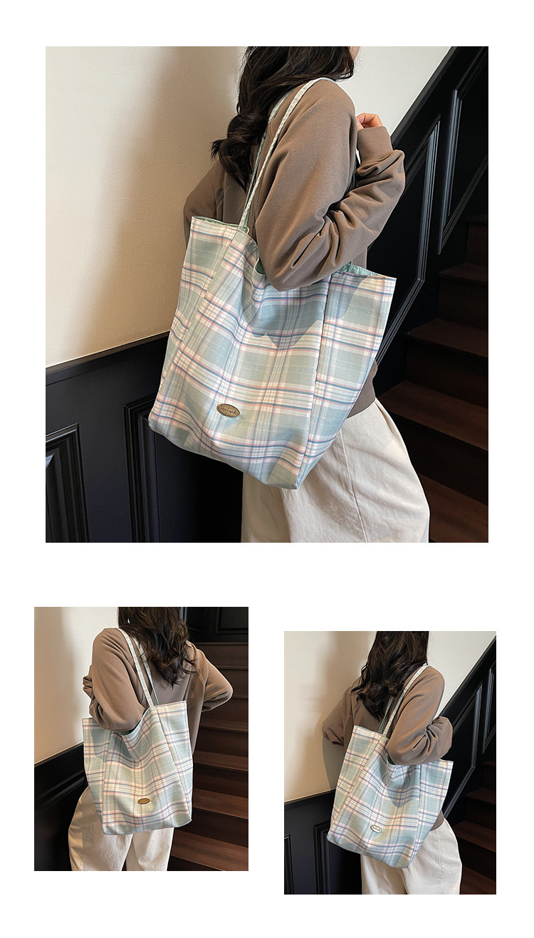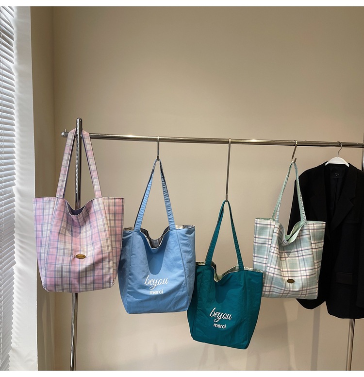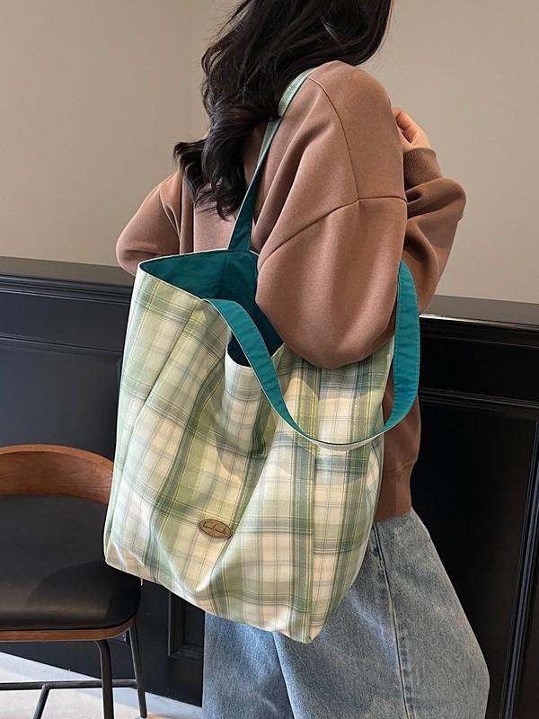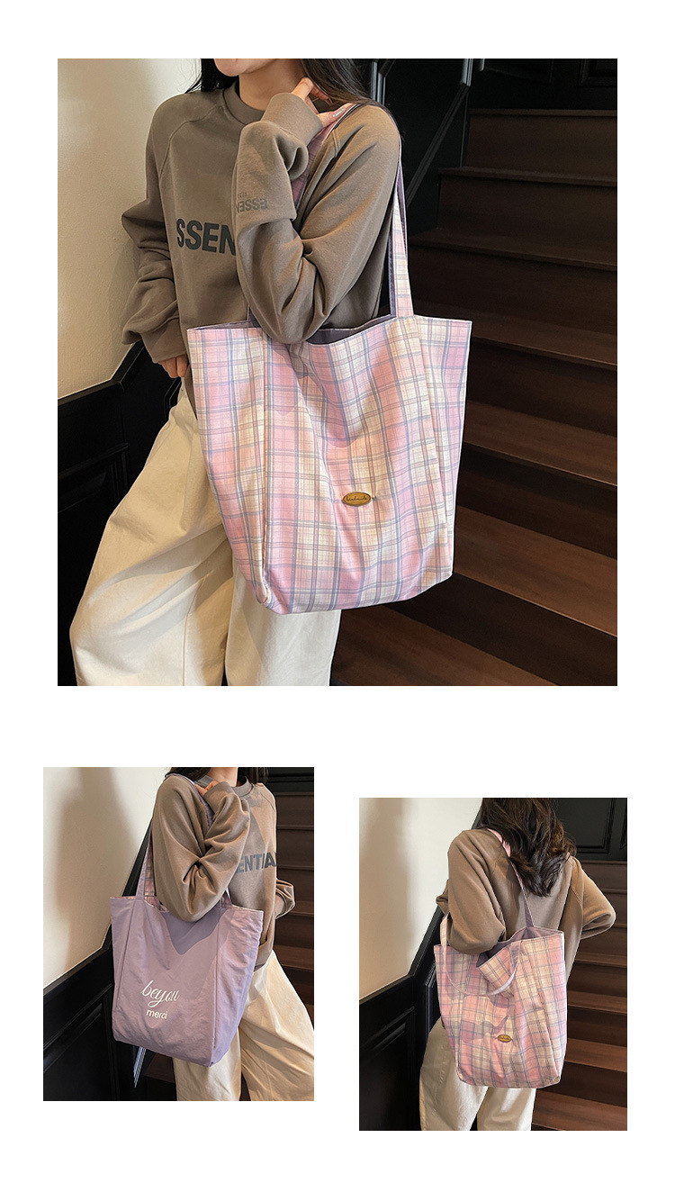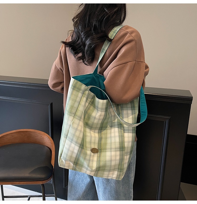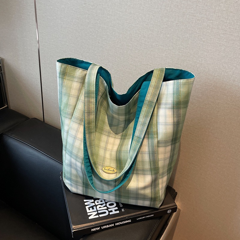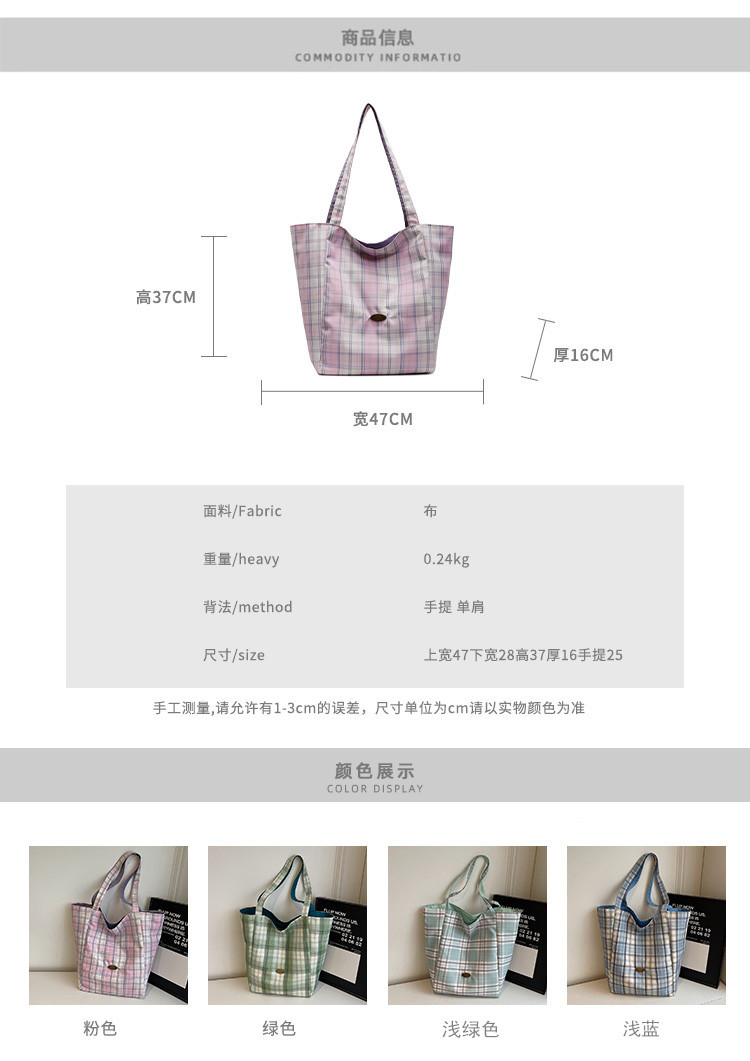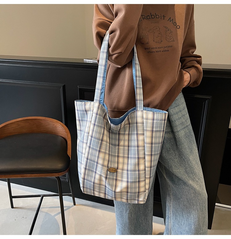 韩版布袋包包女格纹双面手提通勤托特包女士大容量单肩斜挎包