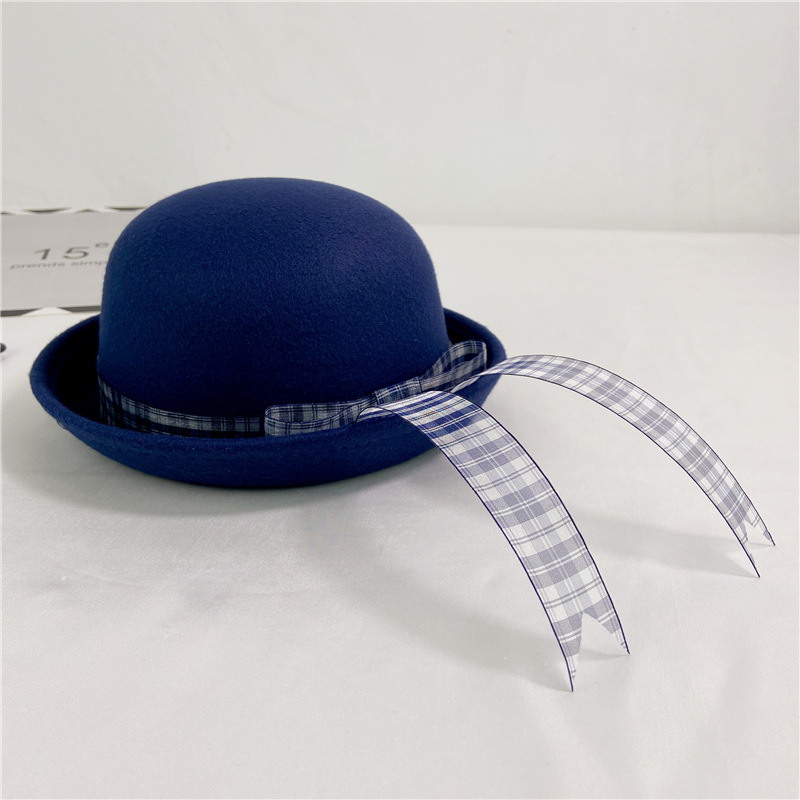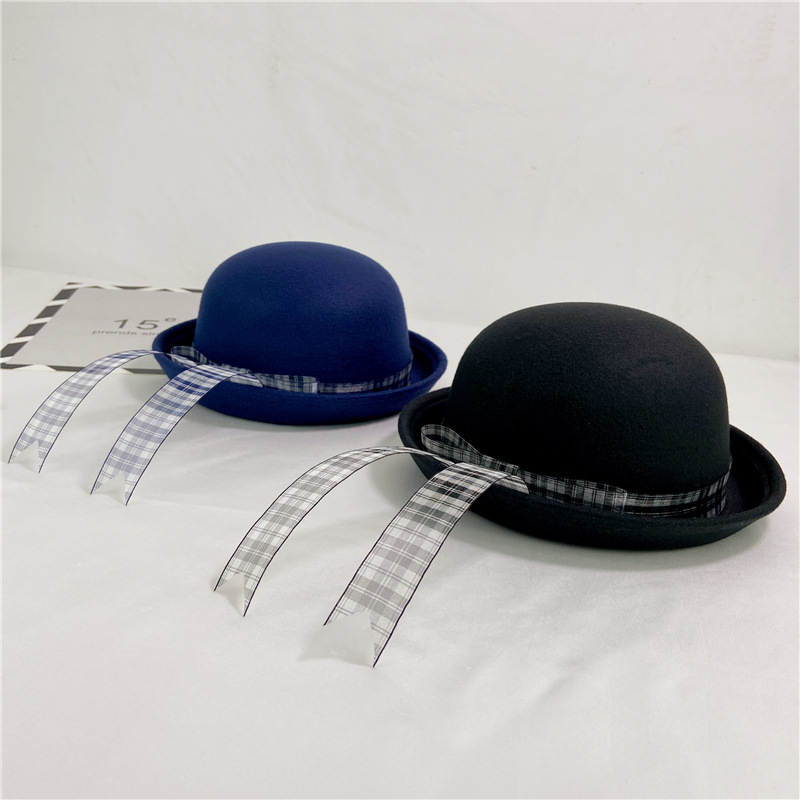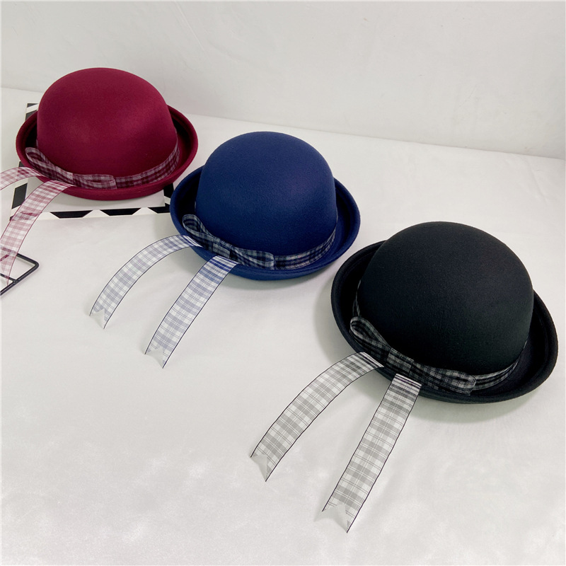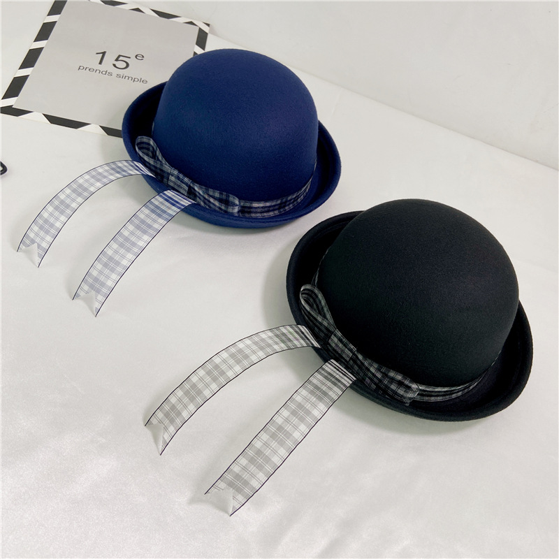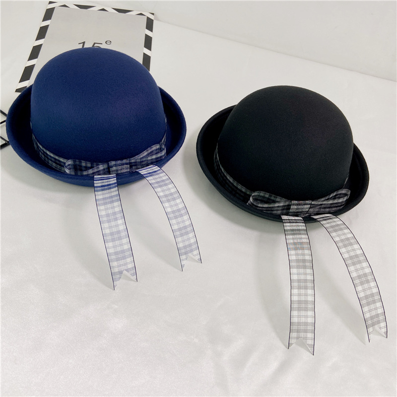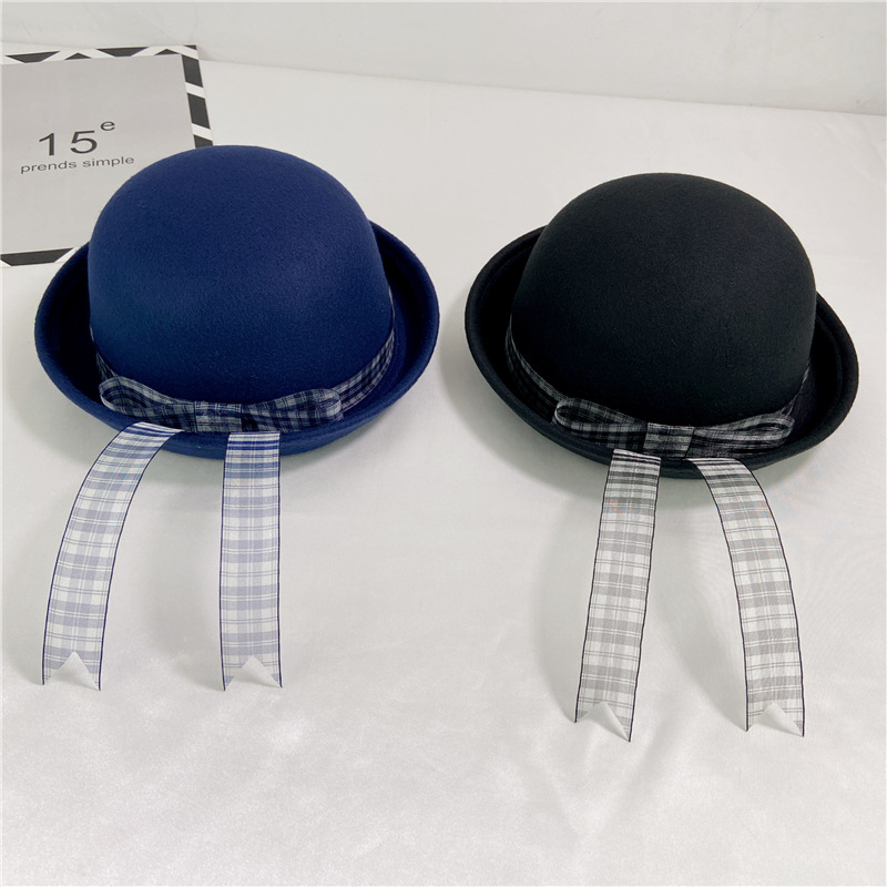 日本校供感手作jkdk制服帽毛呢学院风格子蝴蝶结飘带幼稚园帽子