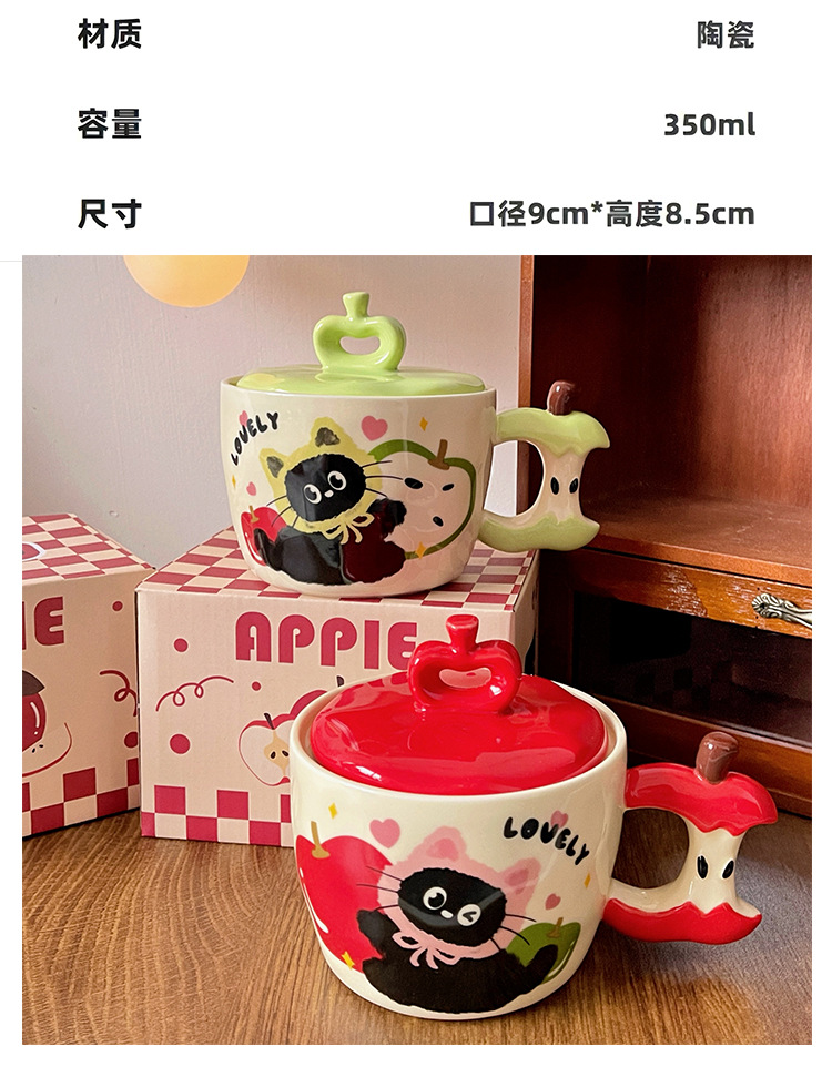生日礼物苹果猫咪马克杯带盖陶瓷杯早餐家用可爱创意喝水杯圣诞节