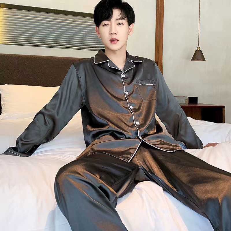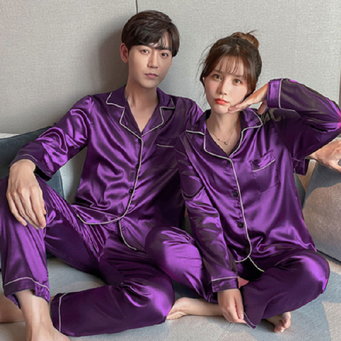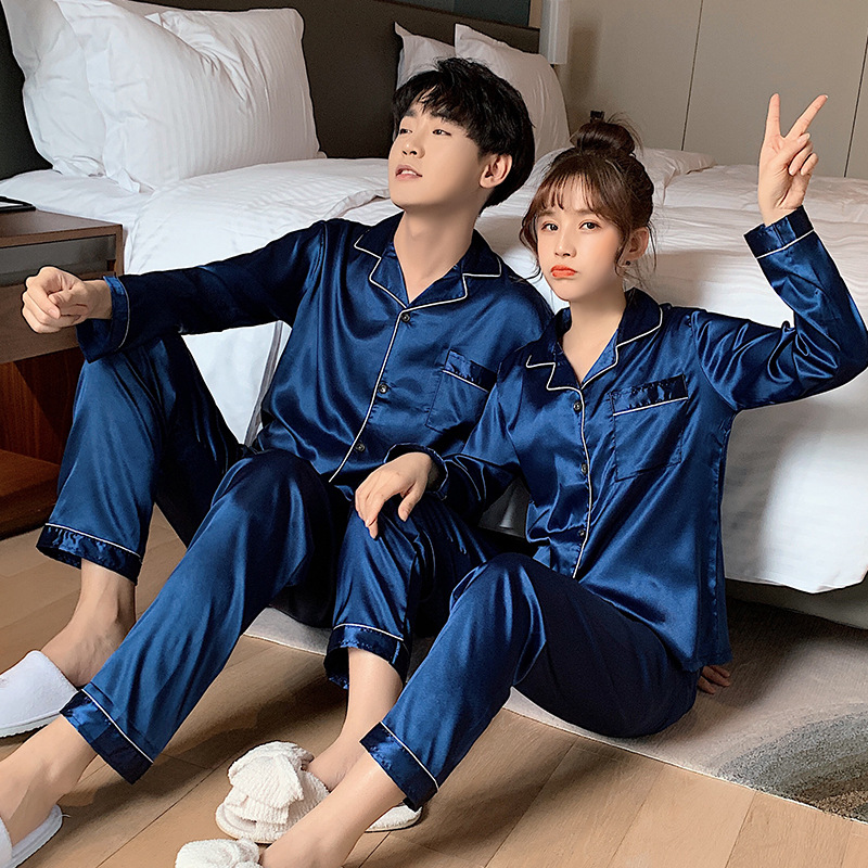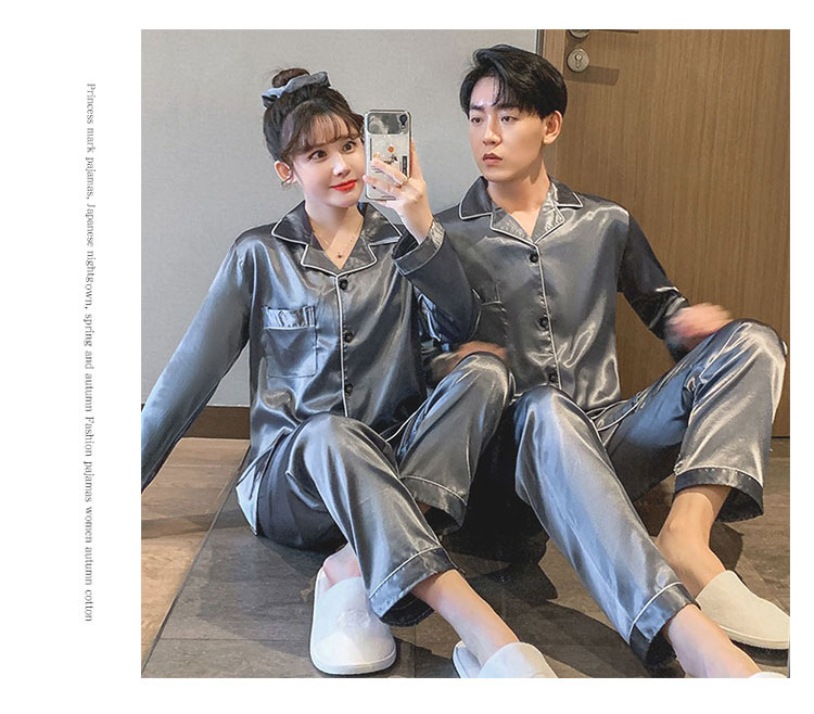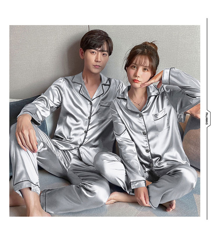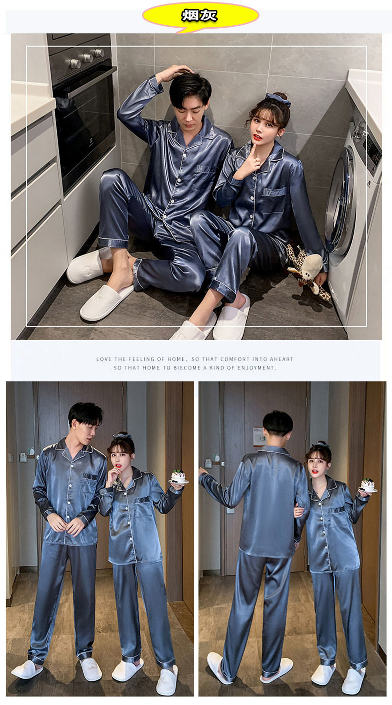 情侣睡衣冰丝长袖长裤春秋薄款宽松大码纯色简约仿真丝家居服套装
