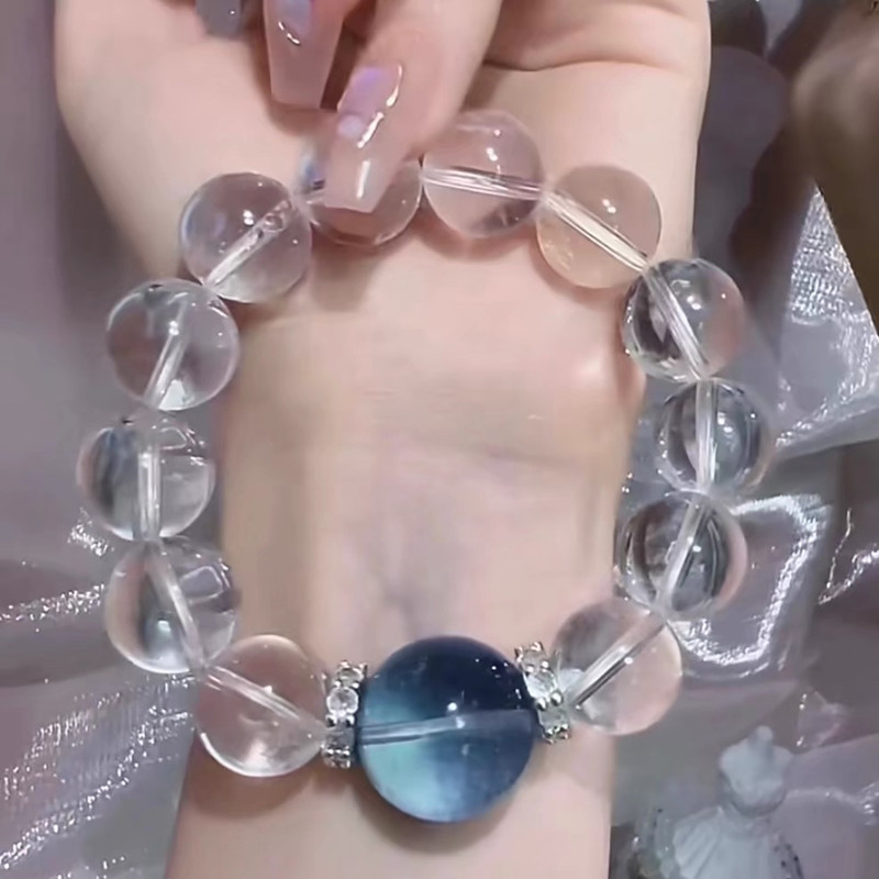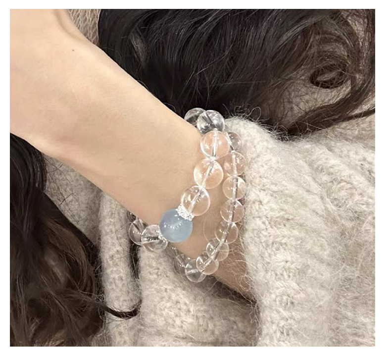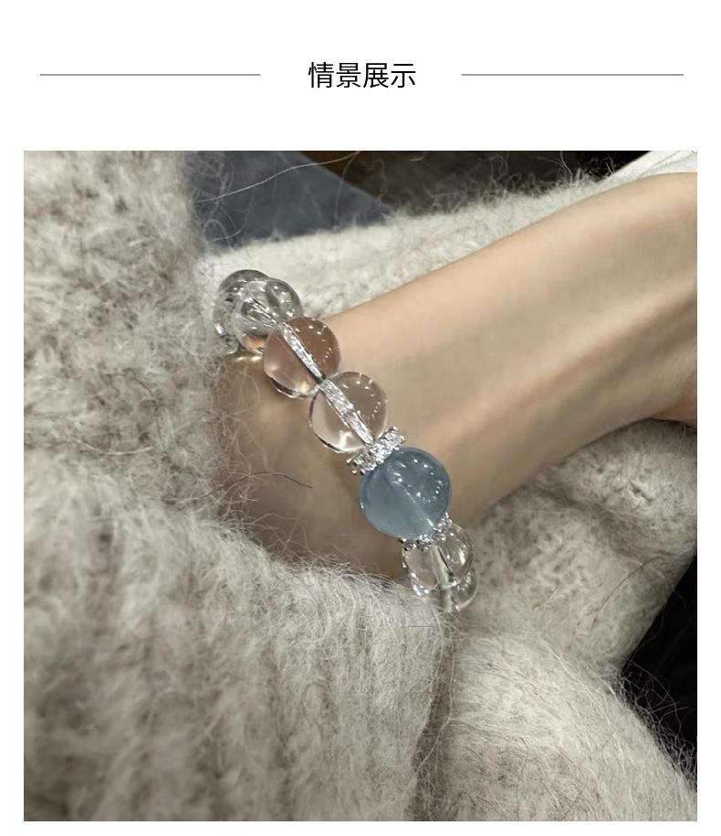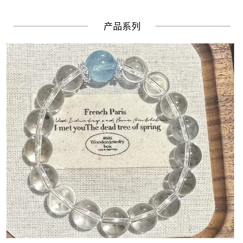 天然白水晶圆珠12mm单圈手串搭配海蓝宝单珠手链女款饰品清新时尚