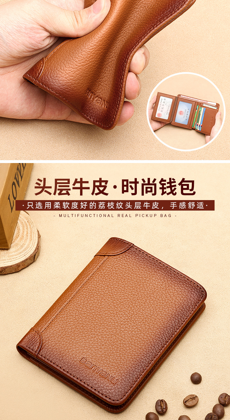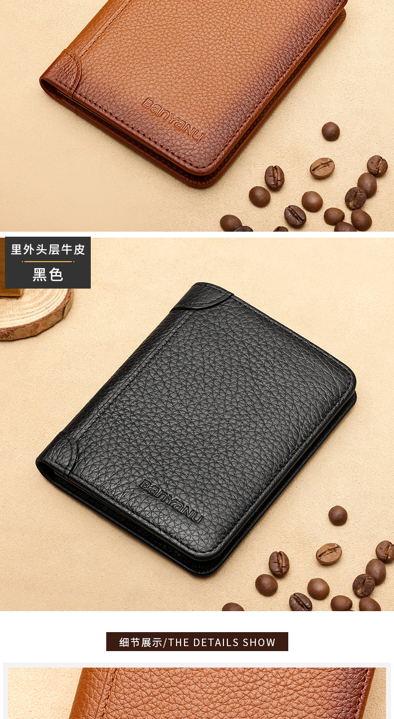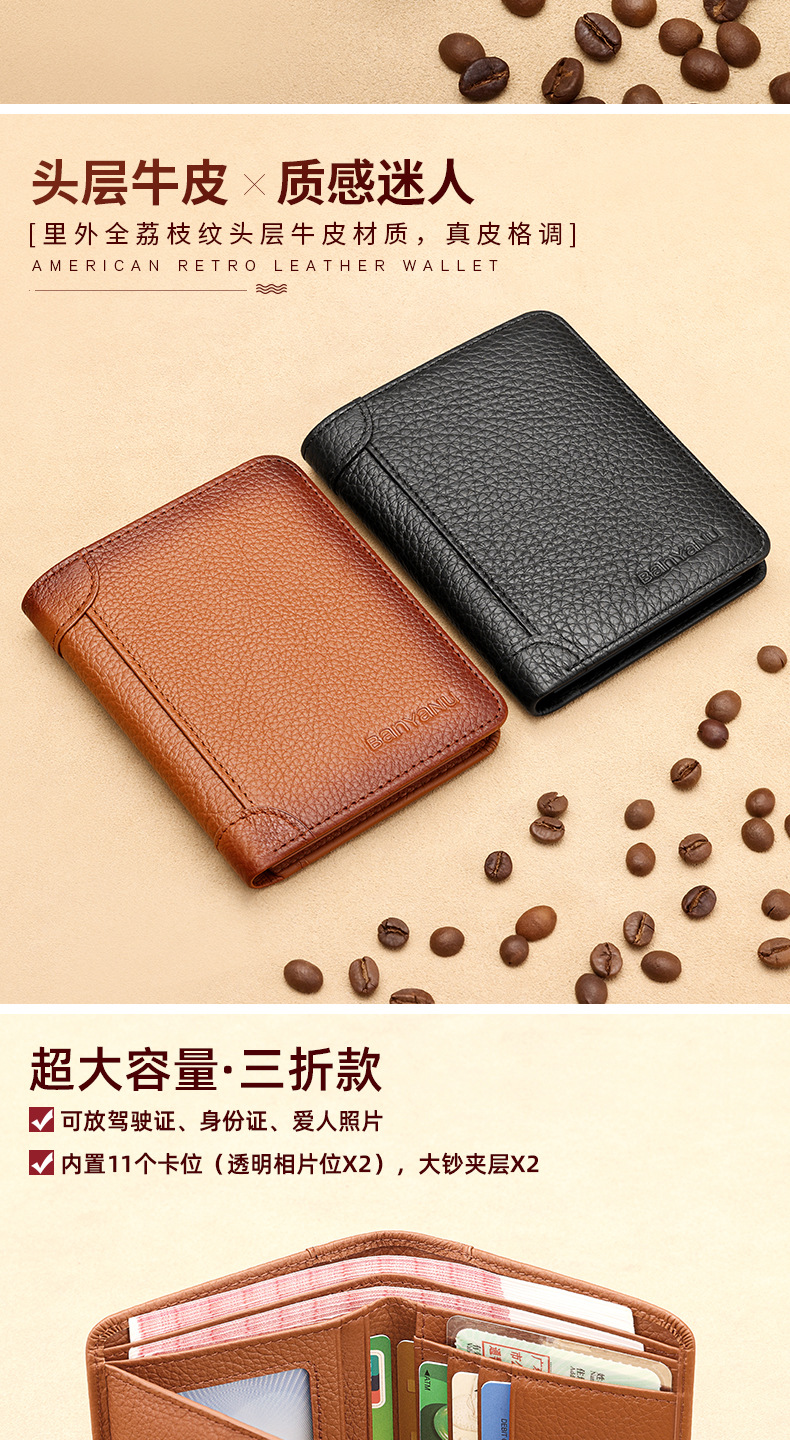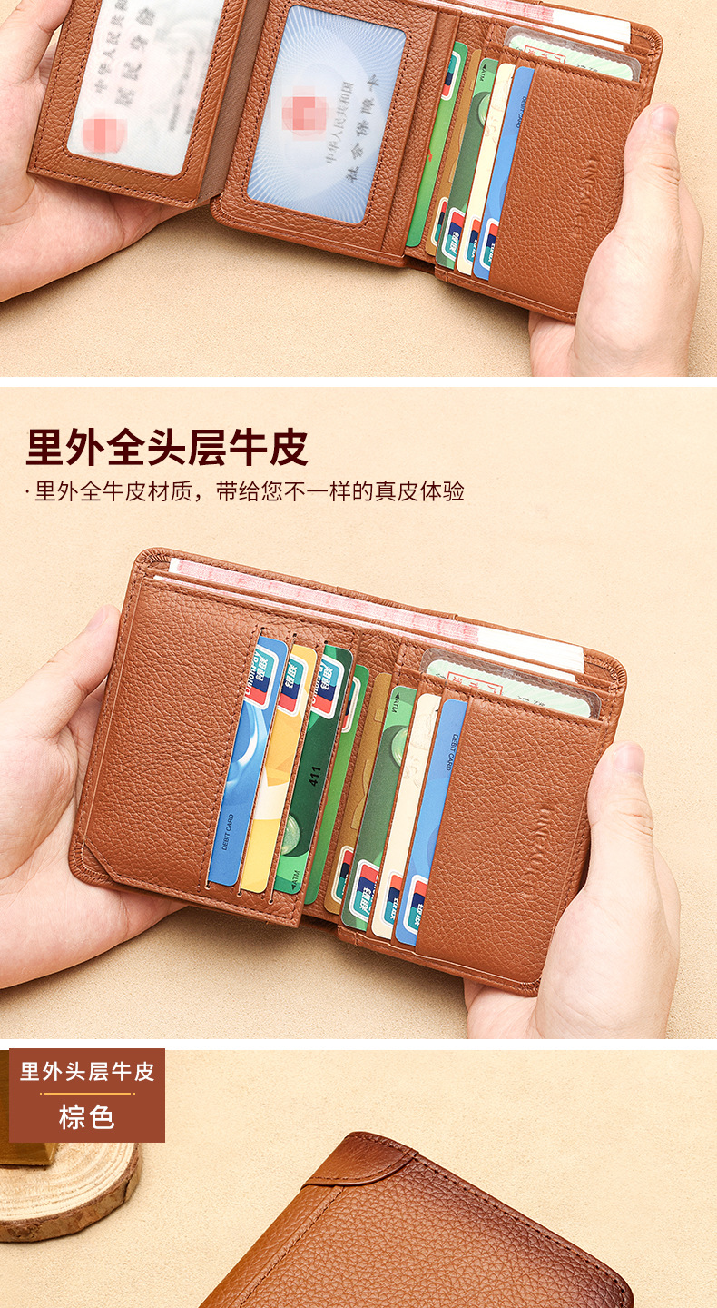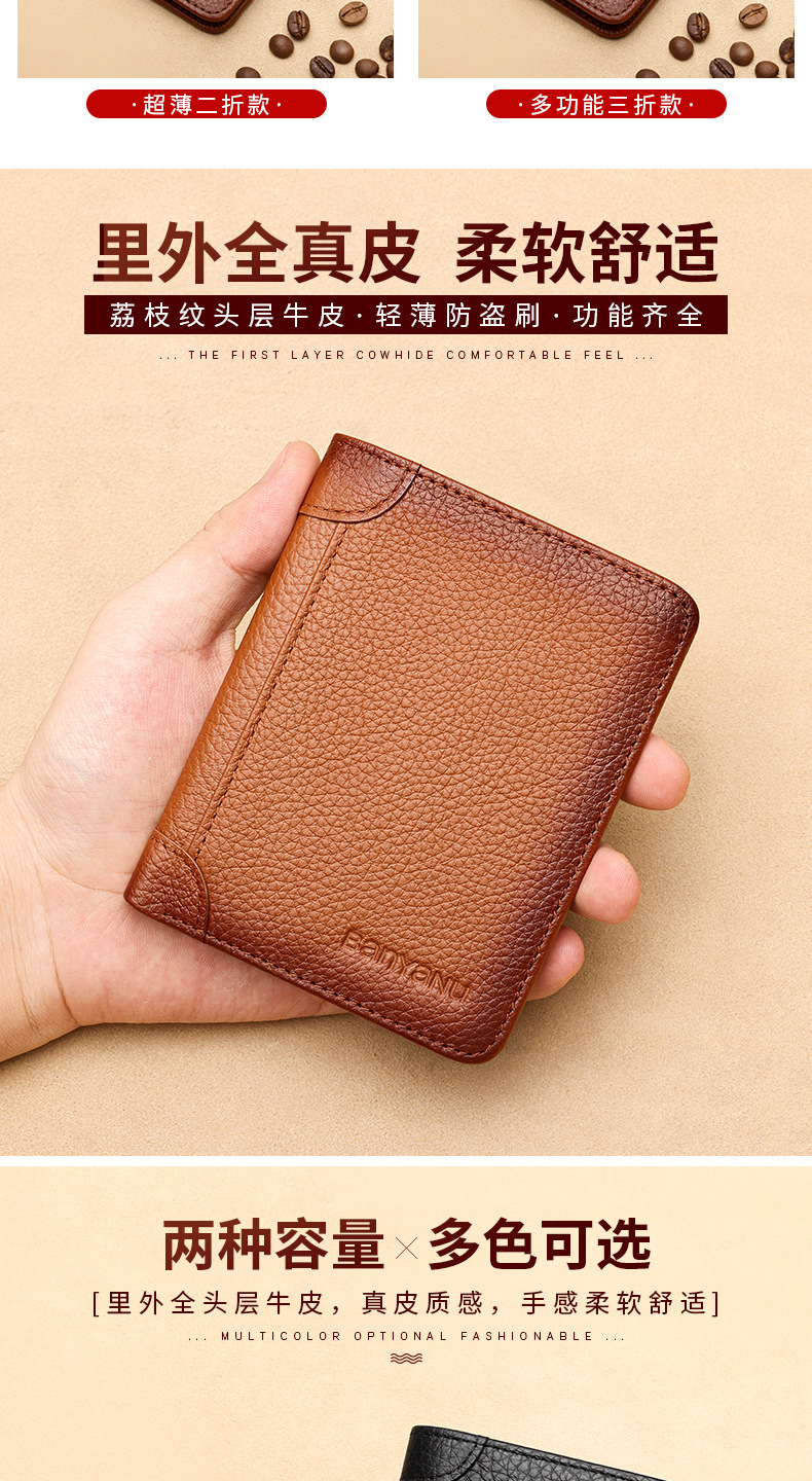 跨境专供擦色荔枝纹牛皮男士钱包防盗刷超薄头层牛皮短款男式钱夹