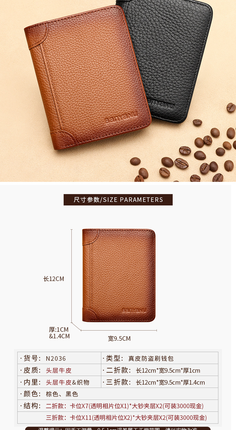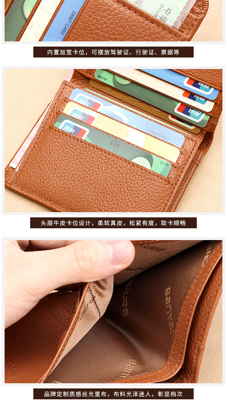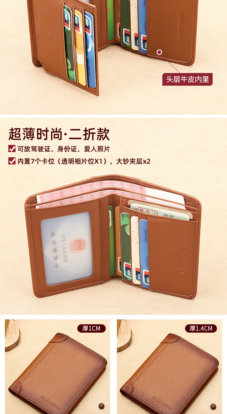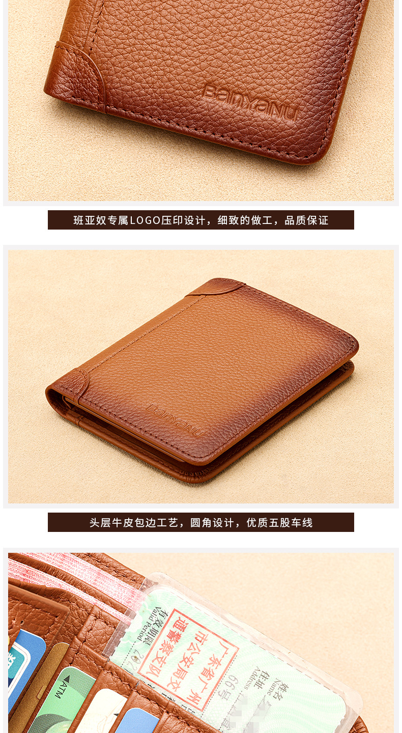 跨境专供擦色荔枝纹牛皮男士钱包防盗刷超薄头层牛皮短款男式钱夹