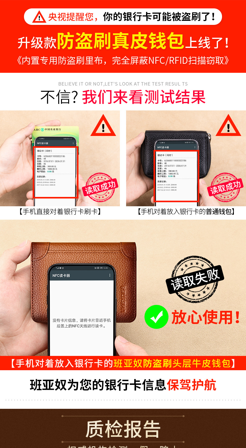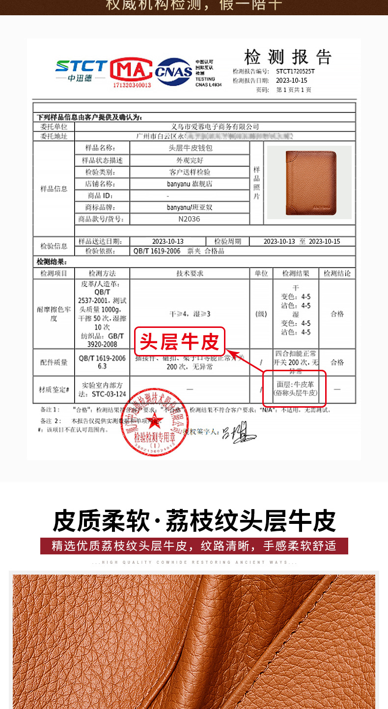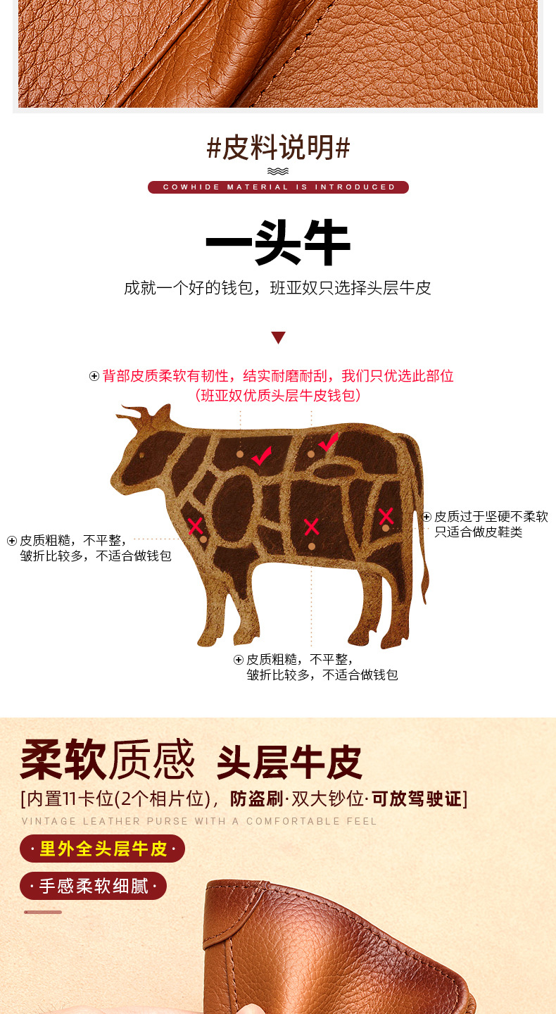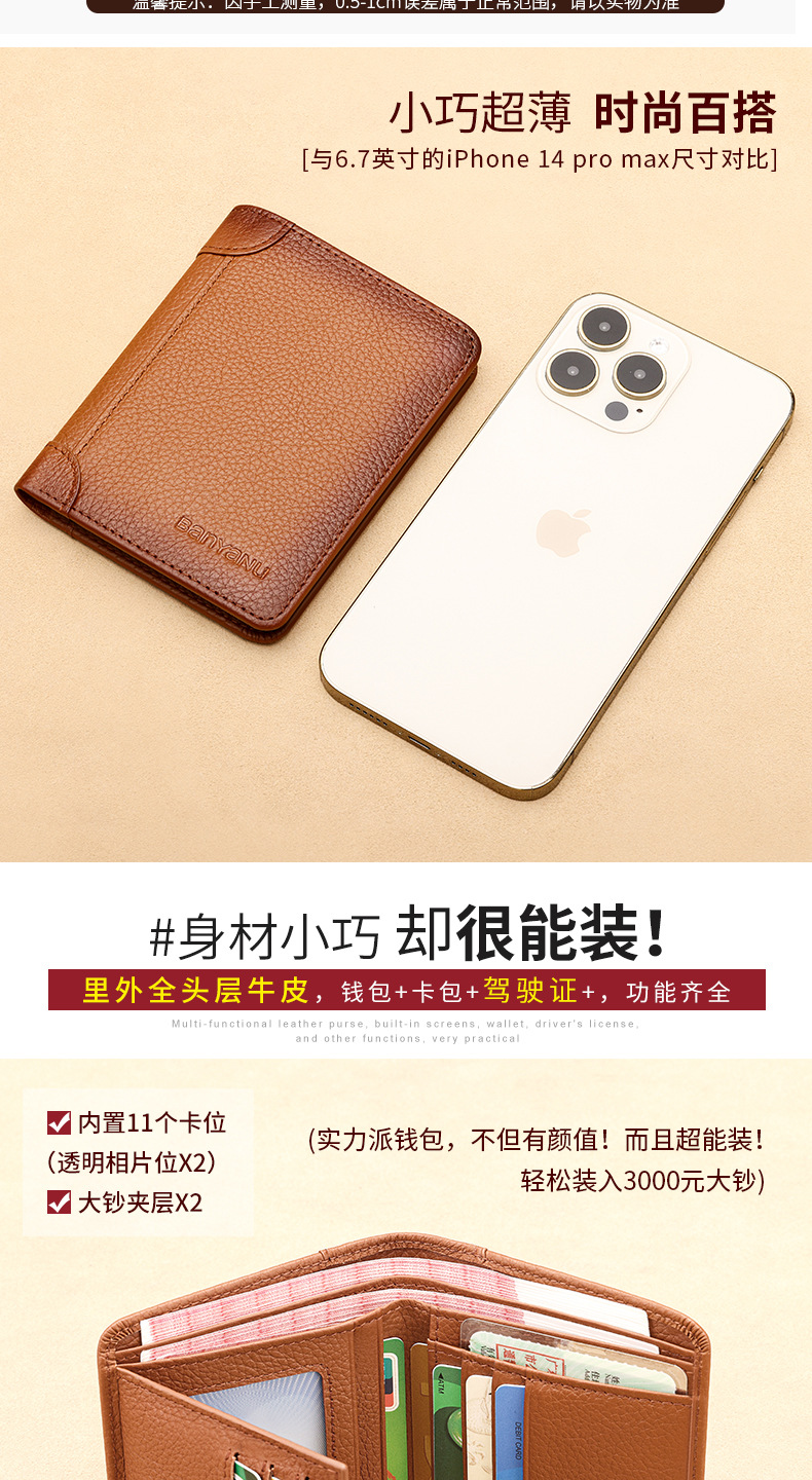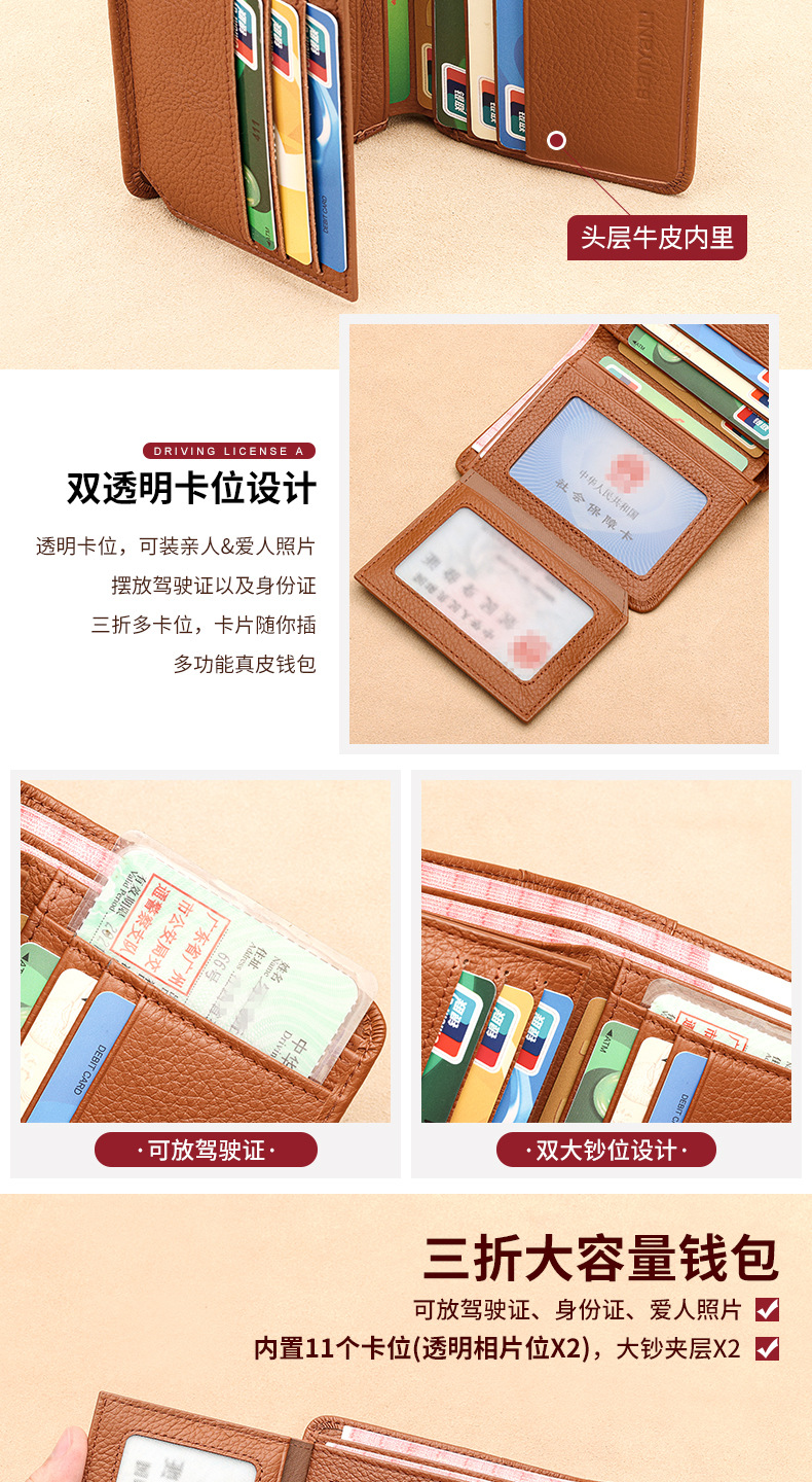 跨境专供擦色荔枝纹牛皮男士钱包防盗刷超薄头层牛皮短款男式钱夹