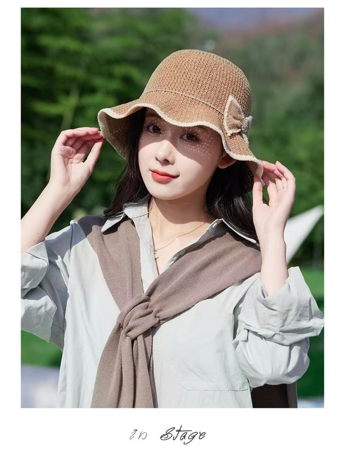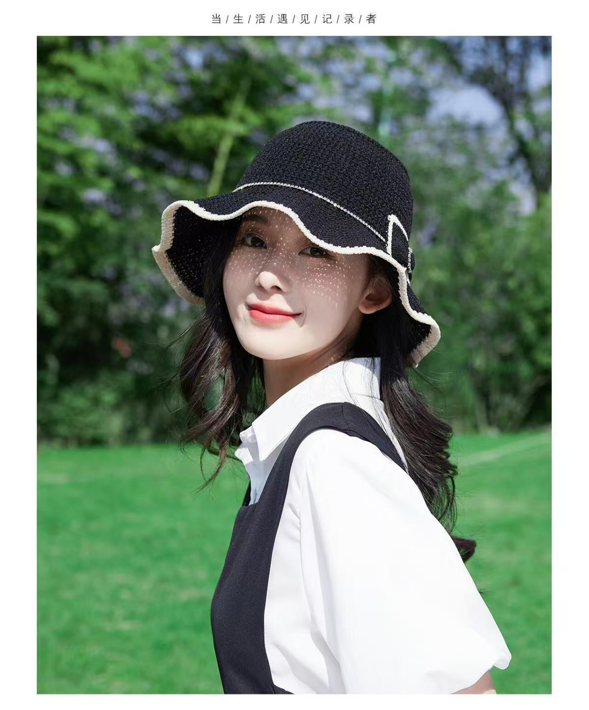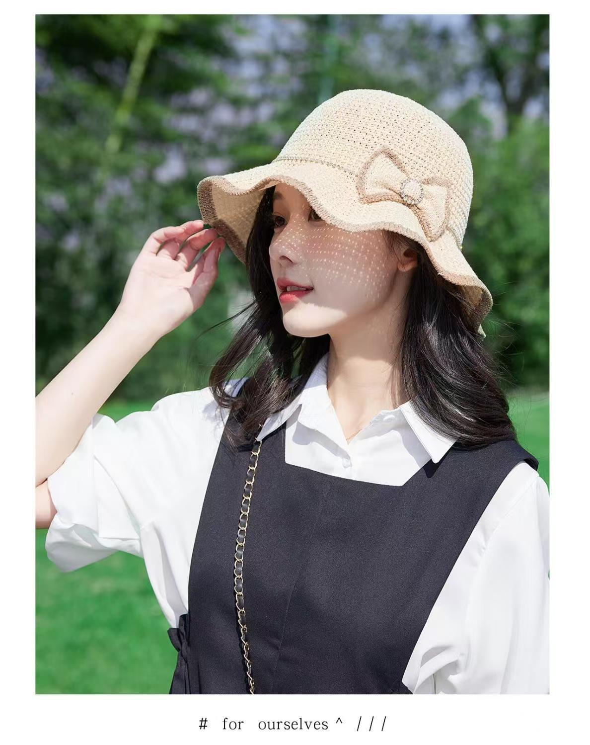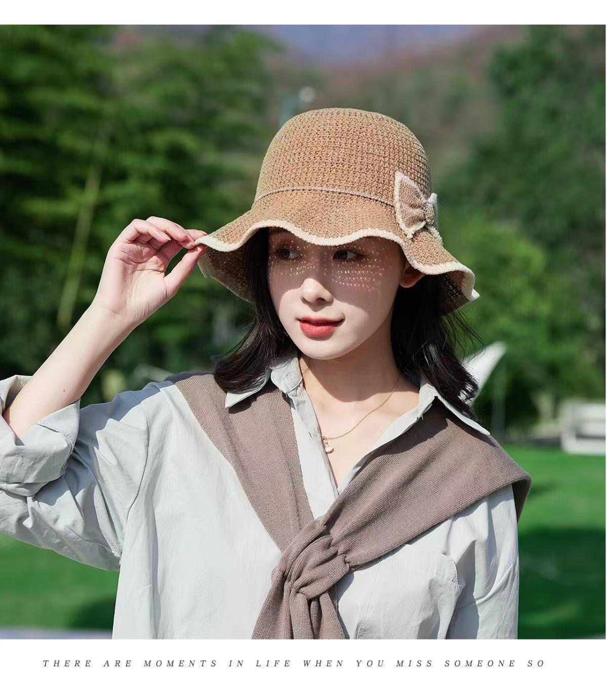 荷叶边镂空渔夫帽女新款夏季时尚简约蝴蝶结遮阳可折叠防晒太阳帽