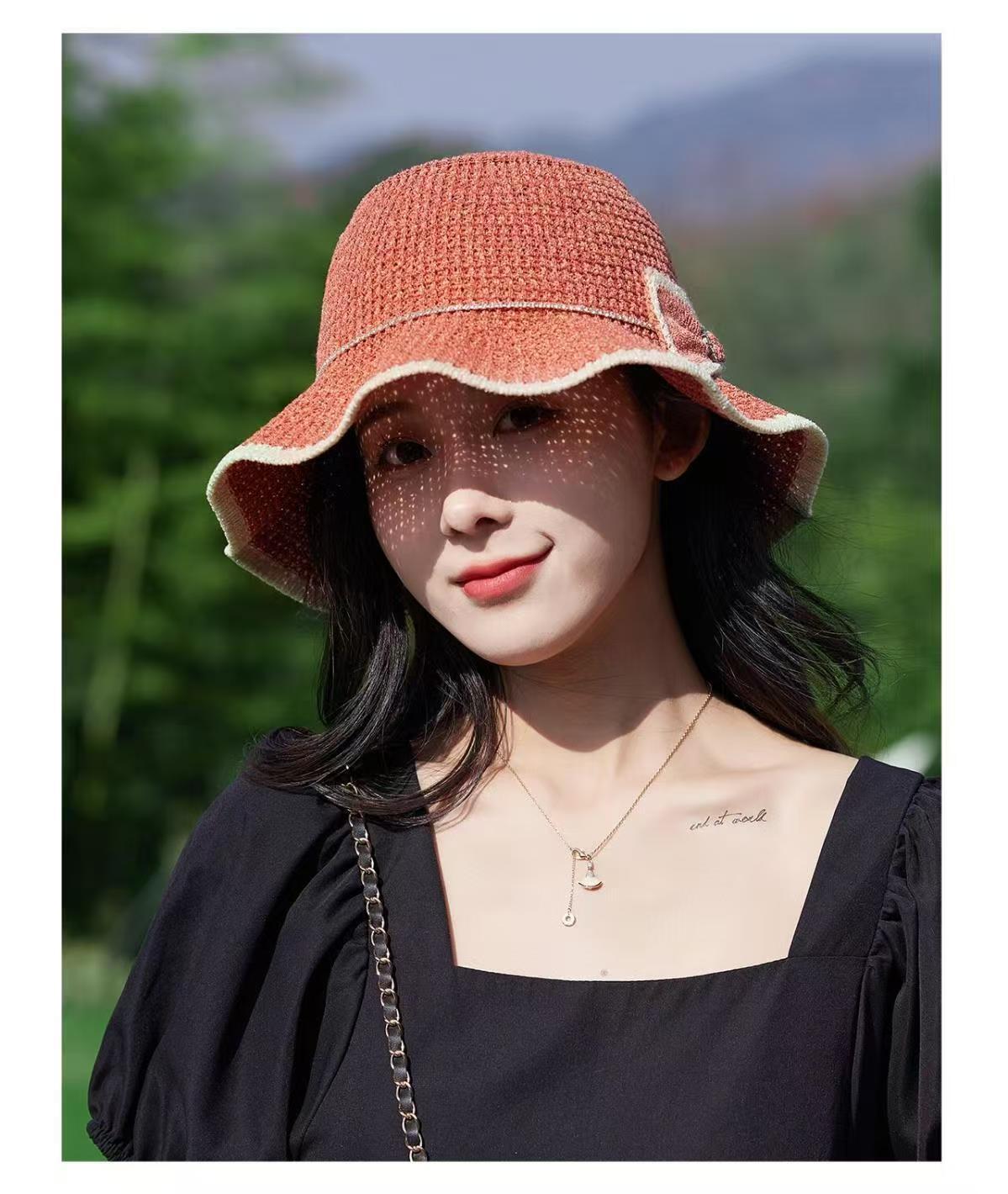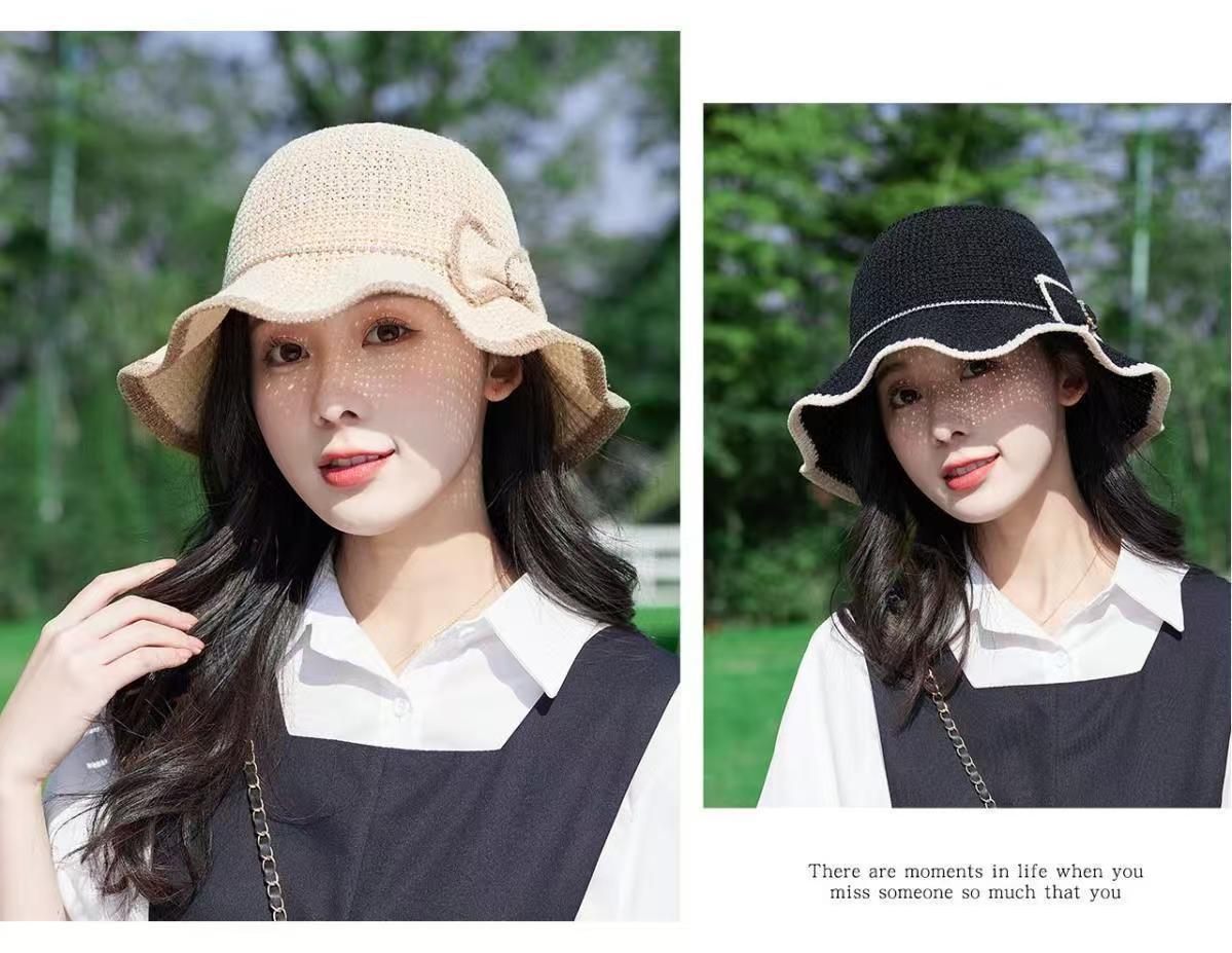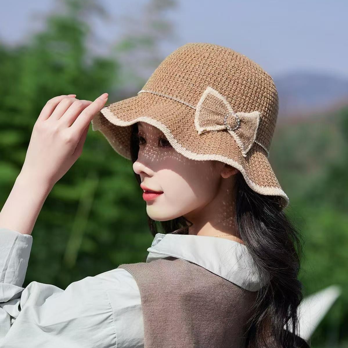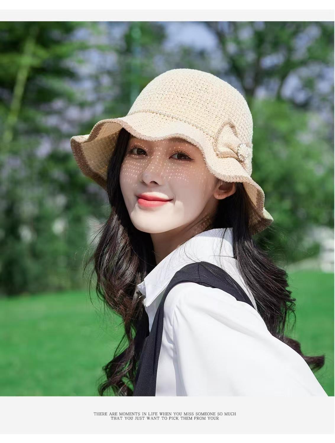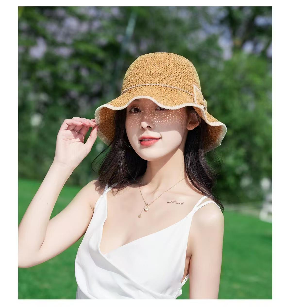 荷叶边镂空渔夫帽女新款夏季时尚简约蝴蝶结遮阳可折叠防晒太阳帽