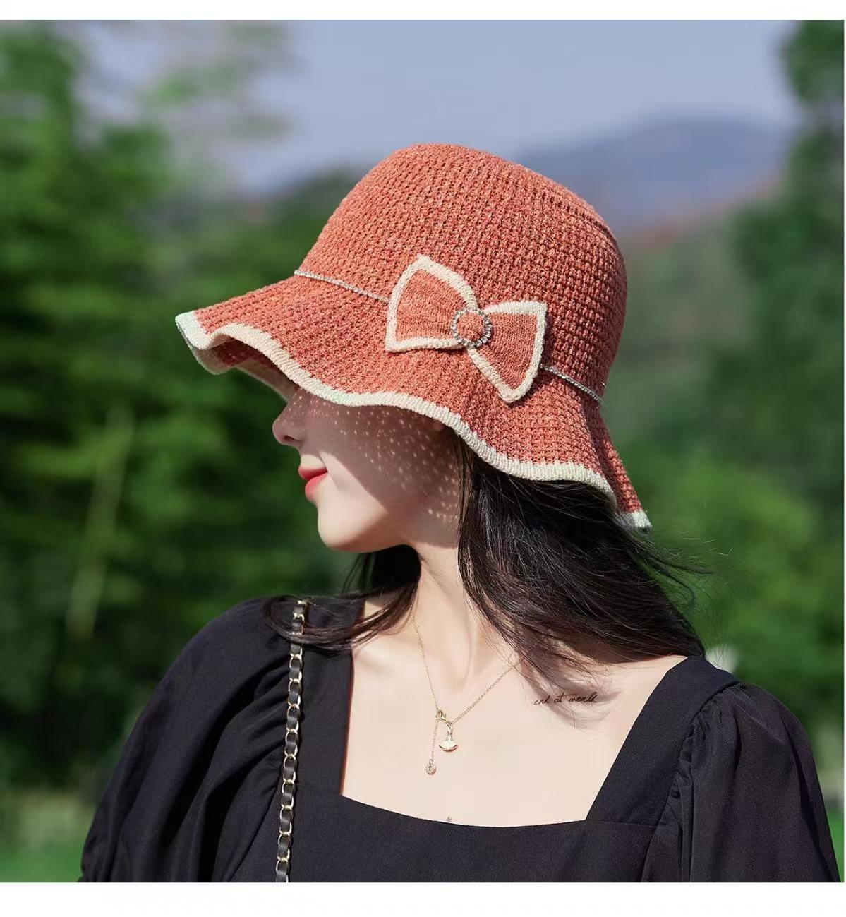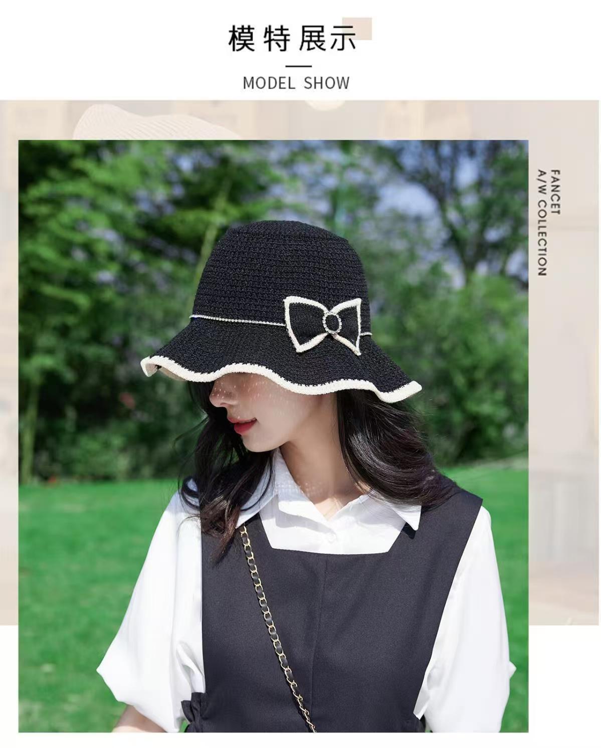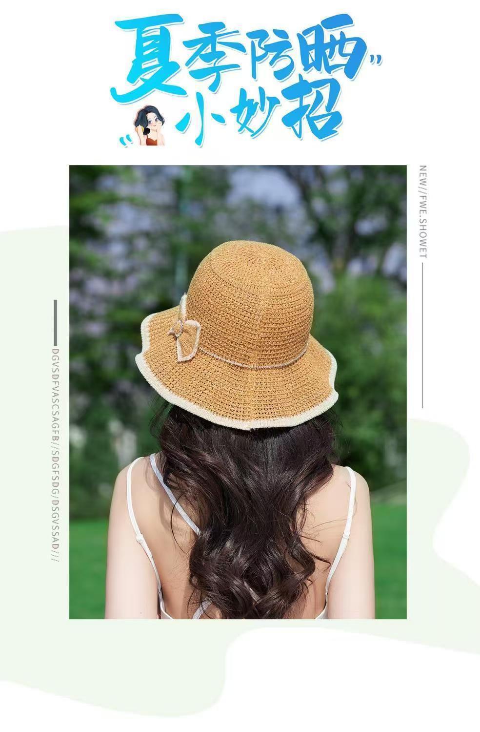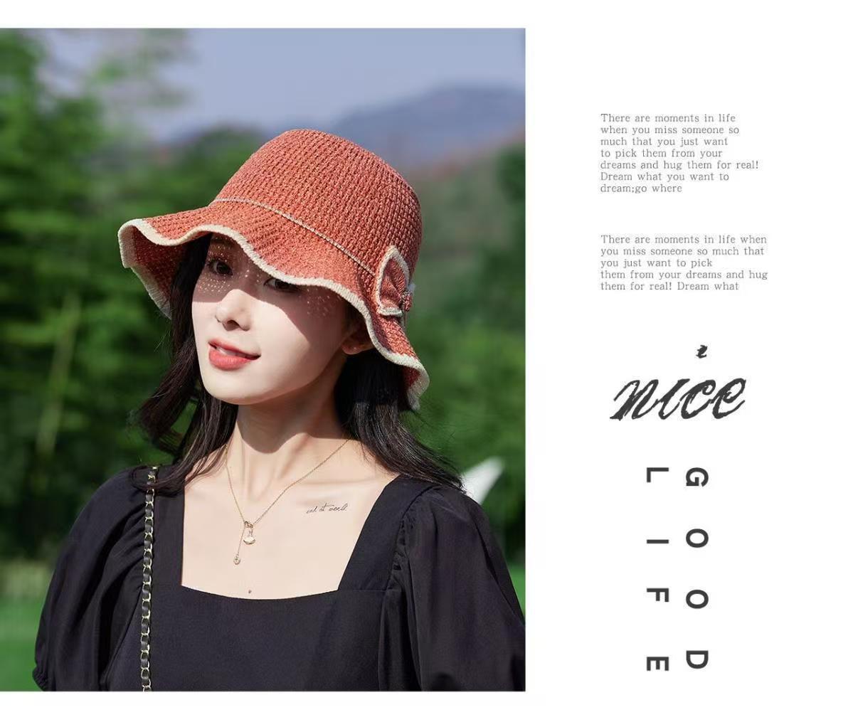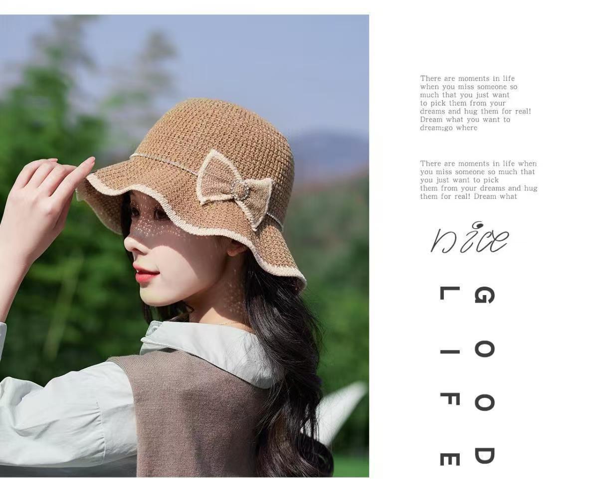 荷叶边镂空渔夫帽女新款夏季时尚简约蝴蝶结遮阳可折叠防晒太阳帽