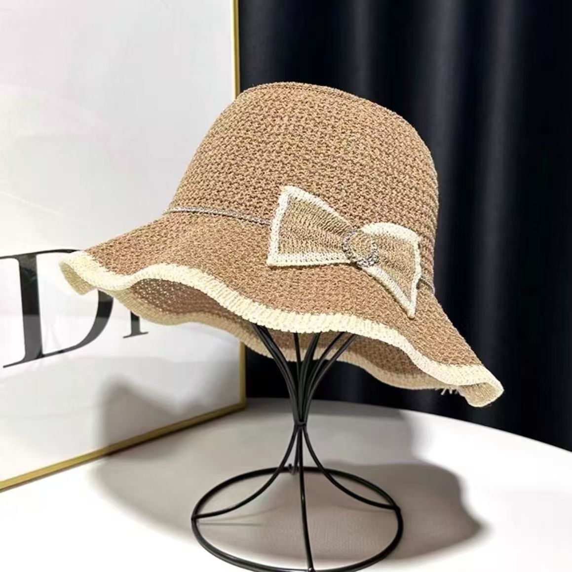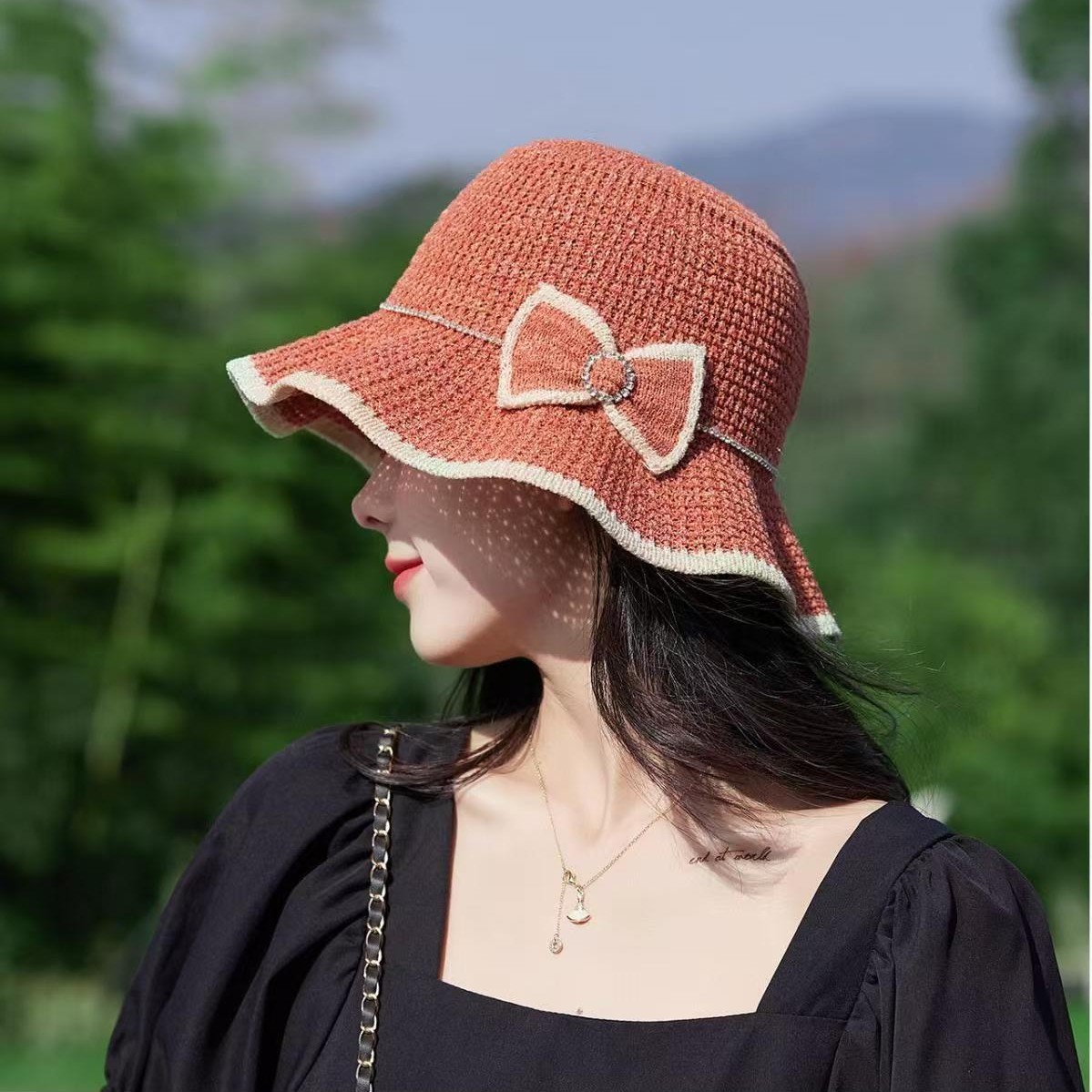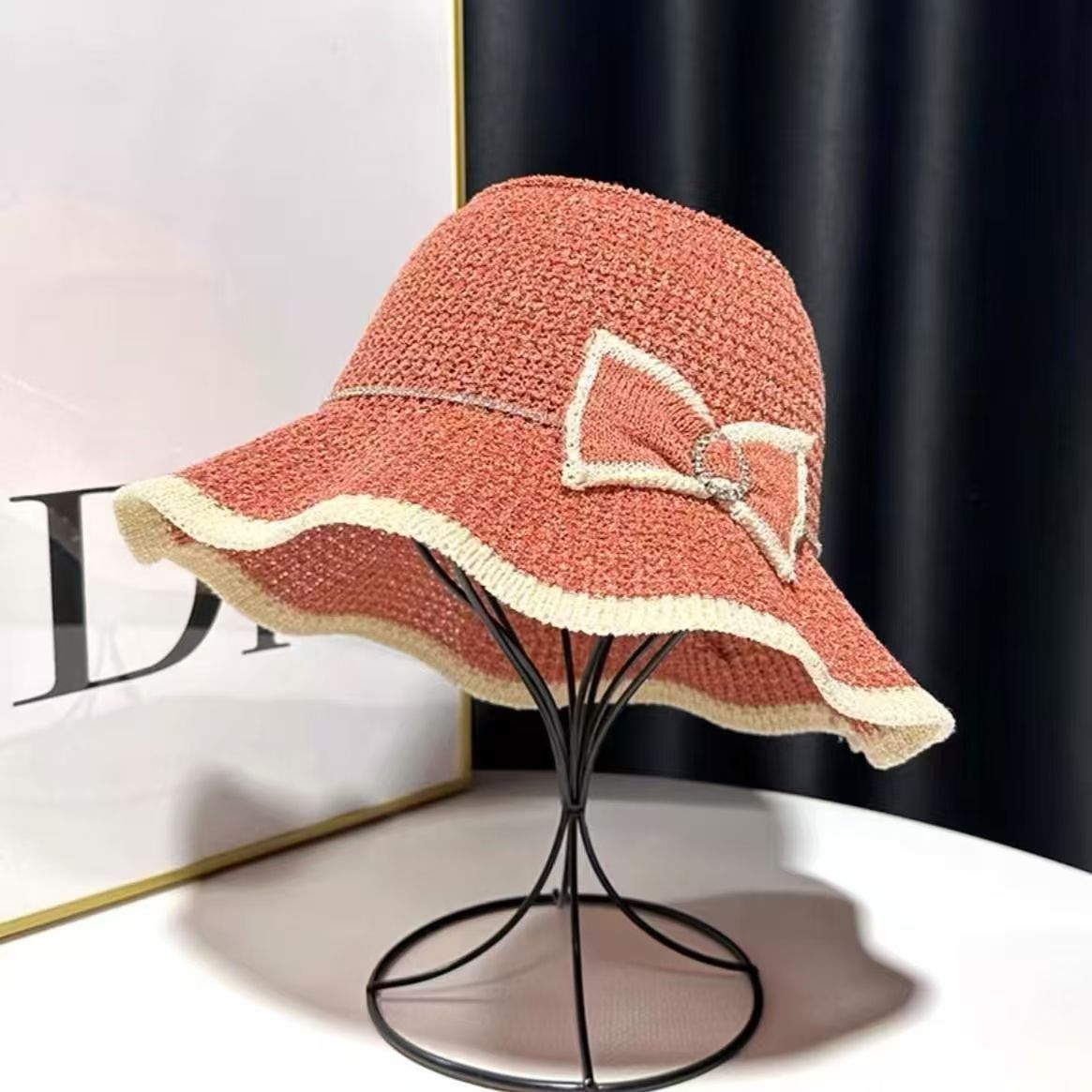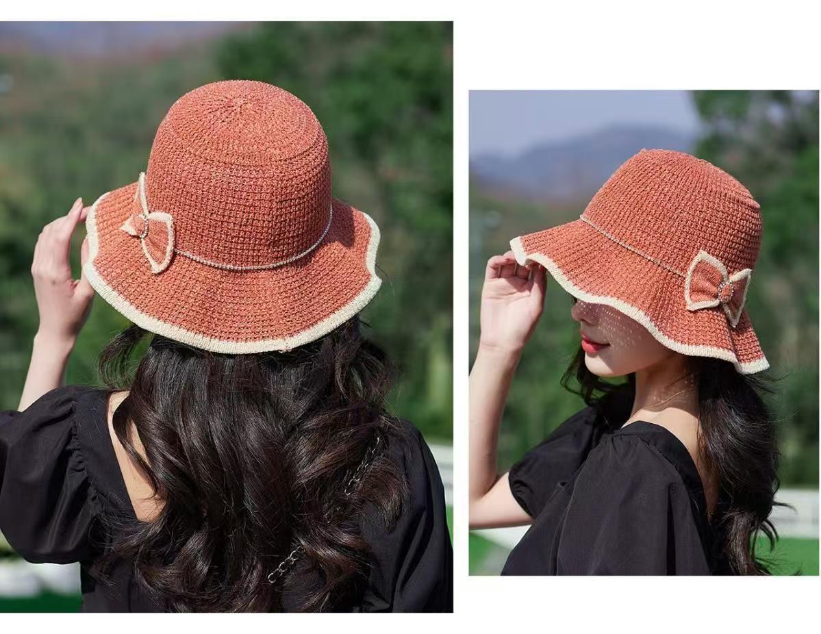 荷叶边镂空渔夫帽女新款夏季时尚简约蝴蝶结遮阳可折叠防晒太阳帽