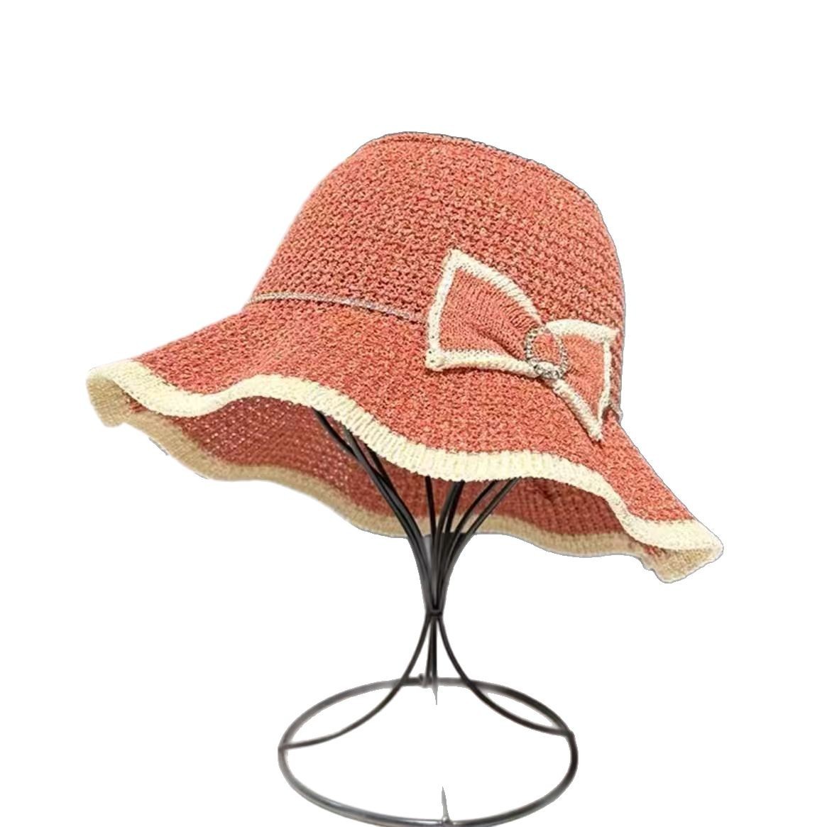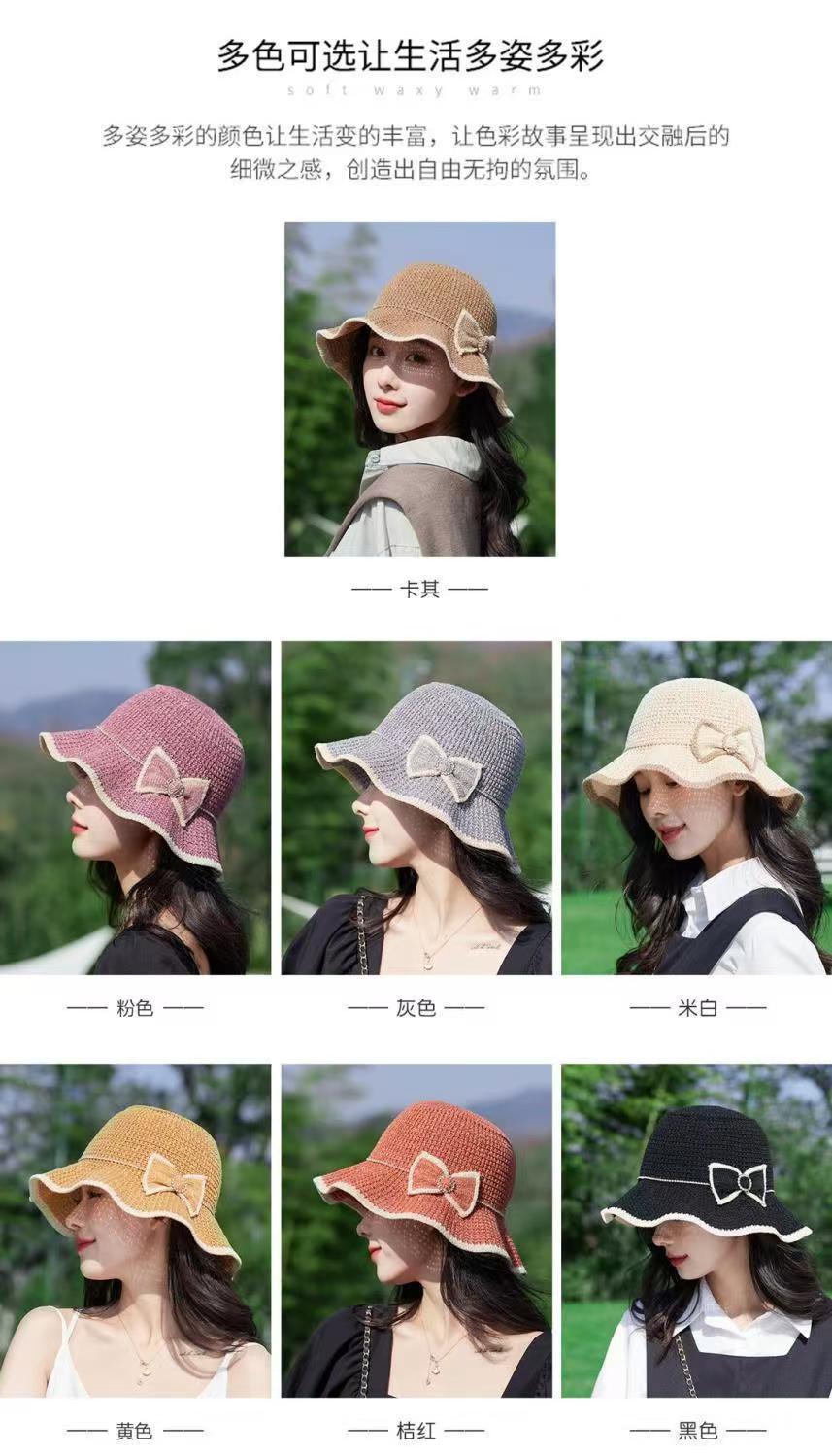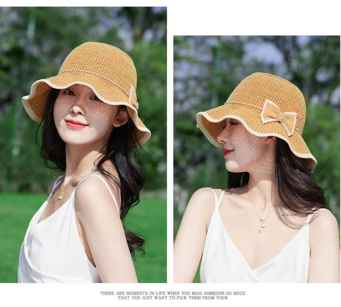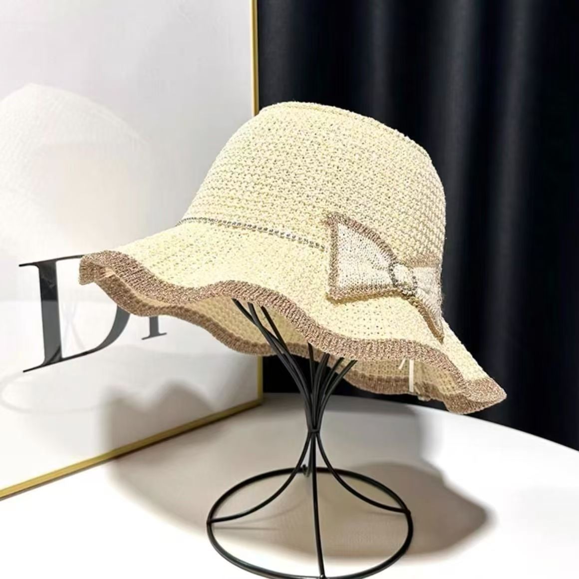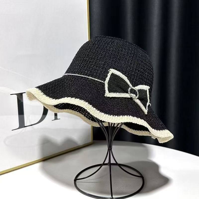 荷叶边镂空渔夫帽女新款夏季时尚简约蝴蝶结遮阳可折叠防晒太阳帽