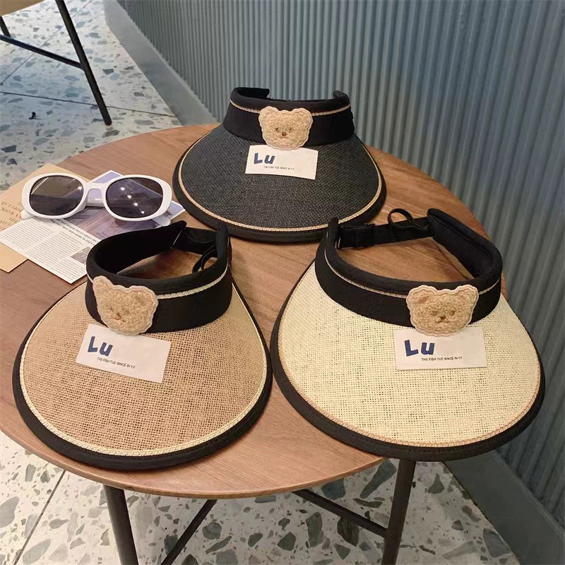 儿童遮阳帽可爱小熊草编太阳帽儿童空顶太阳帽户外防紫外发卡童帽