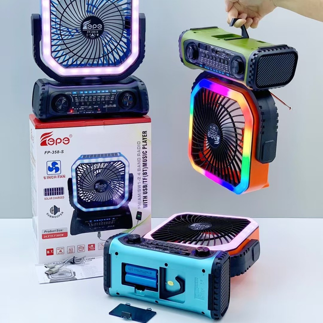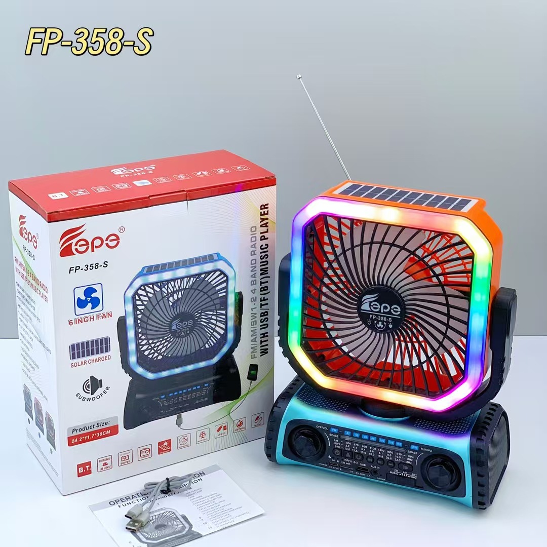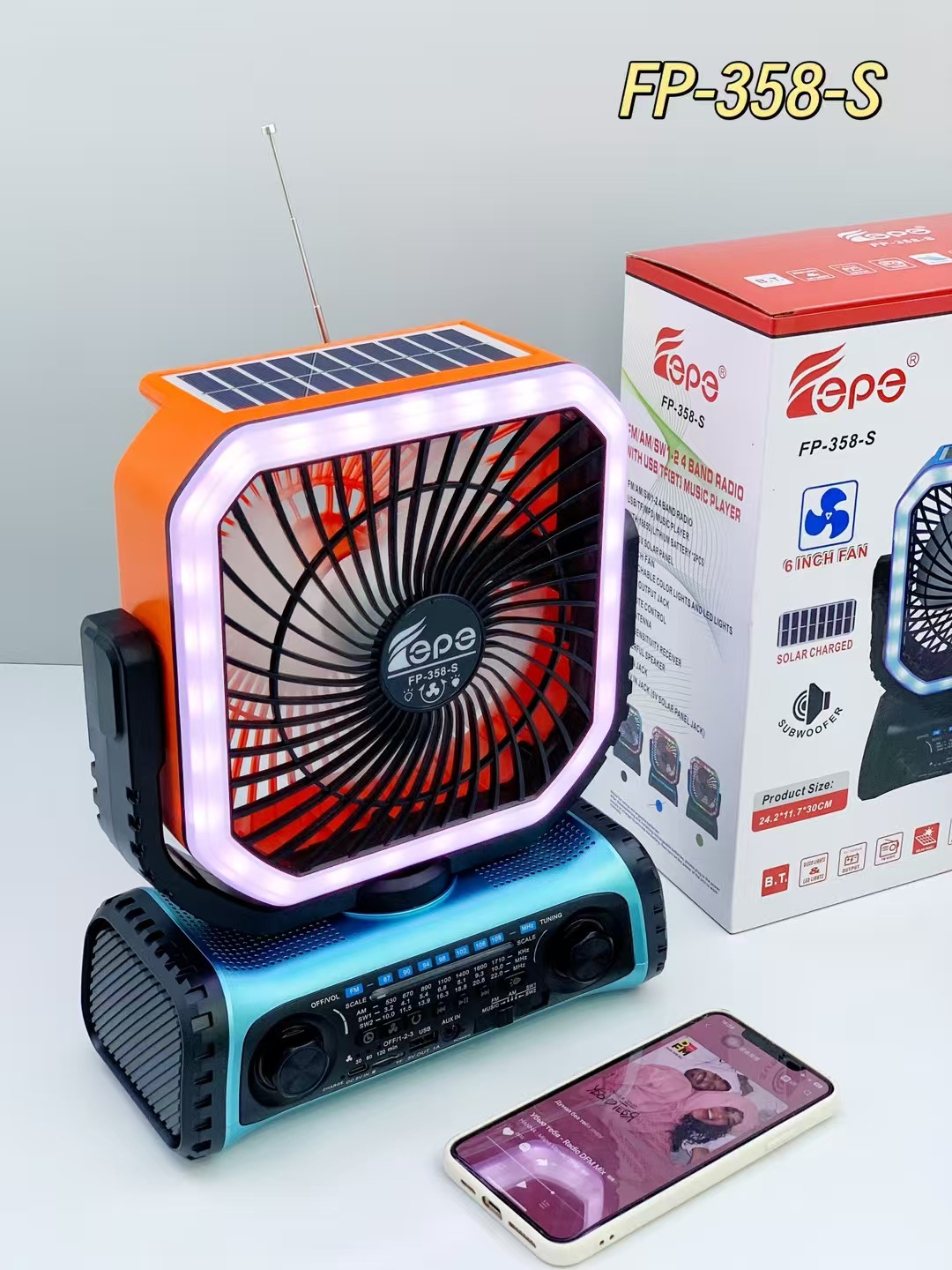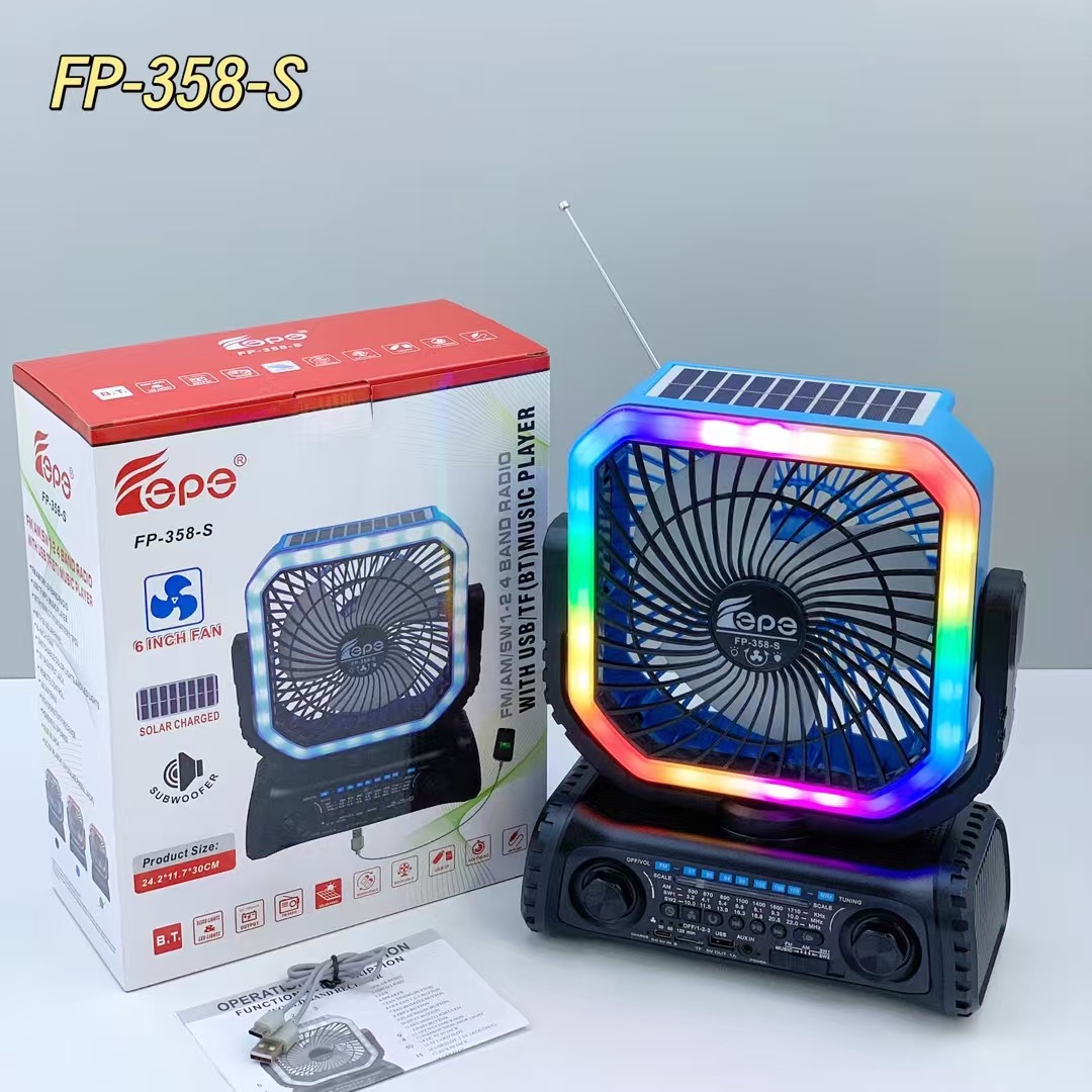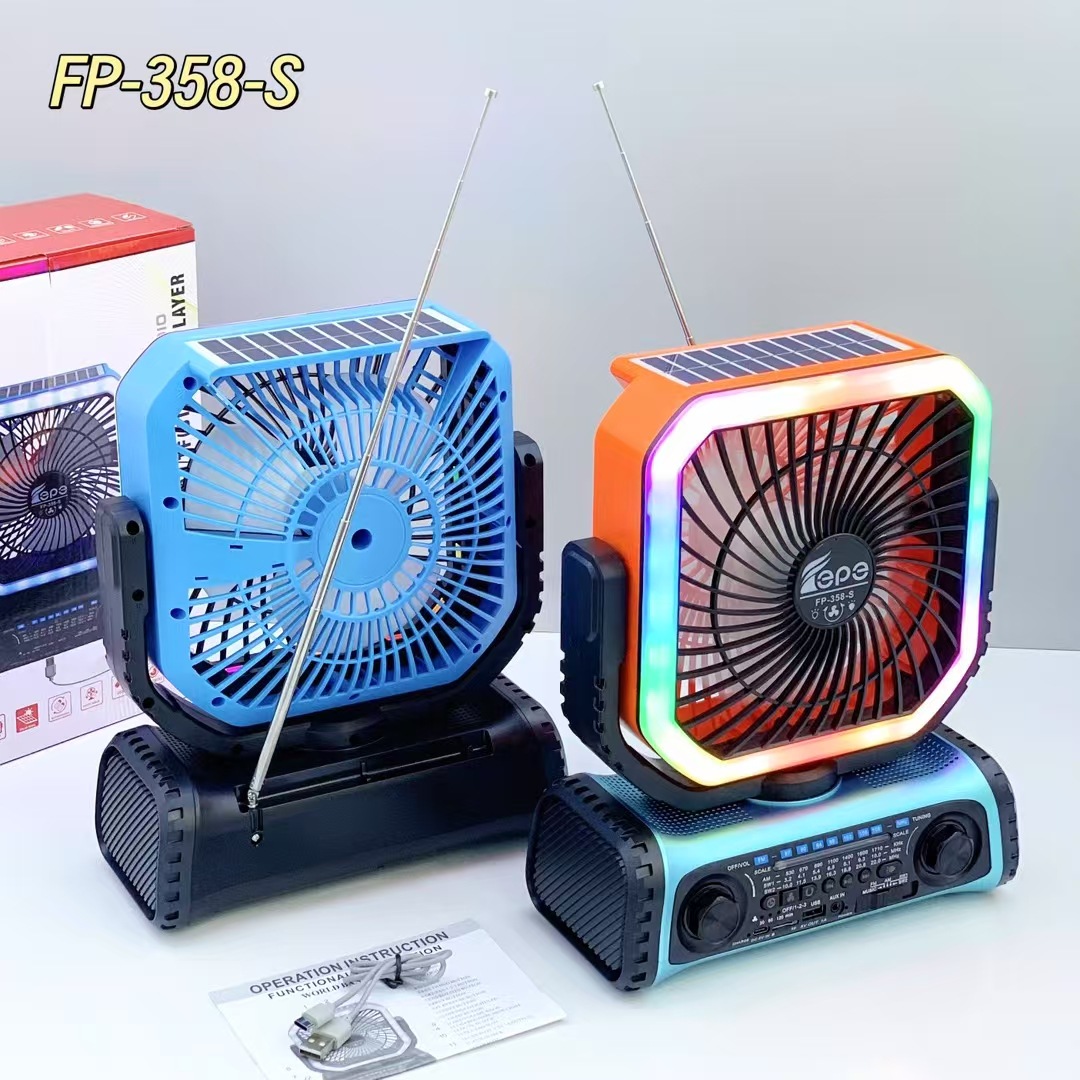 FP-358-S太阳能蓝牙音响便携旋转风扇FM/AM/SW多功能炫彩灯收音机
