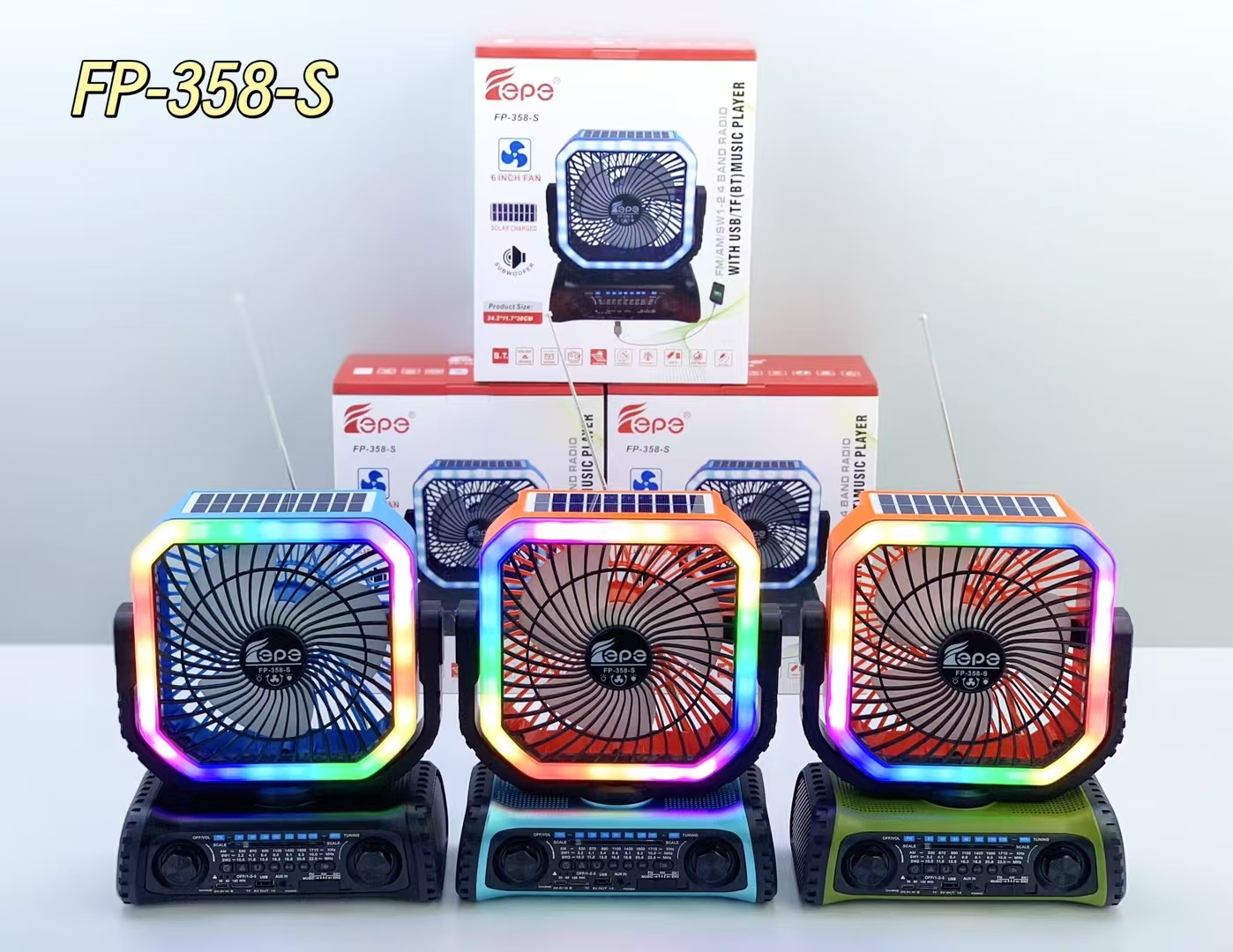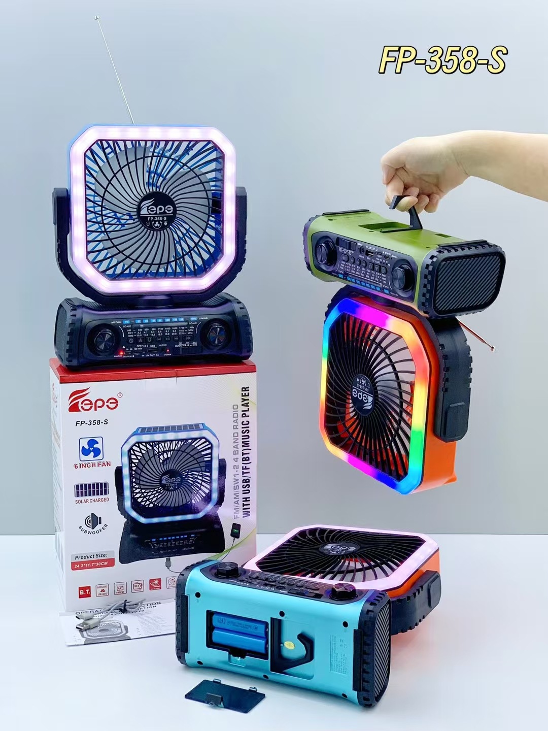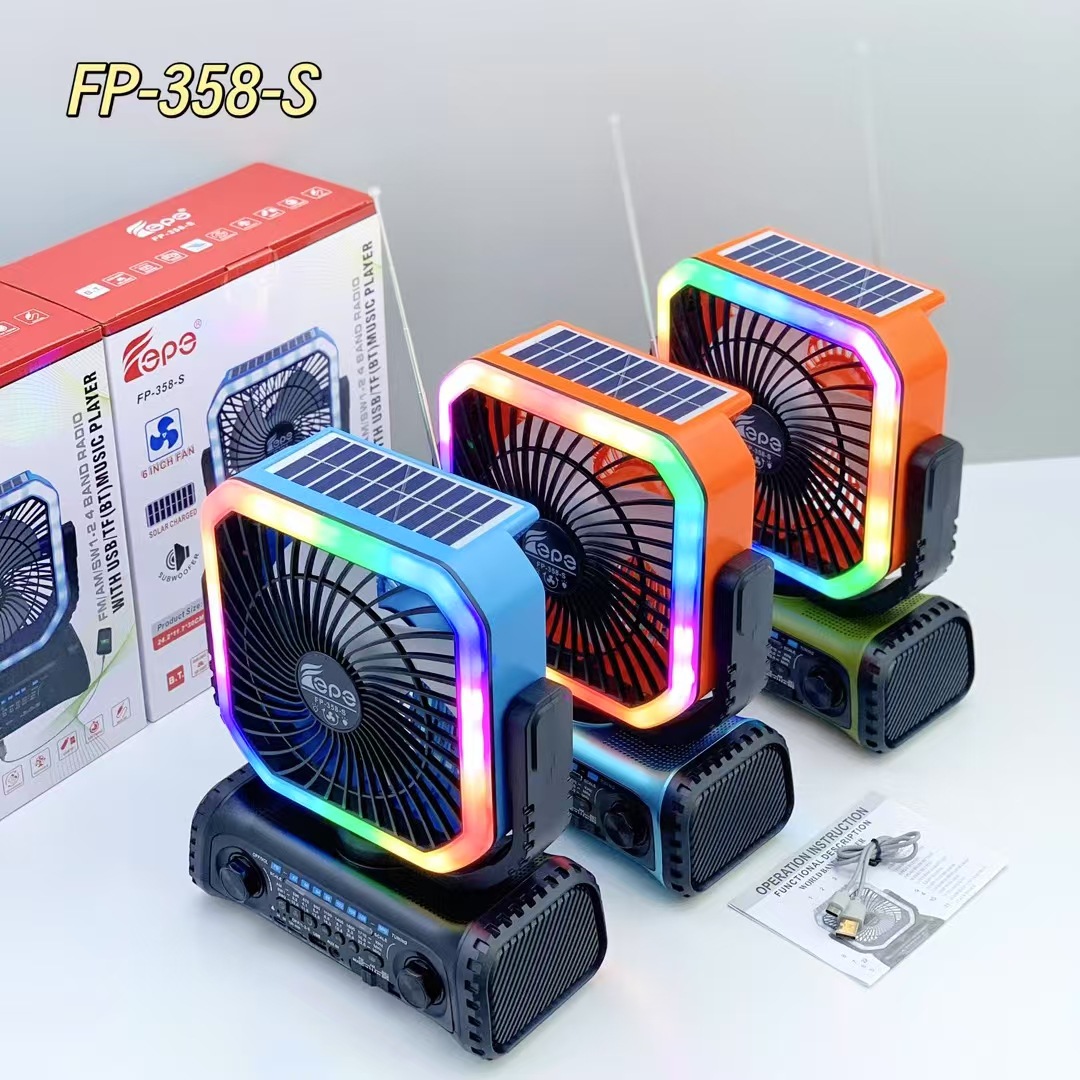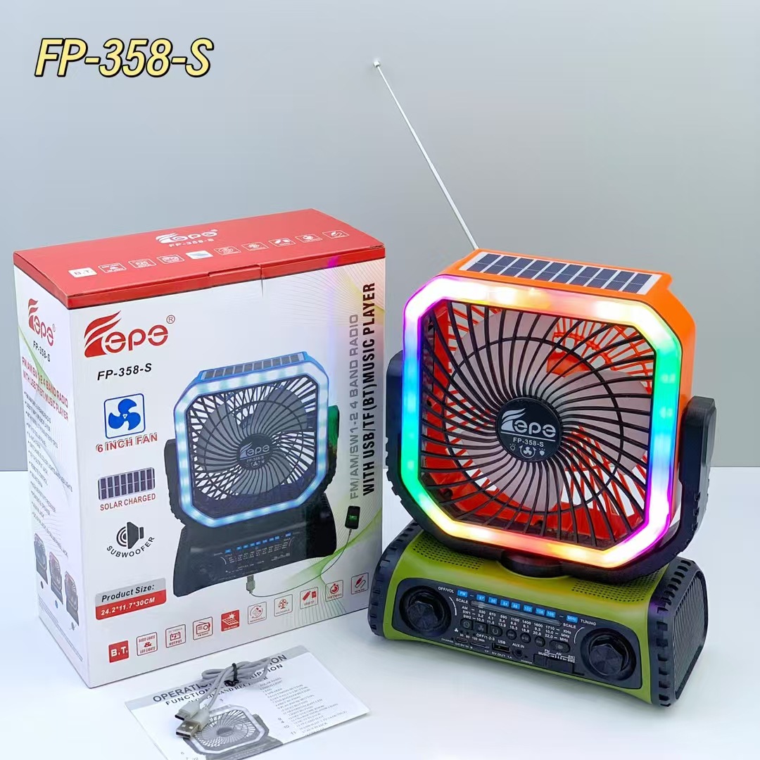 FP-358-S太阳能蓝牙音响便携旋转风扇FM/AM/SW多功能炫彩灯收音机