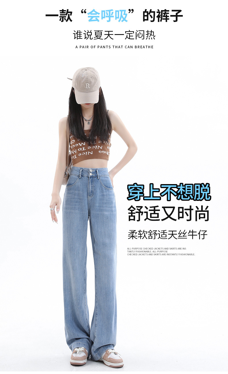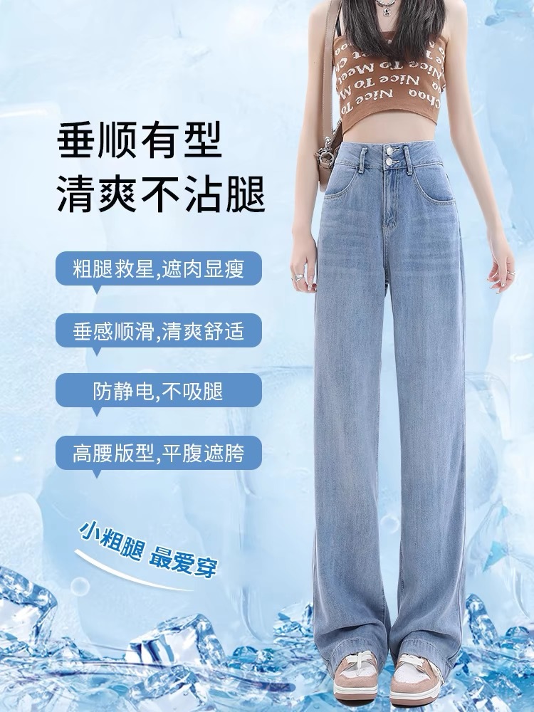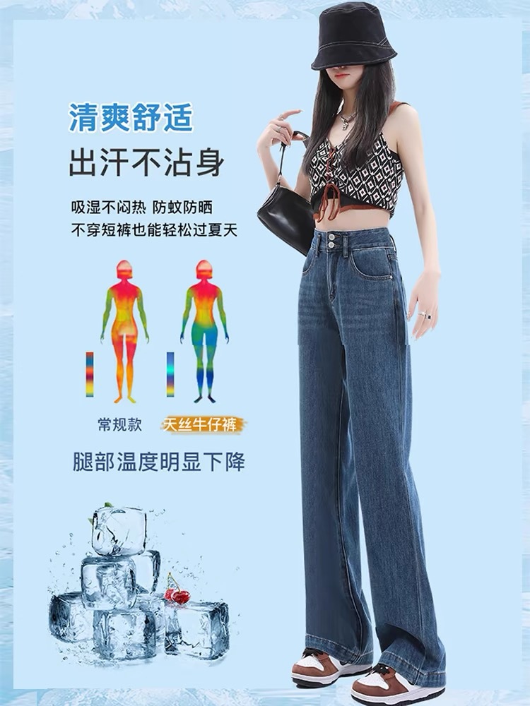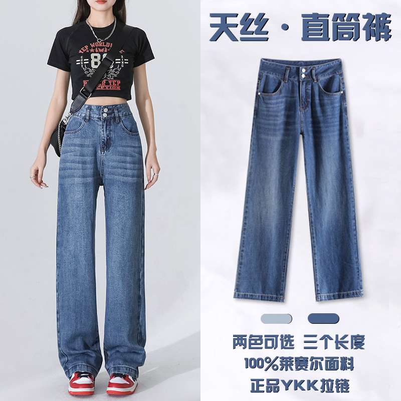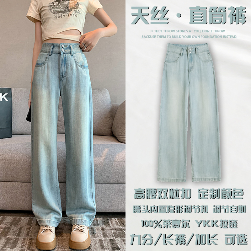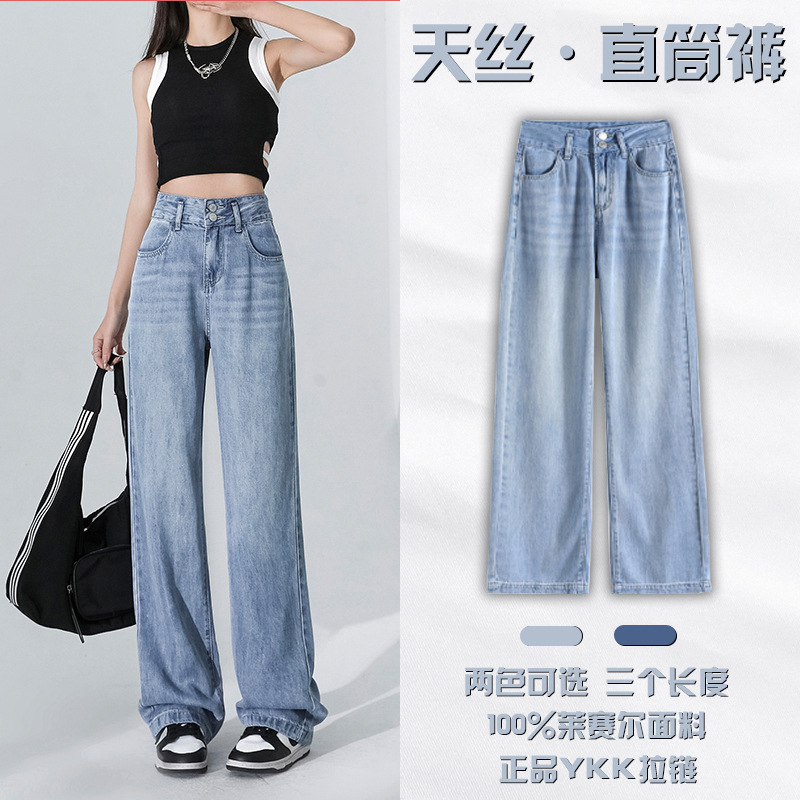 天丝牛仔裤女夏季薄款垂感小个子直筒莱赛尔浅蓝色冰丝窄版阔腿裤