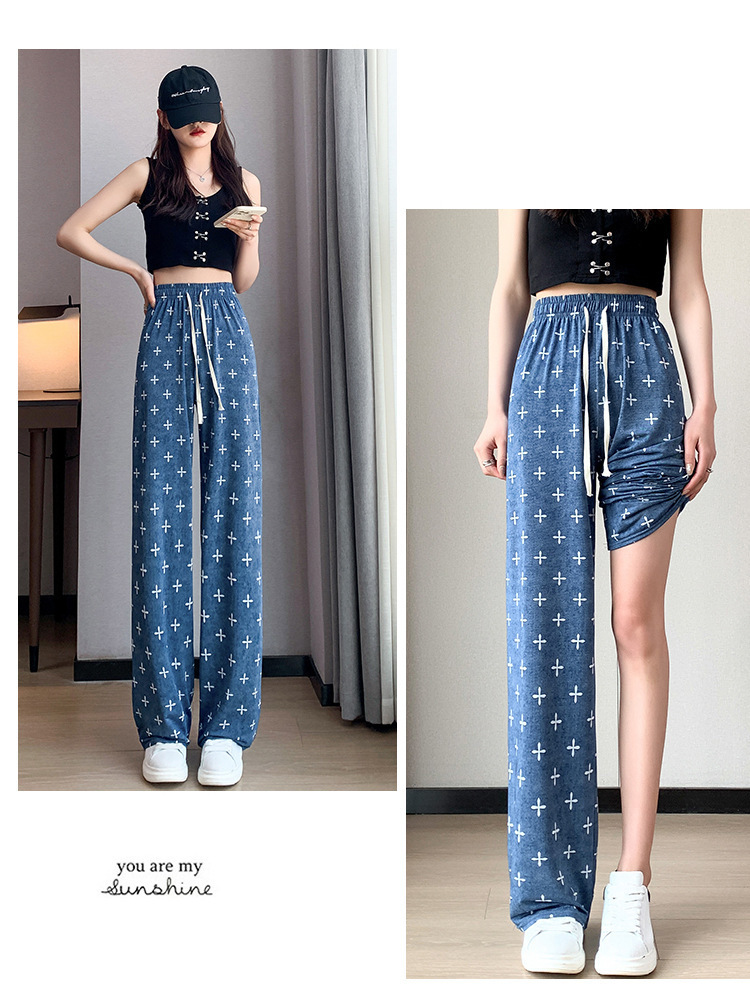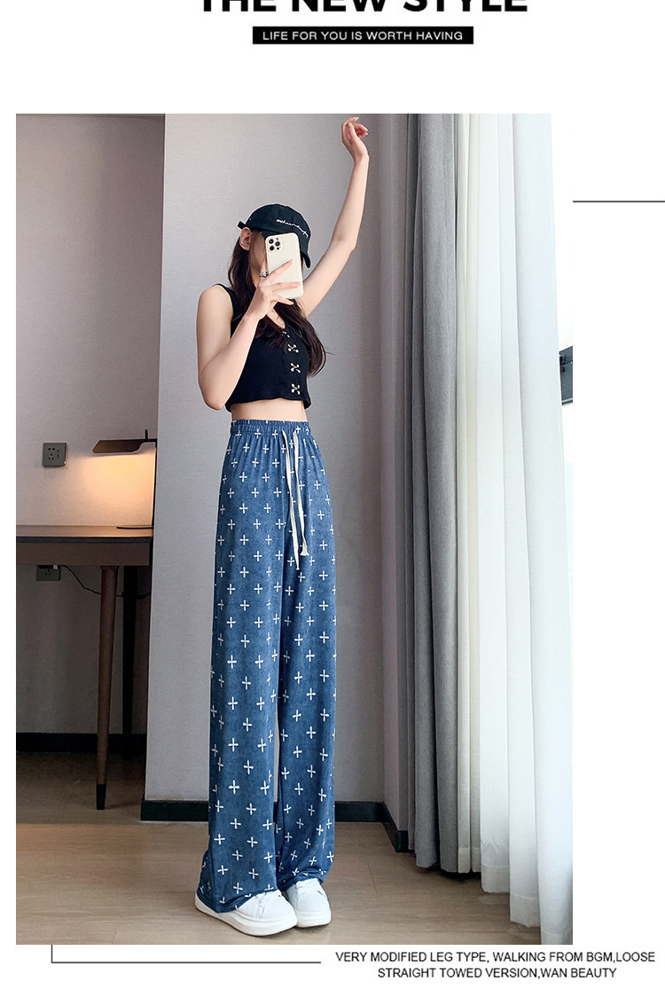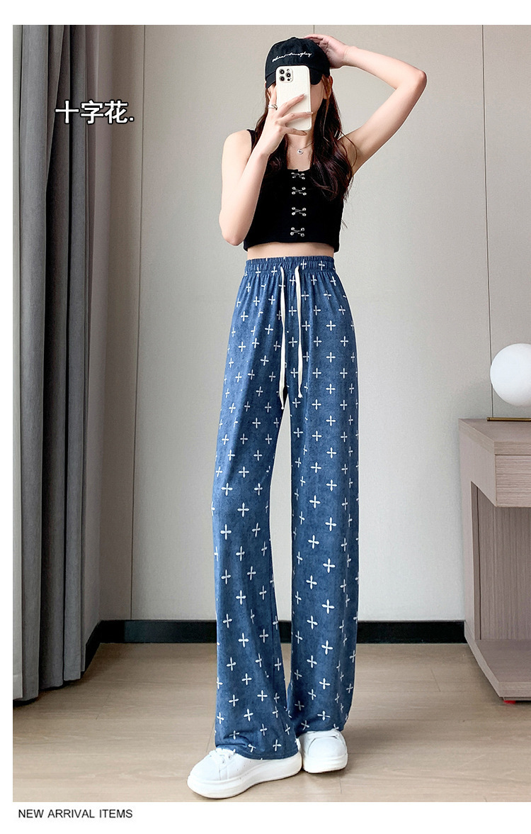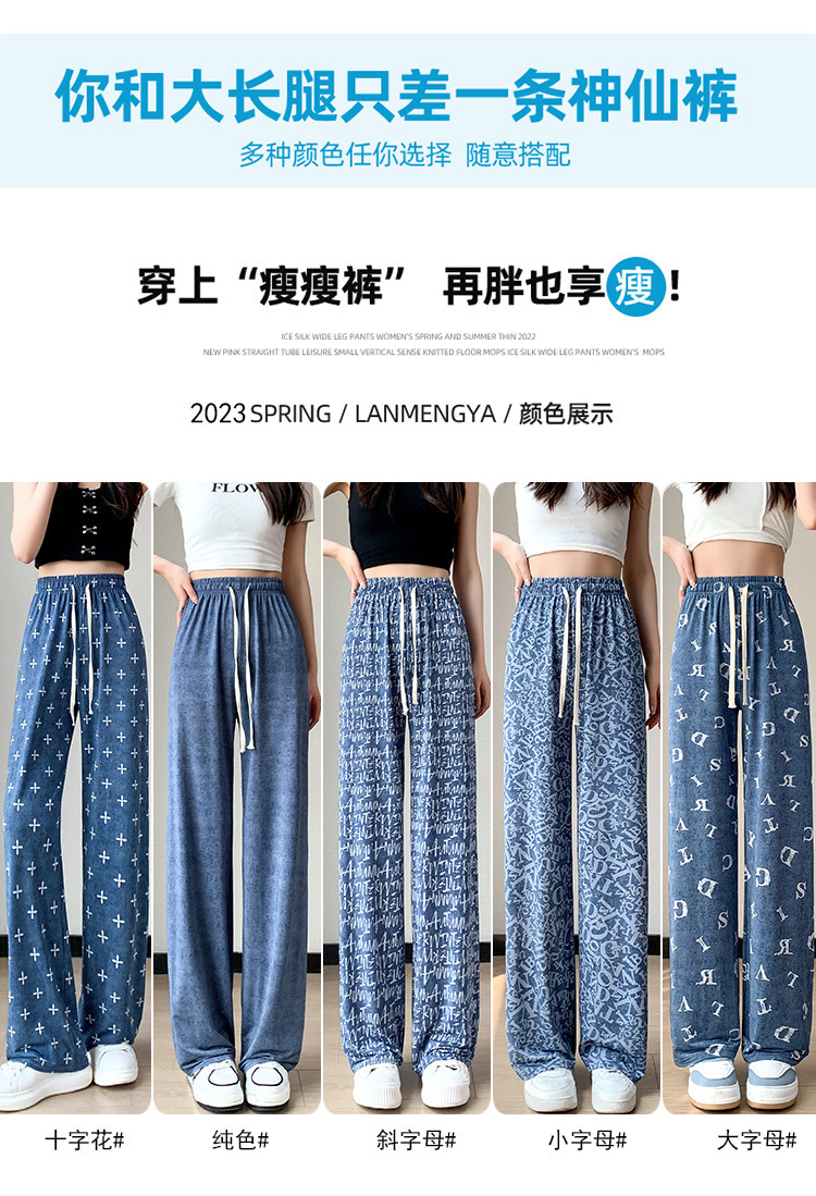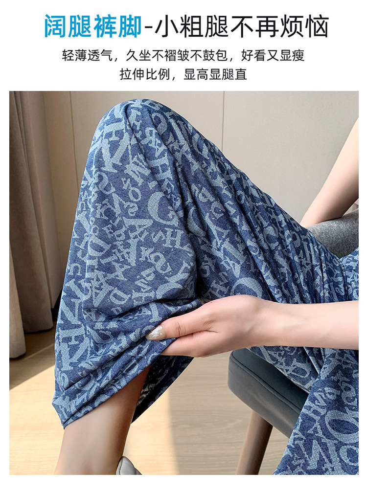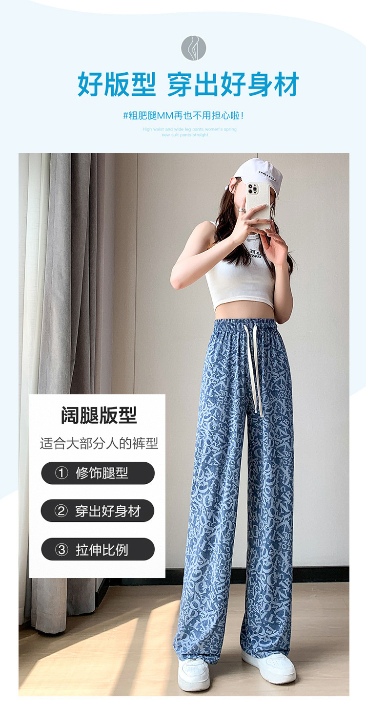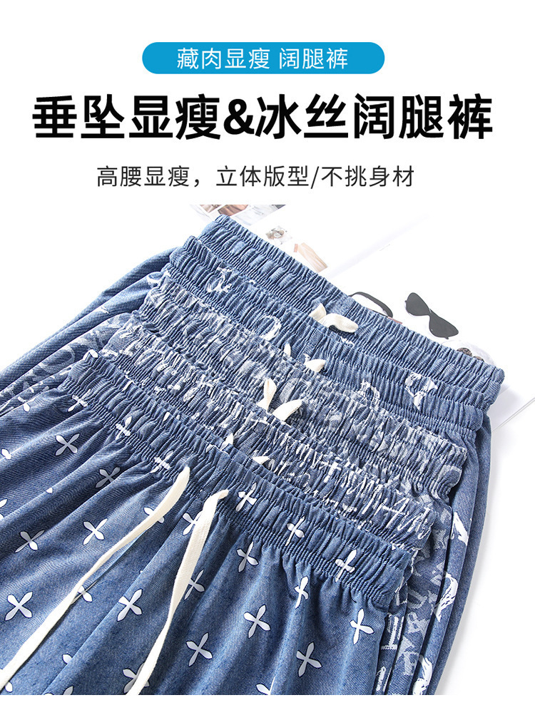 冰丝牛仔阔腿裤夏天丝女印花薄款休闲裤高腰宽松高腰垂感拖地裤
