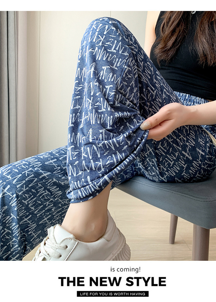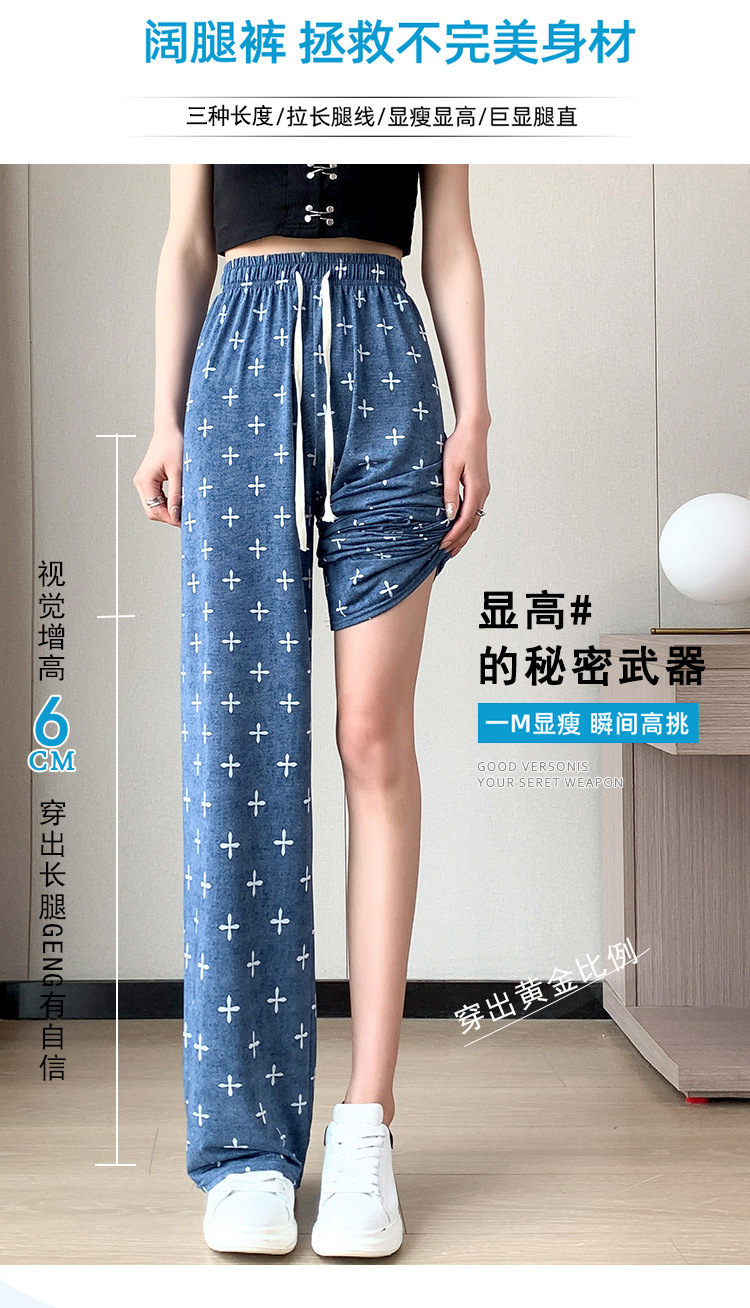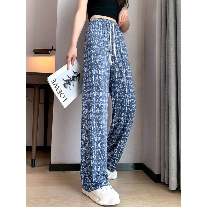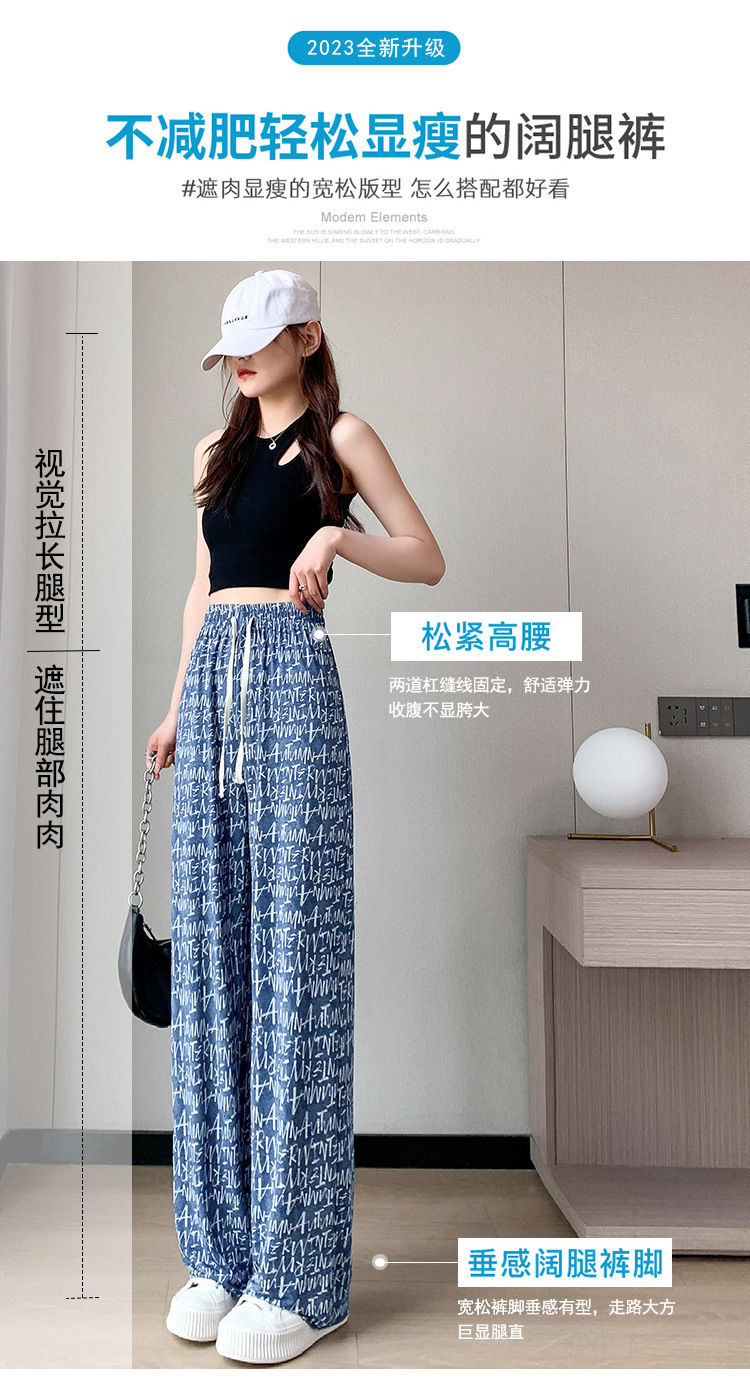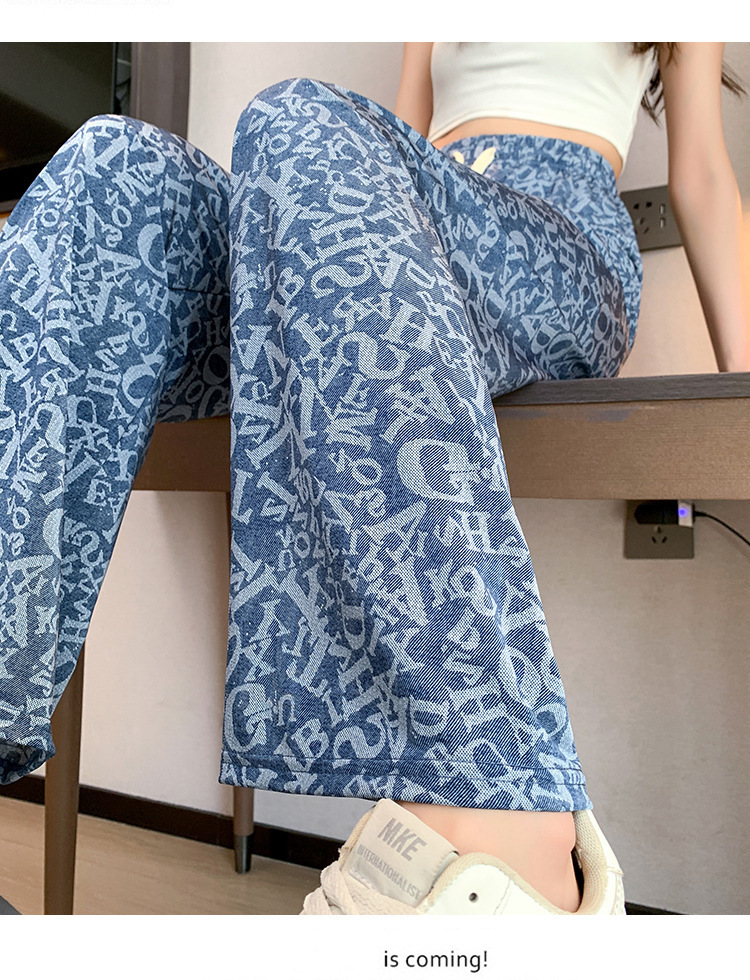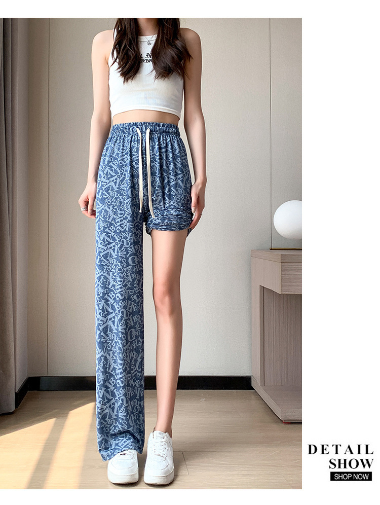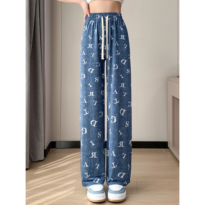冰丝牛仔阔腿裤夏天丝女印花薄款休闲裤高腰宽松高腰垂感拖地裤