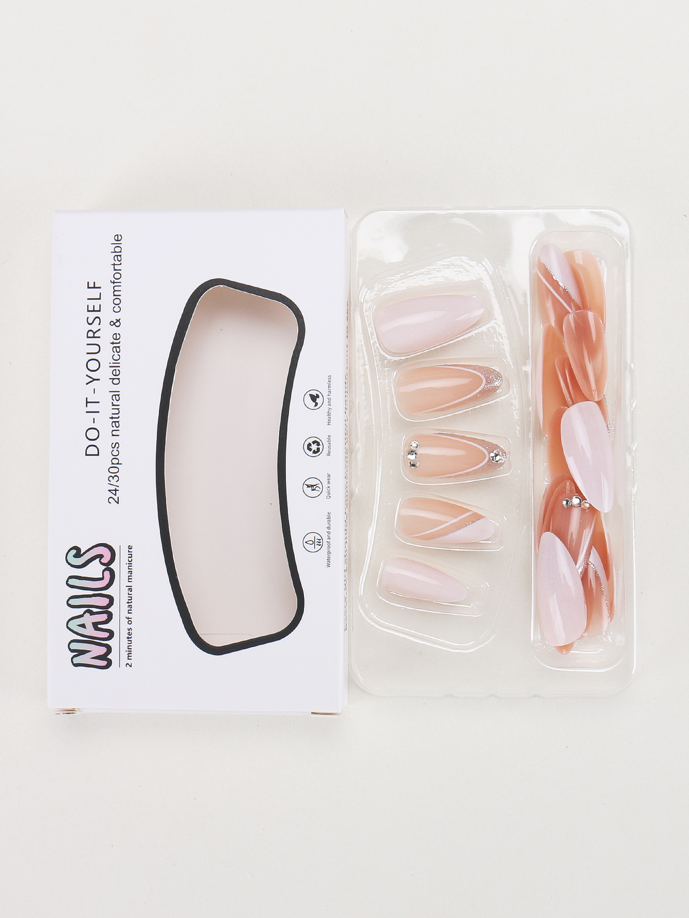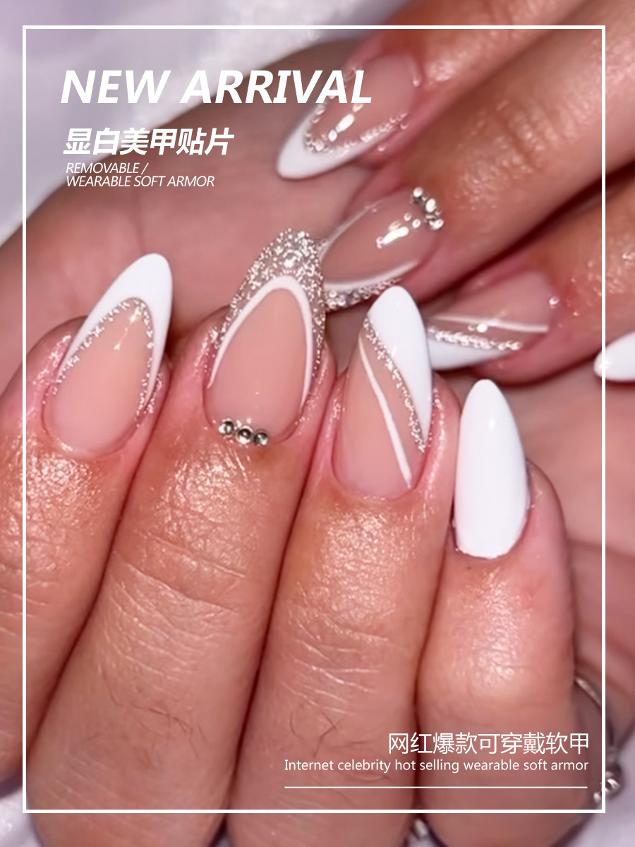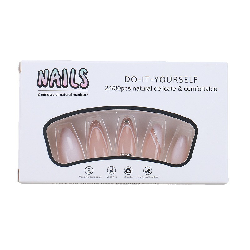 跨境热销穿戴甲中长水滴杏仁型法式闪粉线条假指甲可拆卸美甲甲片