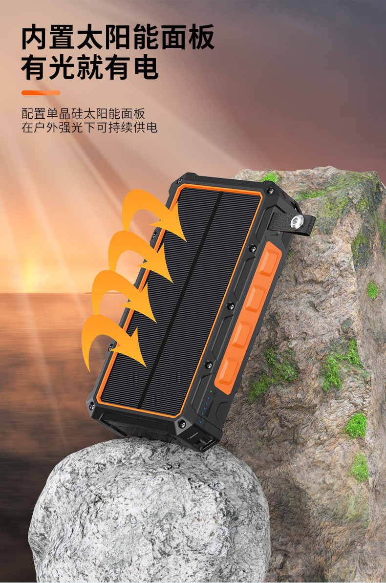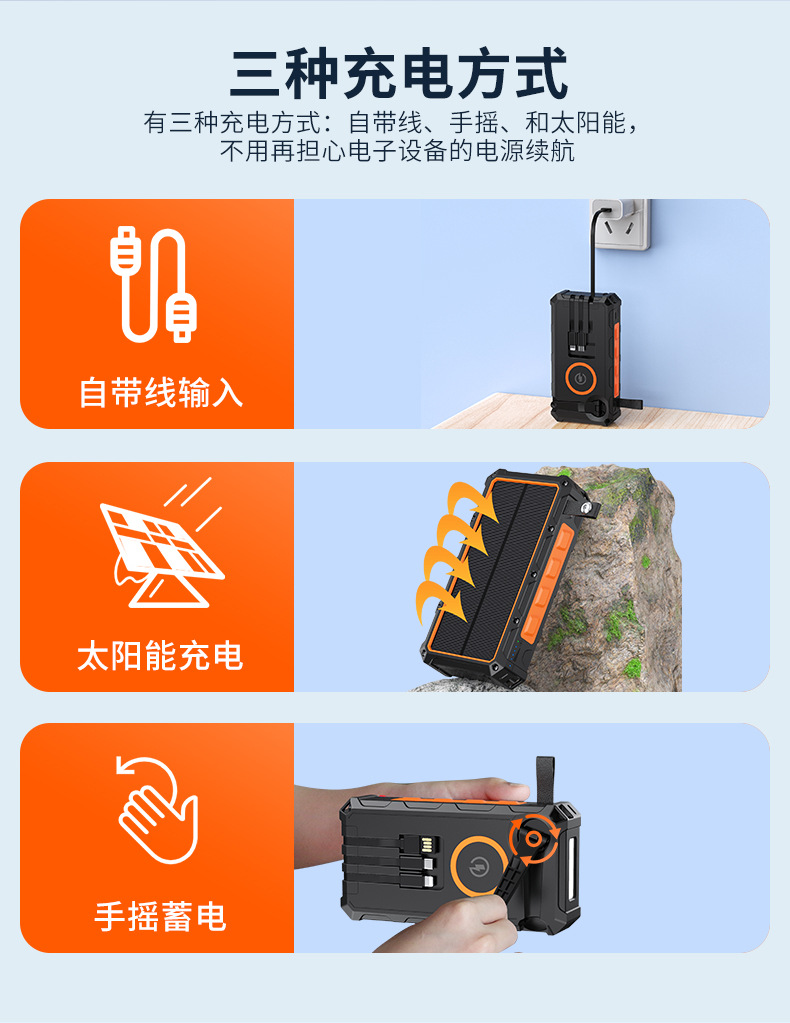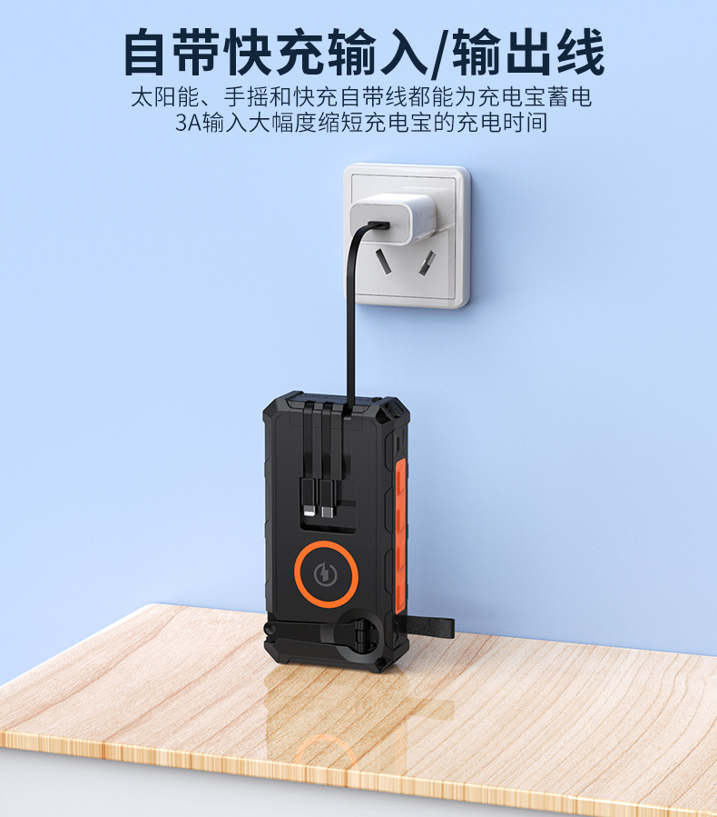 爆款私模手摇太阳能移动电源20000毫安自带线无线充功能充电宝