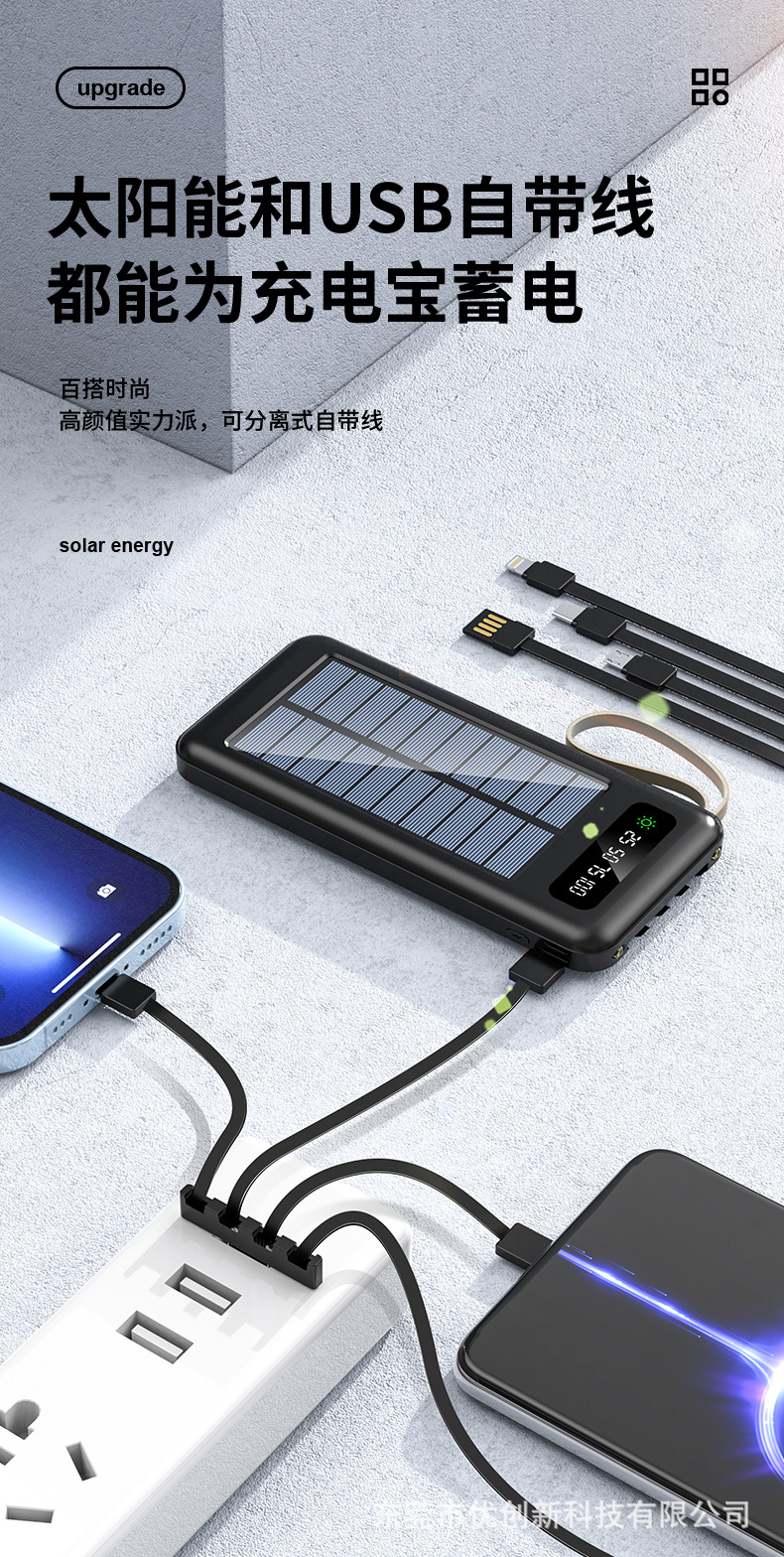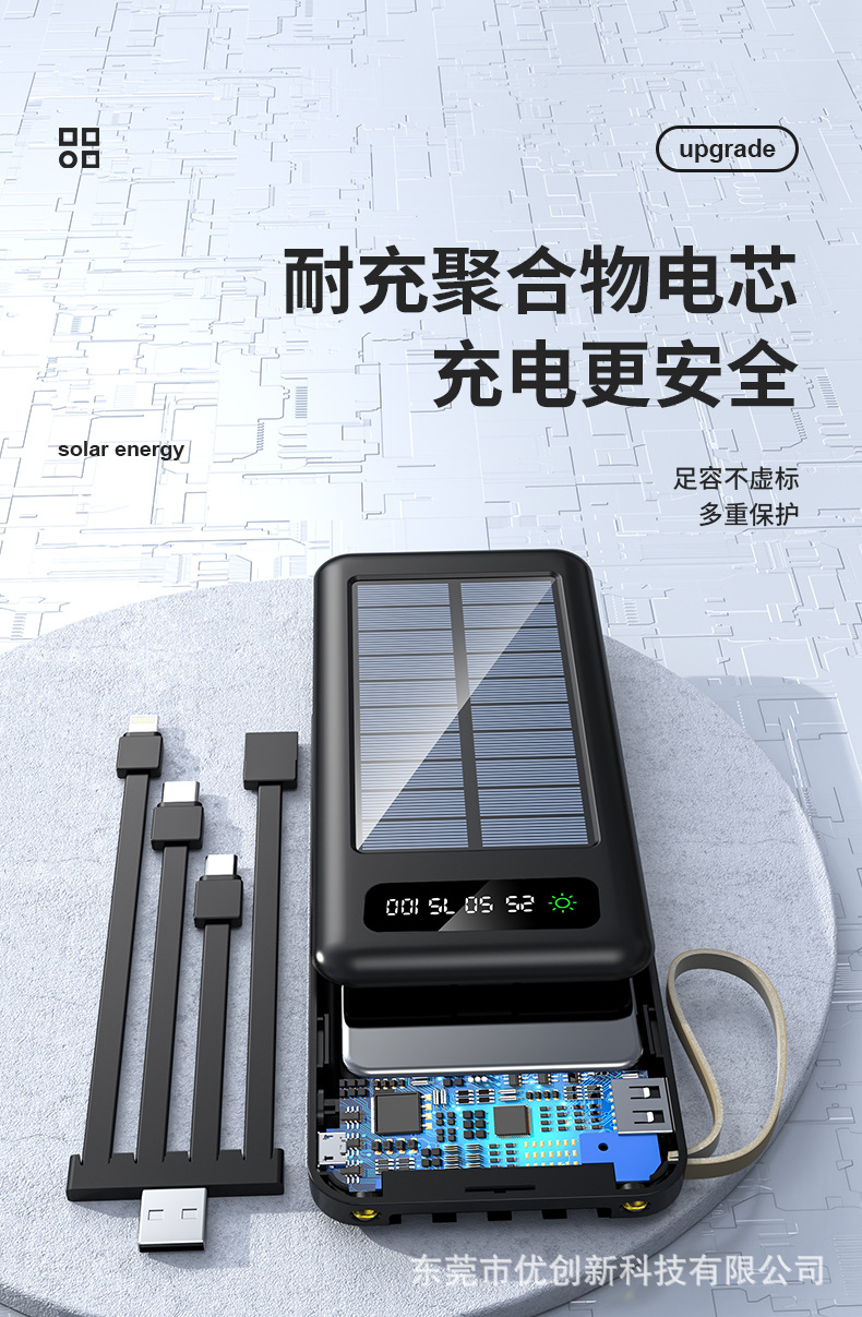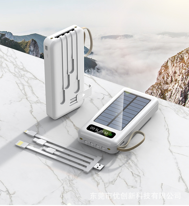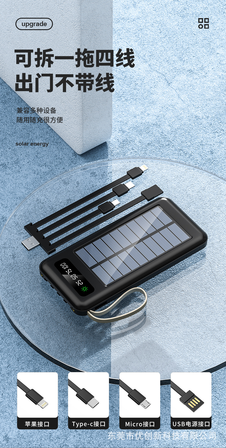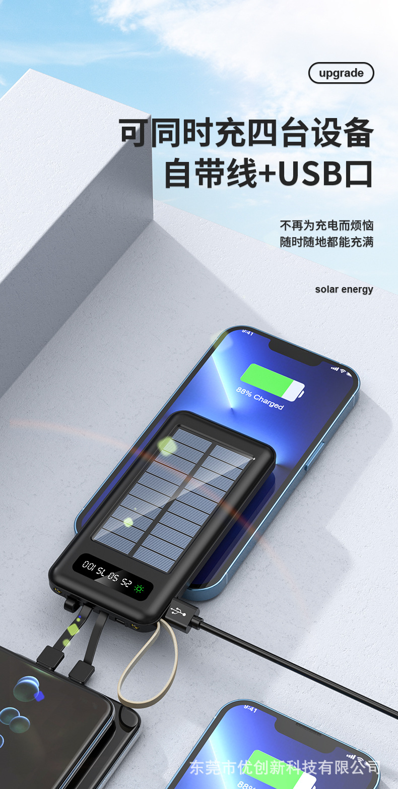跨境充电宝20000毫安超薄可拆卸自带四线太阳能移动电源礼品印制